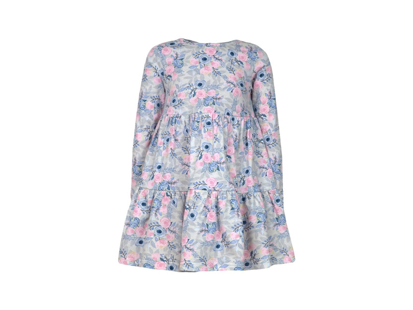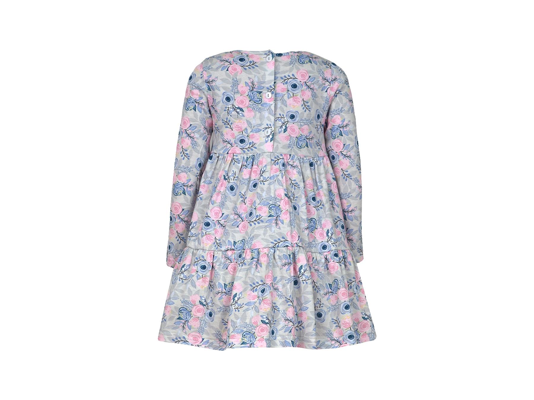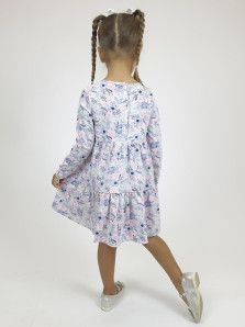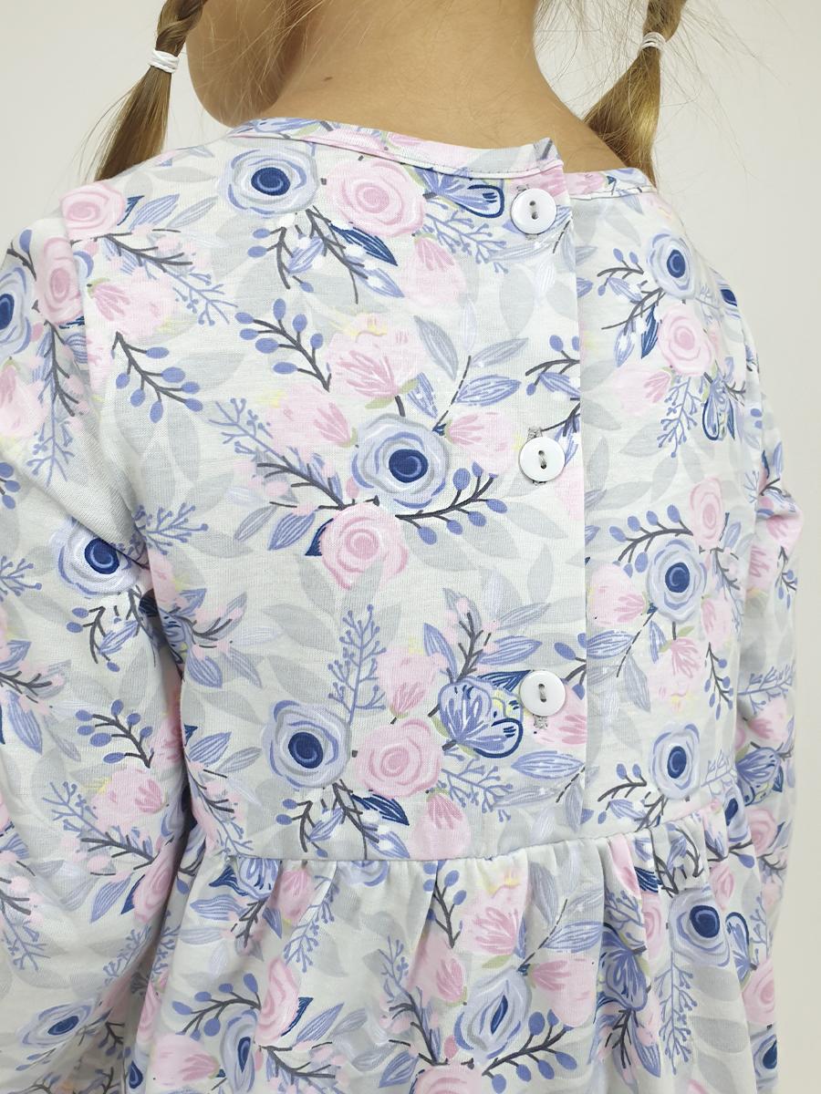 Кулирное полотно:100% х/б. Платье-силуэт трапеция,длинный втачной рукав.Юбка отрезная из двух воланов.Застежка по спинке,на пуговицы.Горловина окантована.