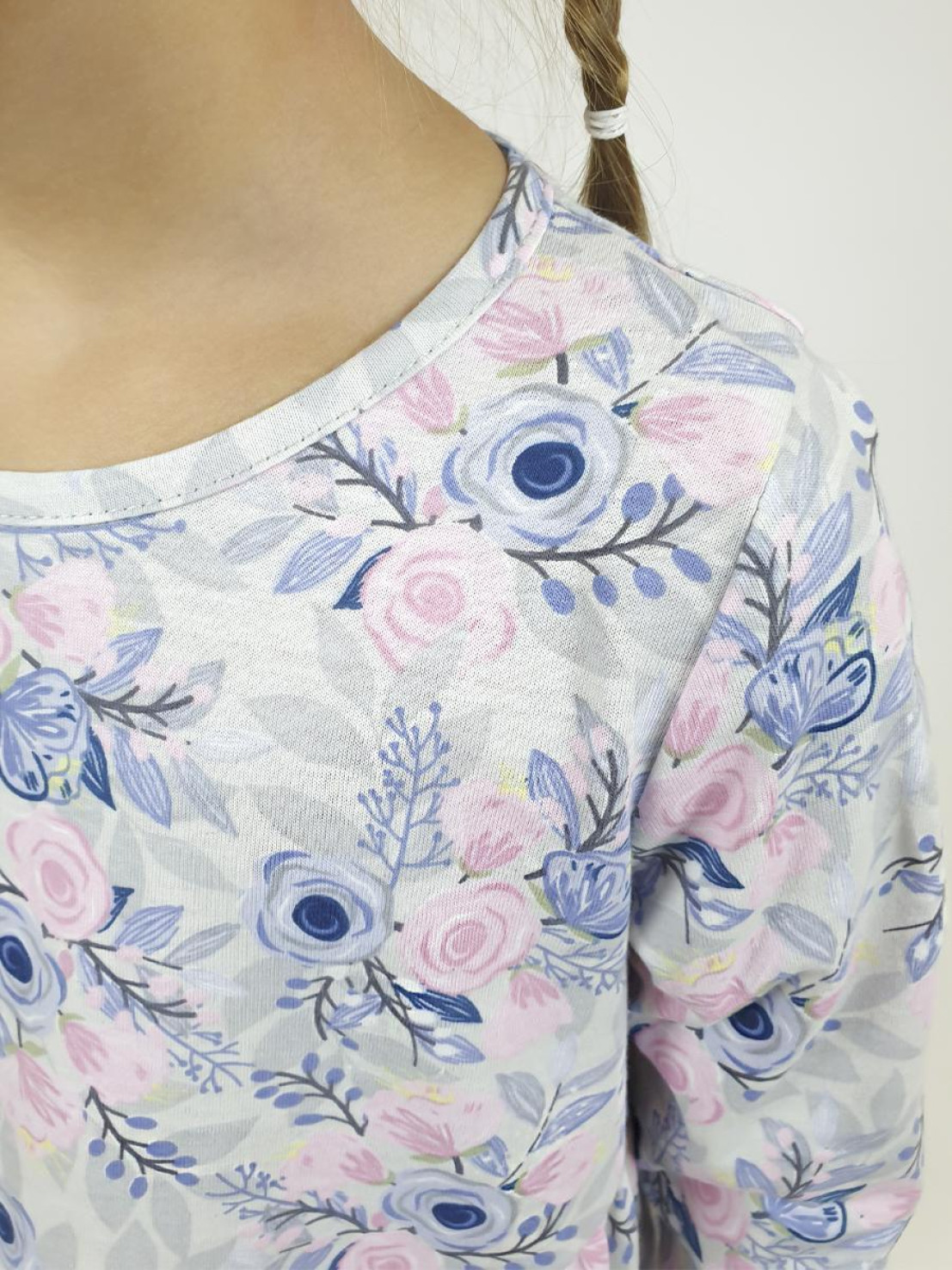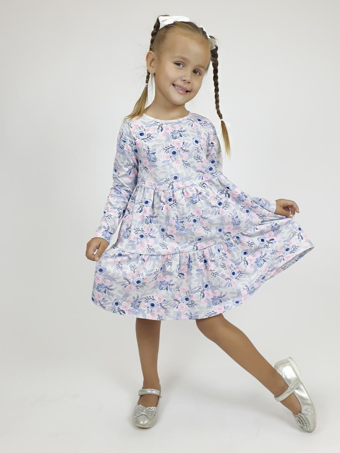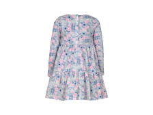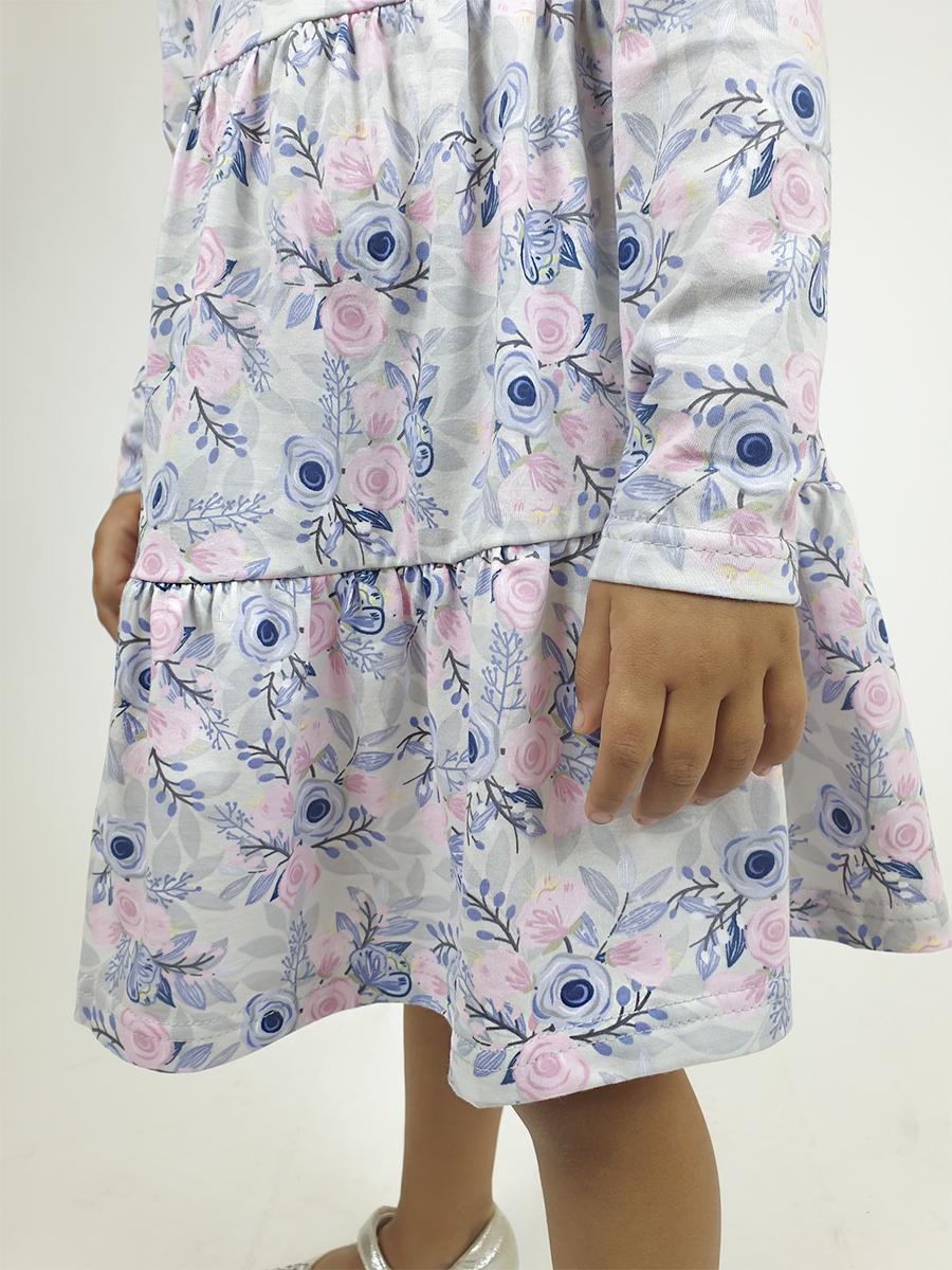 Кулирное полотно:100% х/б. Платье-силуэт трапеция,длинный втачной рукав.Юбка отрезная из двух воланов.Застежка по спинке,на пуговицы.Горловина окантована.