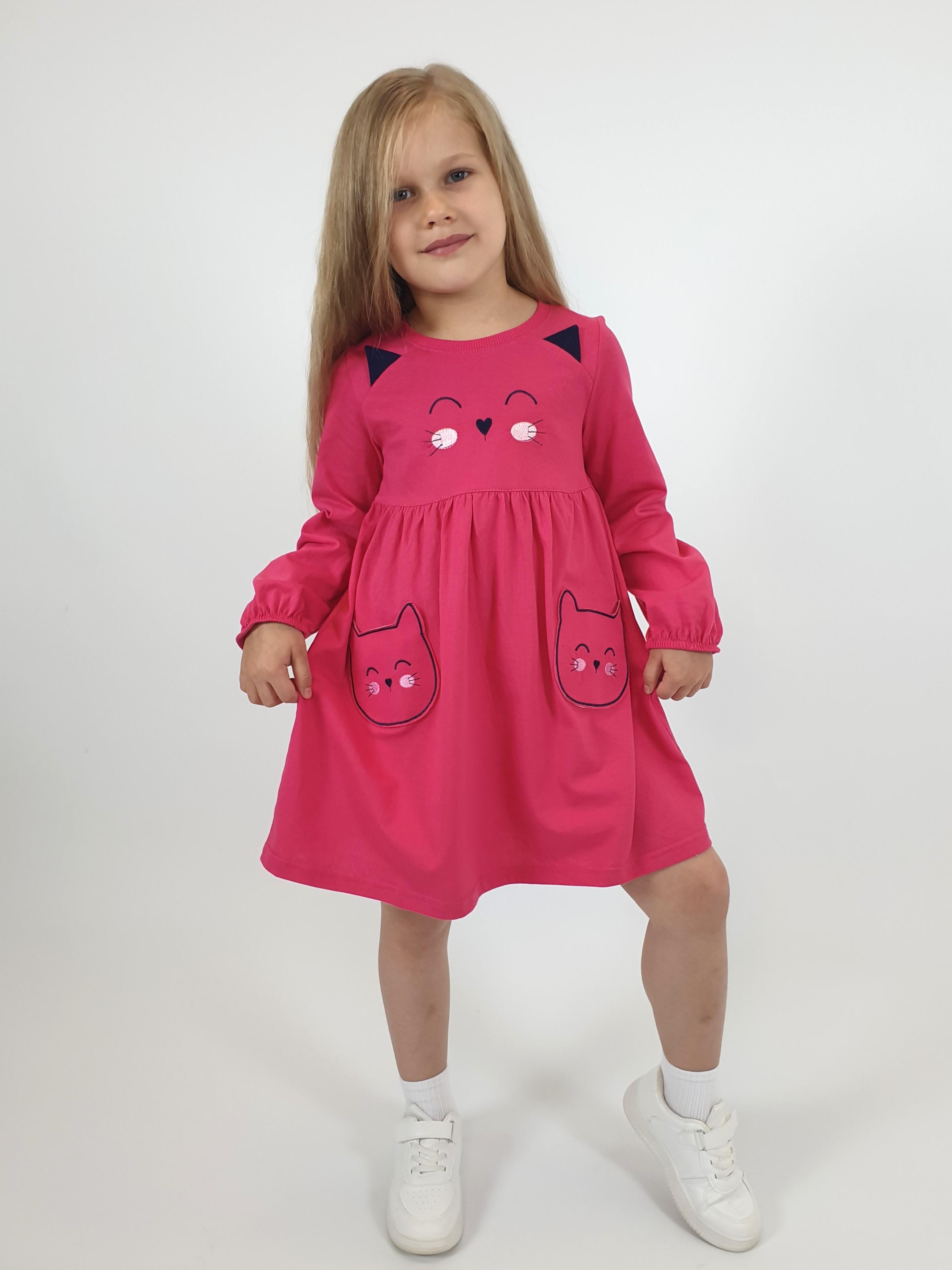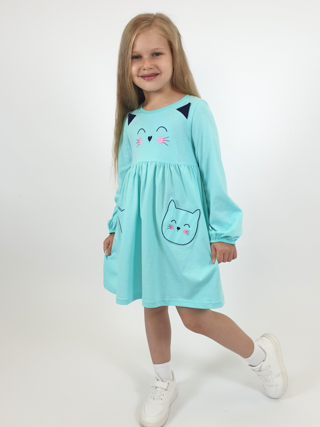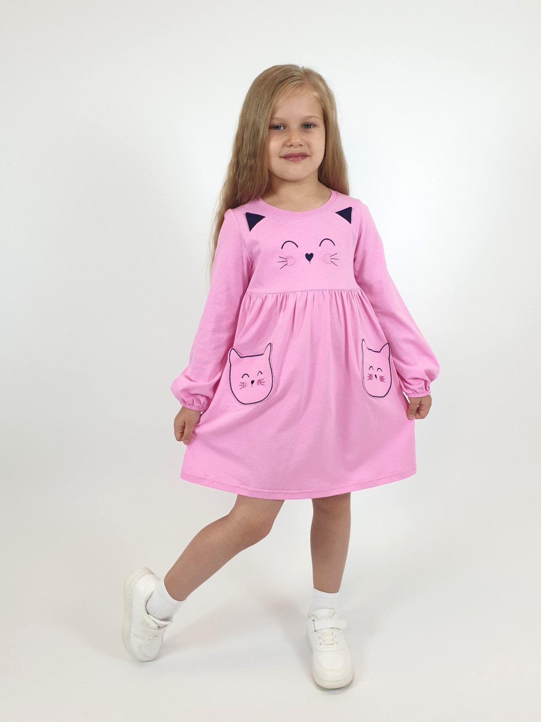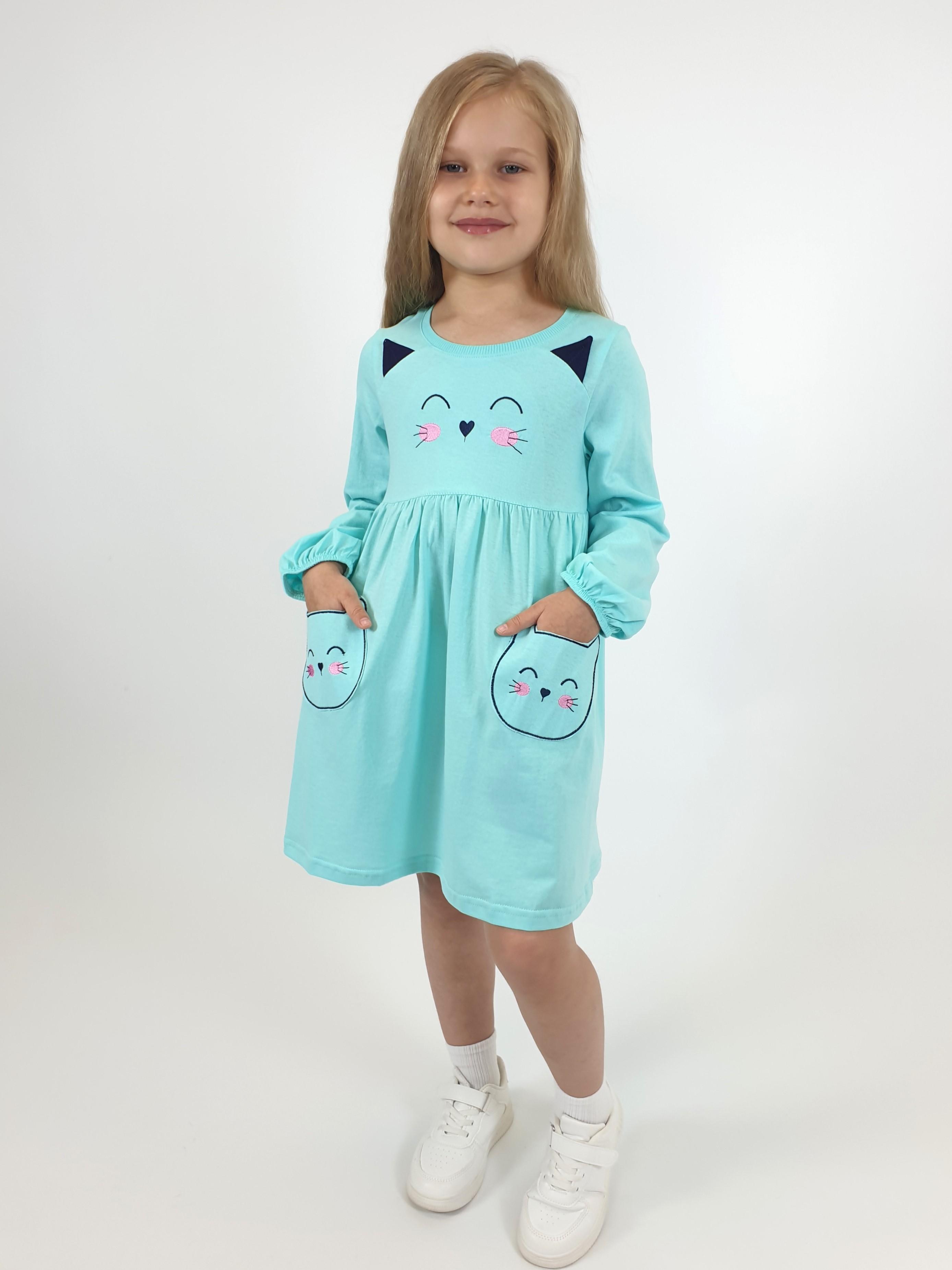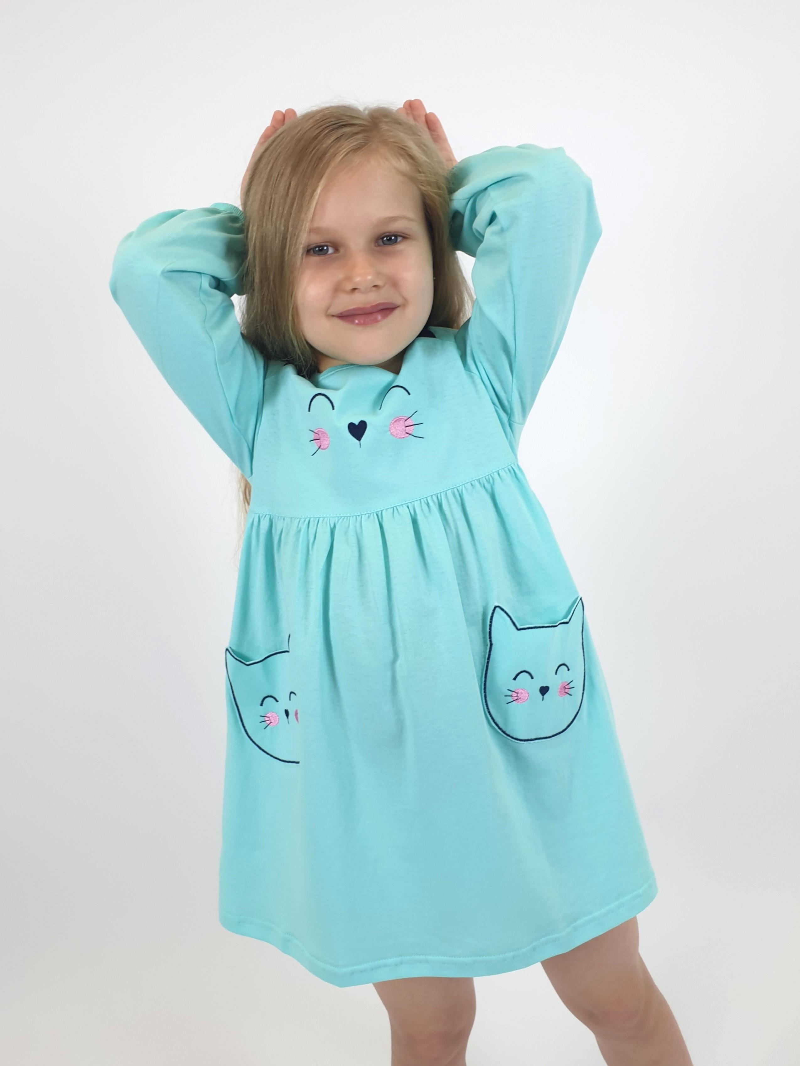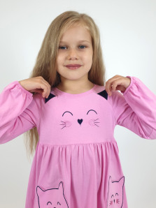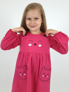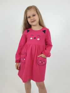 Кулирное полотно:100%х/б. Платье-полуприлегающего силуэта,отрезная юбка со сборкой,два накладных-вышитых кармана.На переде вышивка и декоративные "ушки",вставлены в подрезы.Длинный рукав,внизу на резинке.Горловина обработана ластиком.