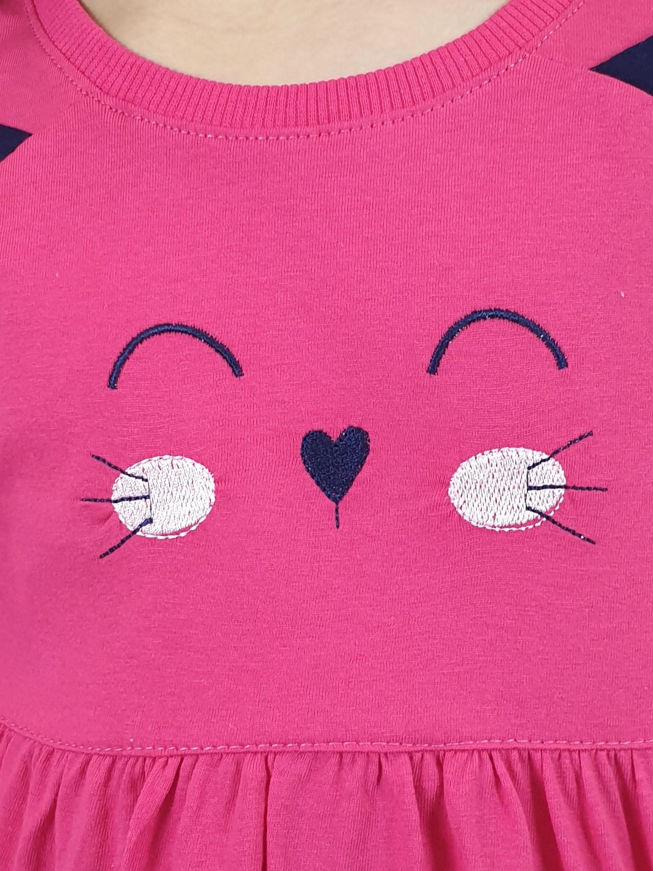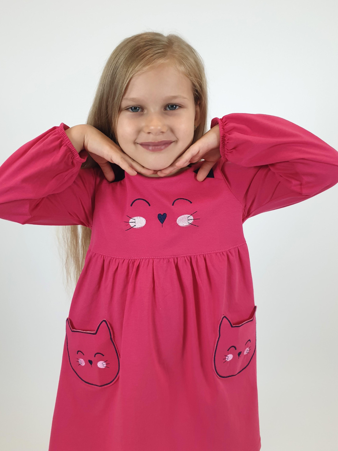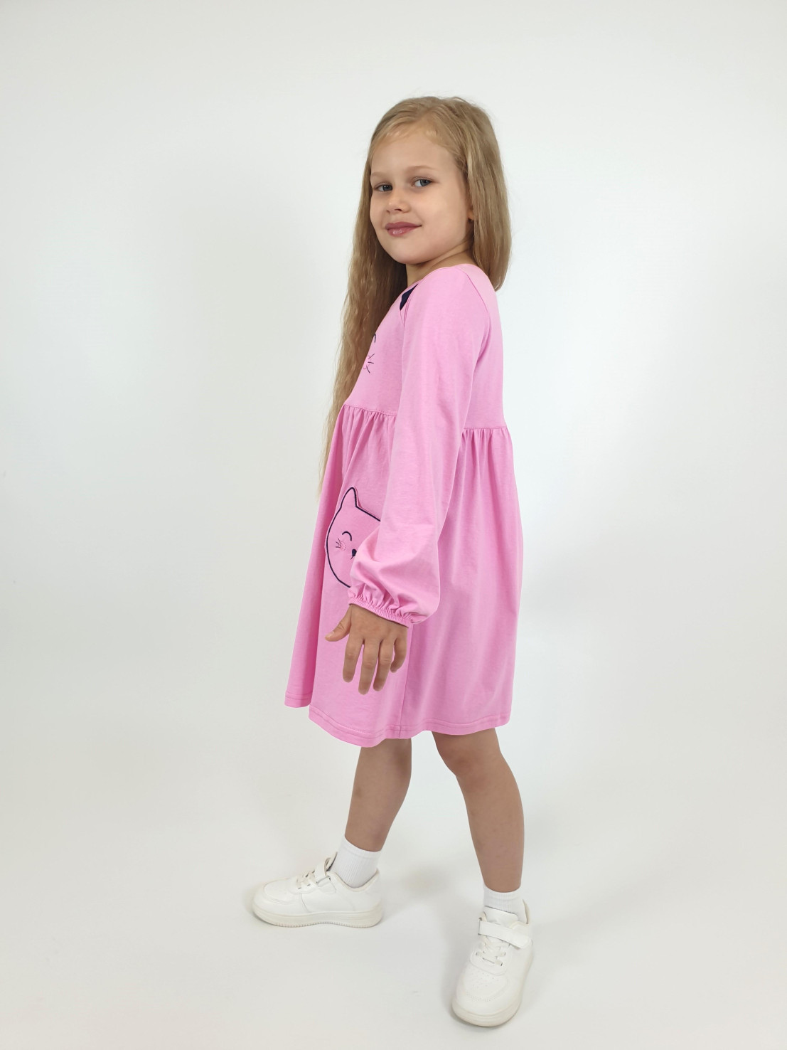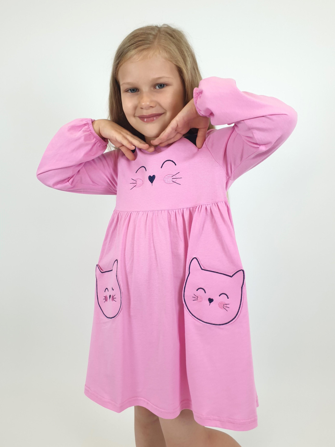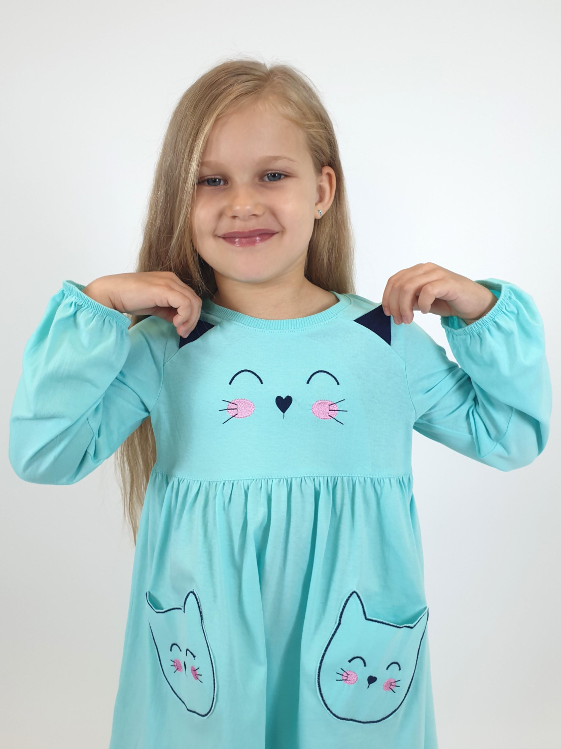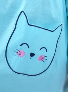 Кулирное полотно:100%х/б. Платье-полуприлегающего силуэта,отрезная юбка со сборкой,два накладных-вышитых кармана.На переде вышивка и декоративные "ушки",вставлены в подрезы.Длинный рукав,внизу на резинке.Горловина обработана ластиком.