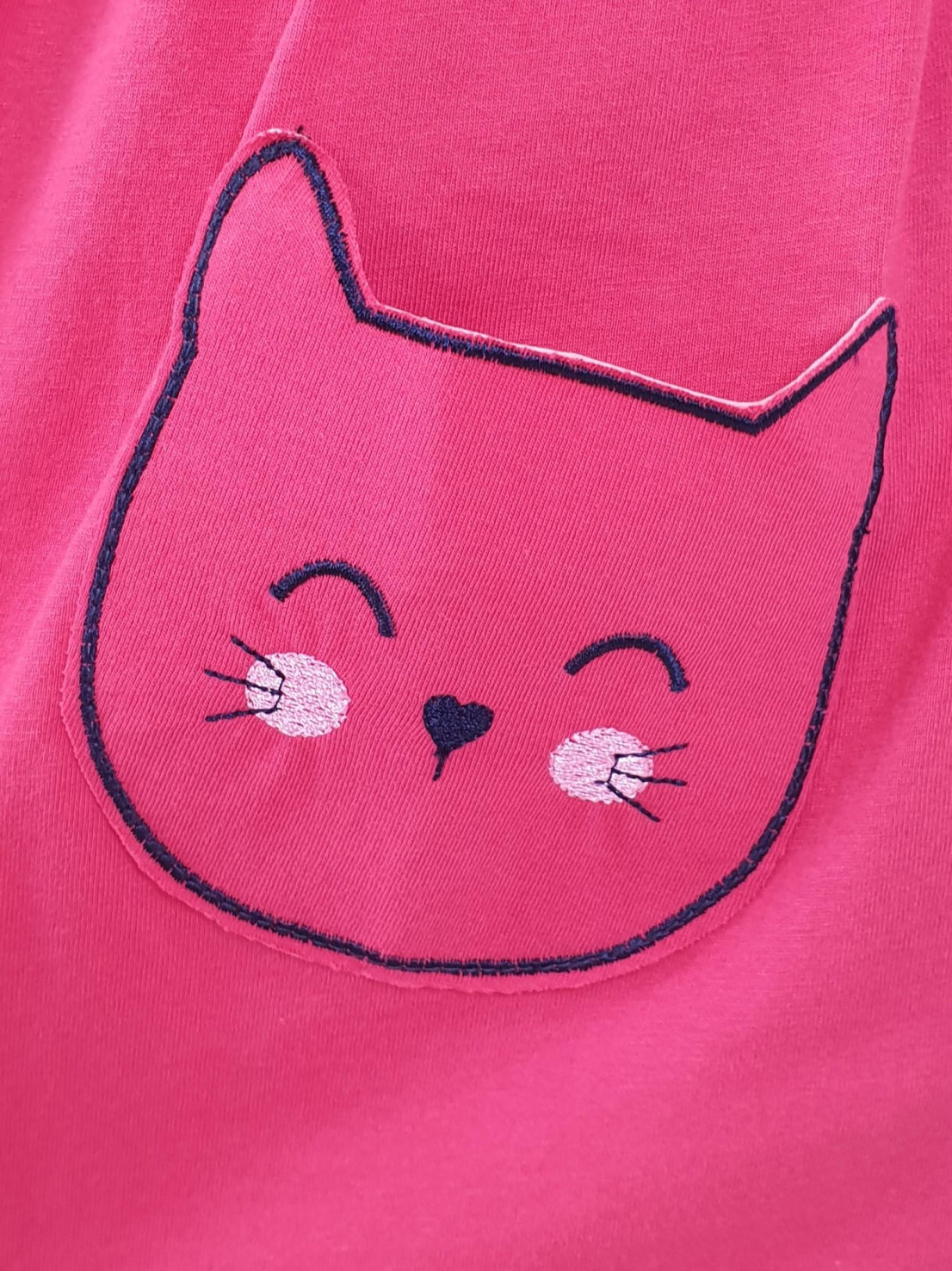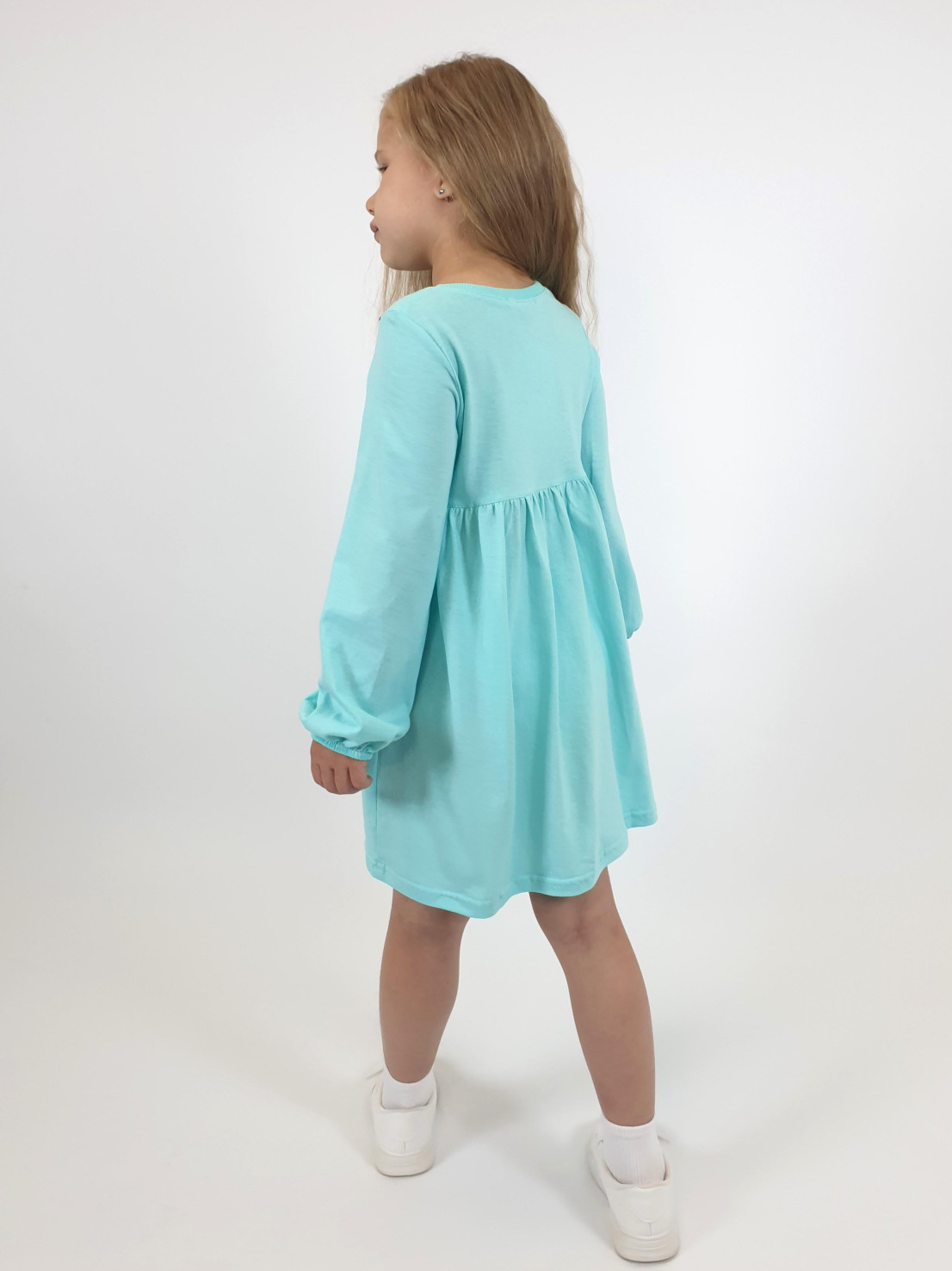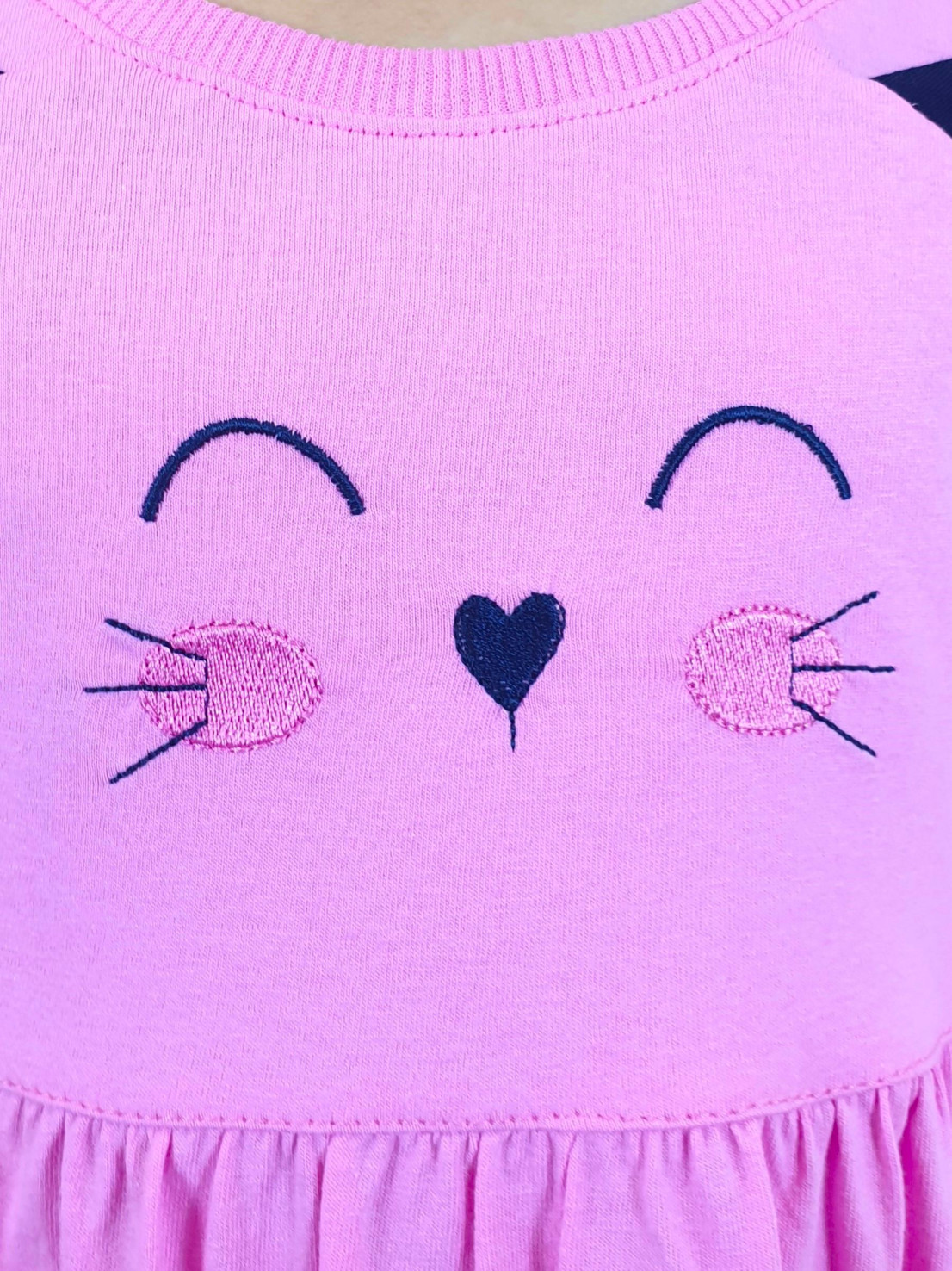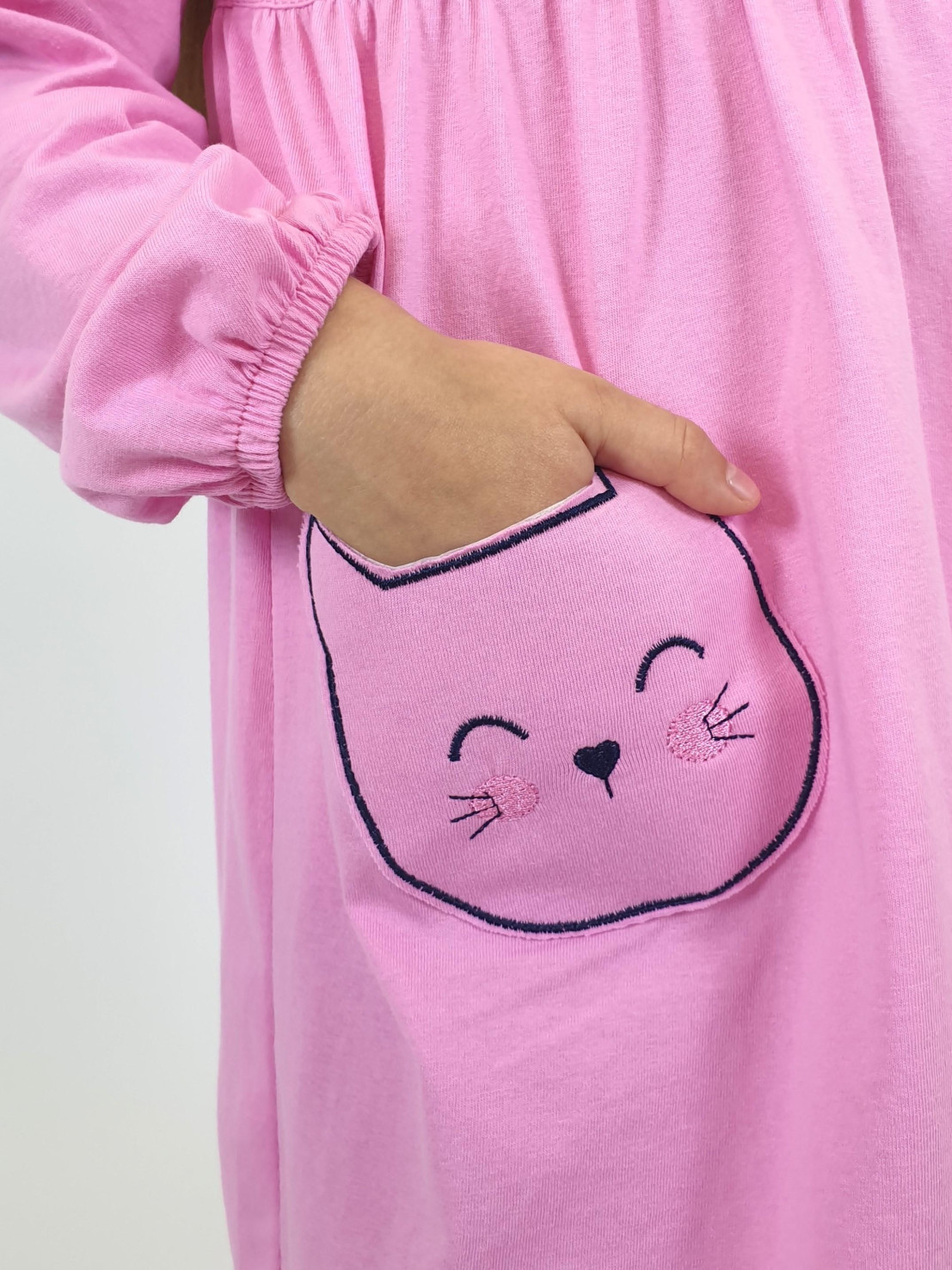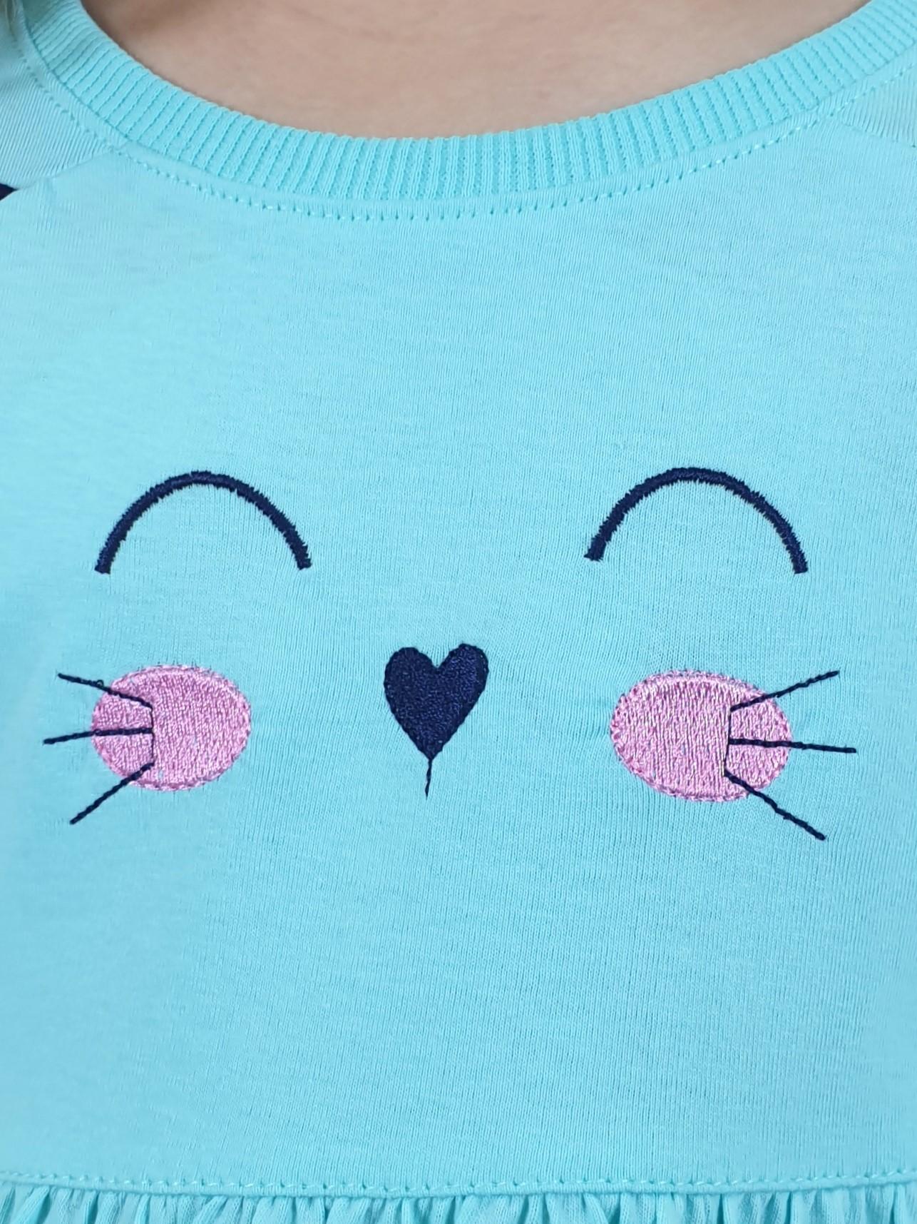 Кулирное полотно:100%х/б. Платье-полуприлегающего силуэта,отрезная юбка со сборкой,два накладных-вышитых кармана.На переде вышивка и декоративные "ушки",вставлены в подрезы.Длинный рукав,внизу на резинке.Горловина обработана ластиком.