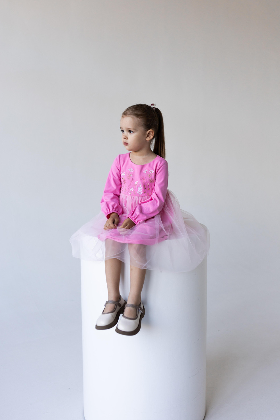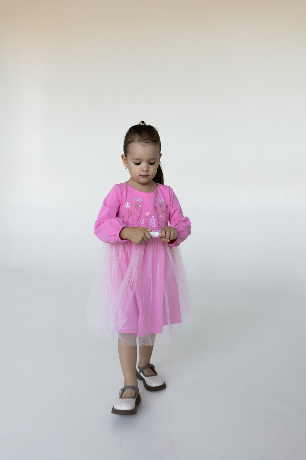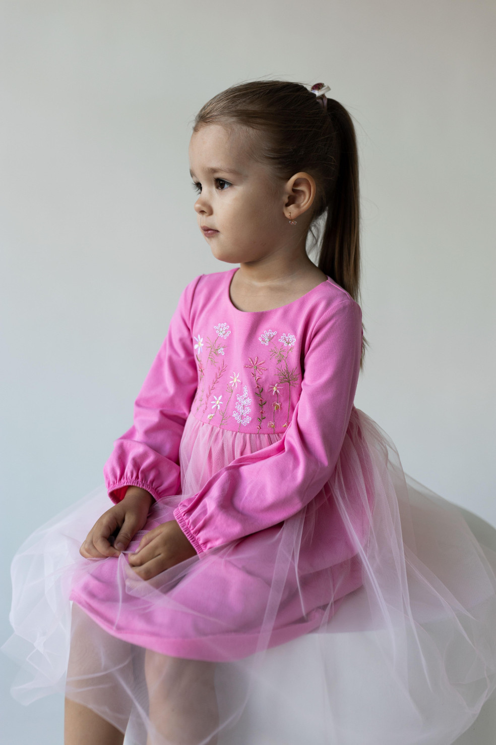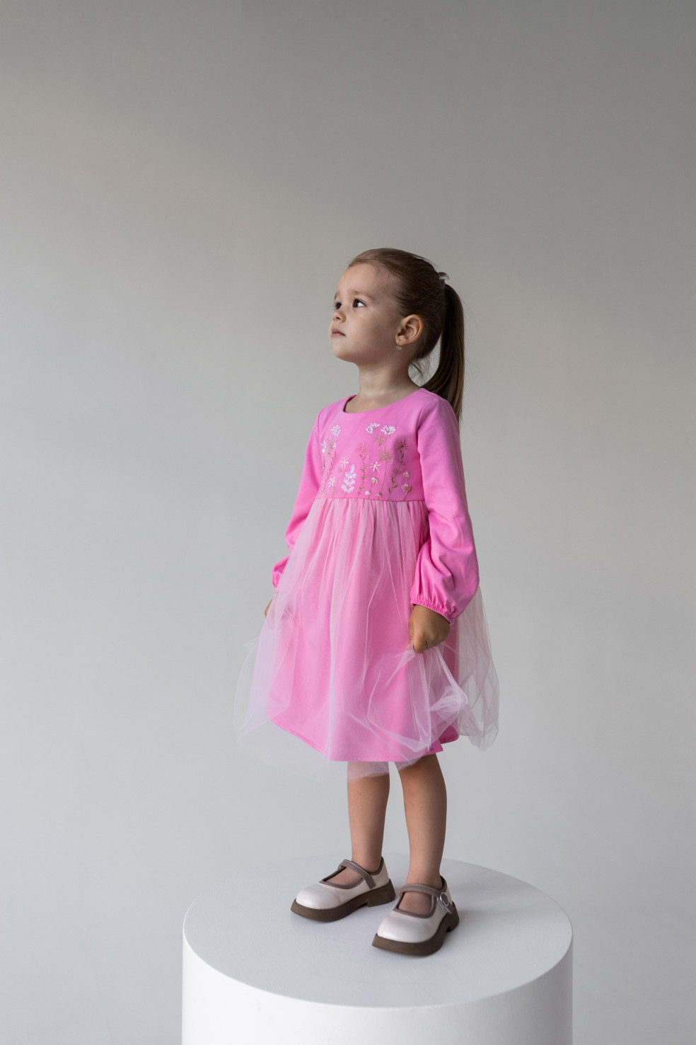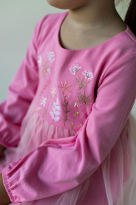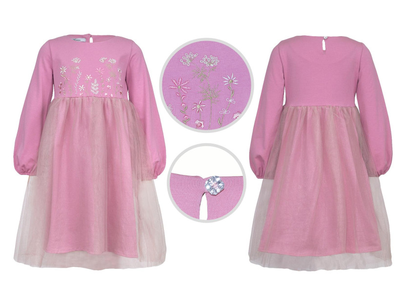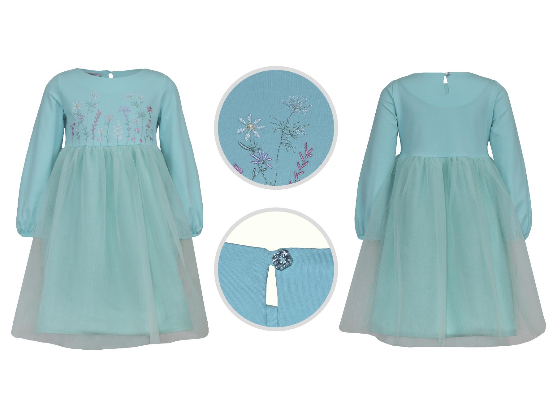 Кулирное полотно:95%х/б, 5%лайкра. Юбка 100%х/б, сетка:100%п/э. Платье-силуэт трапеция,втачной длинный рукав на резинке внизу. Отрезная юбка в сборку с сеткой. Горловина обработана обтачкой. Вышивка по переду. Застежка по спинке на 1 пуговицу.