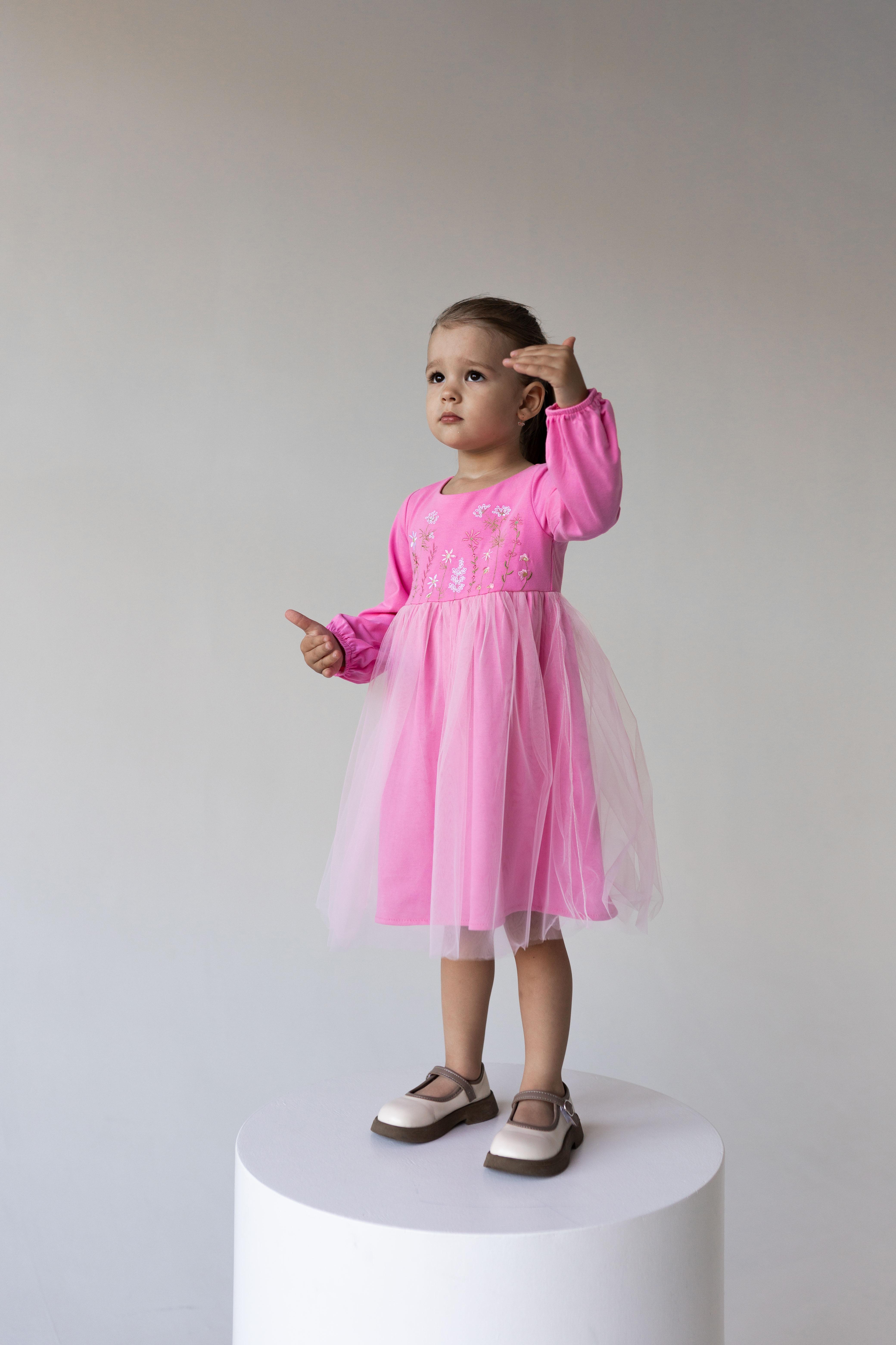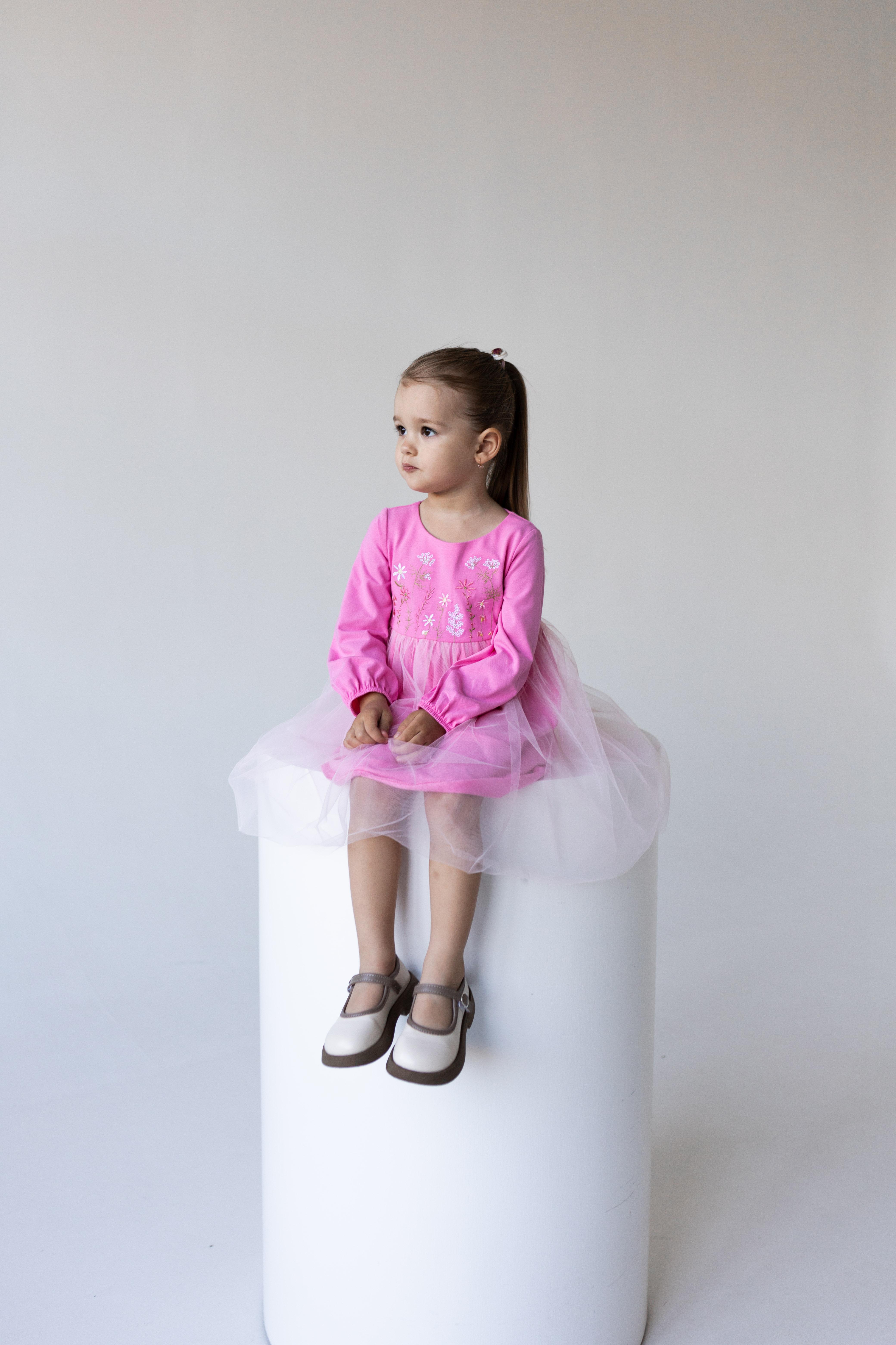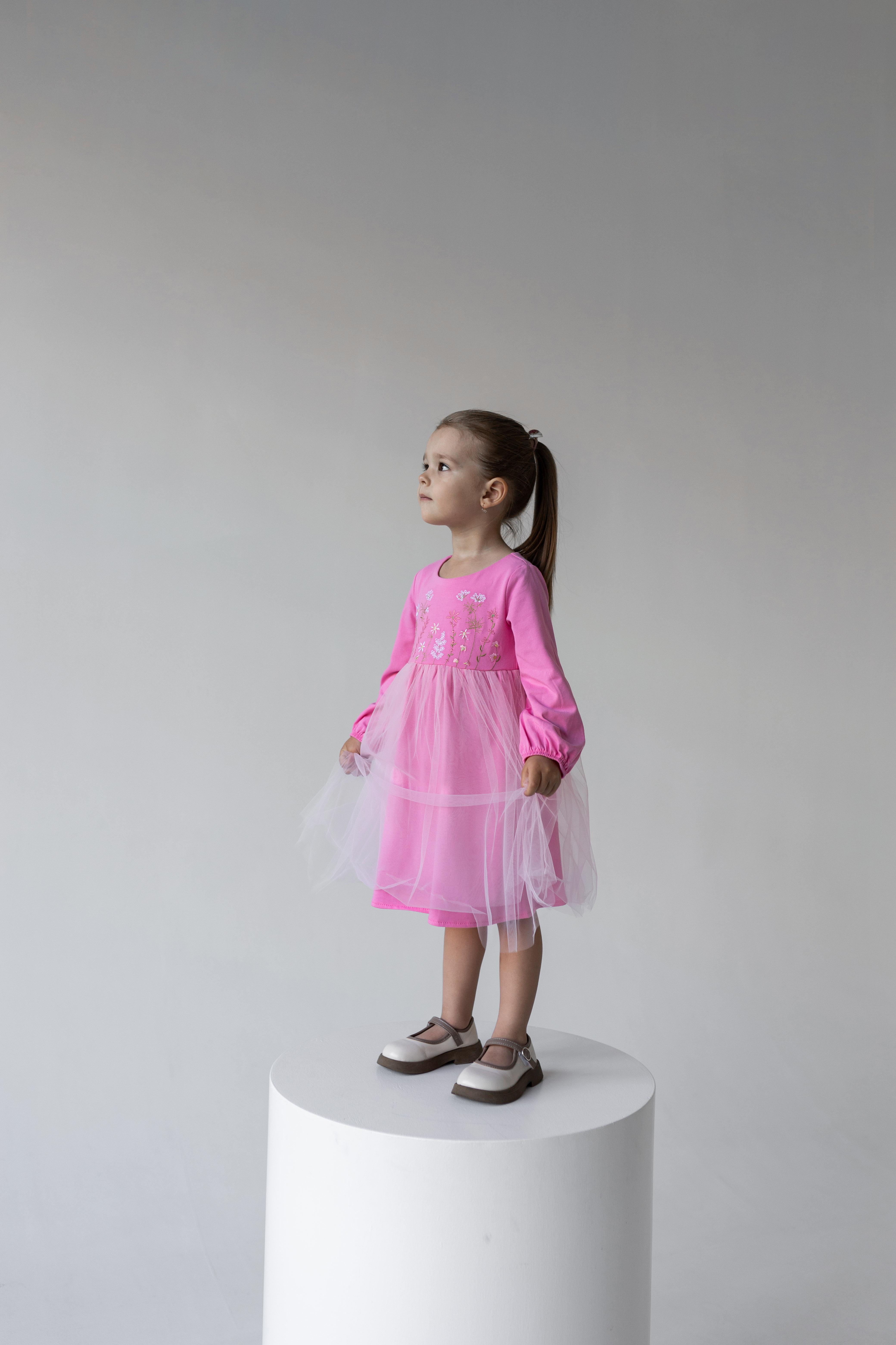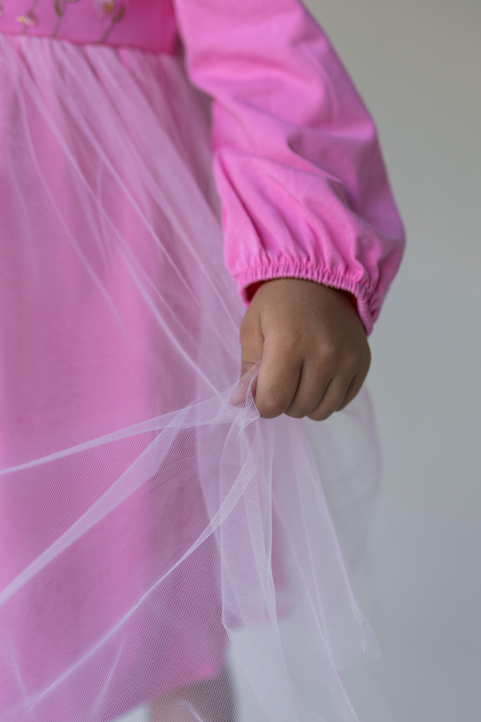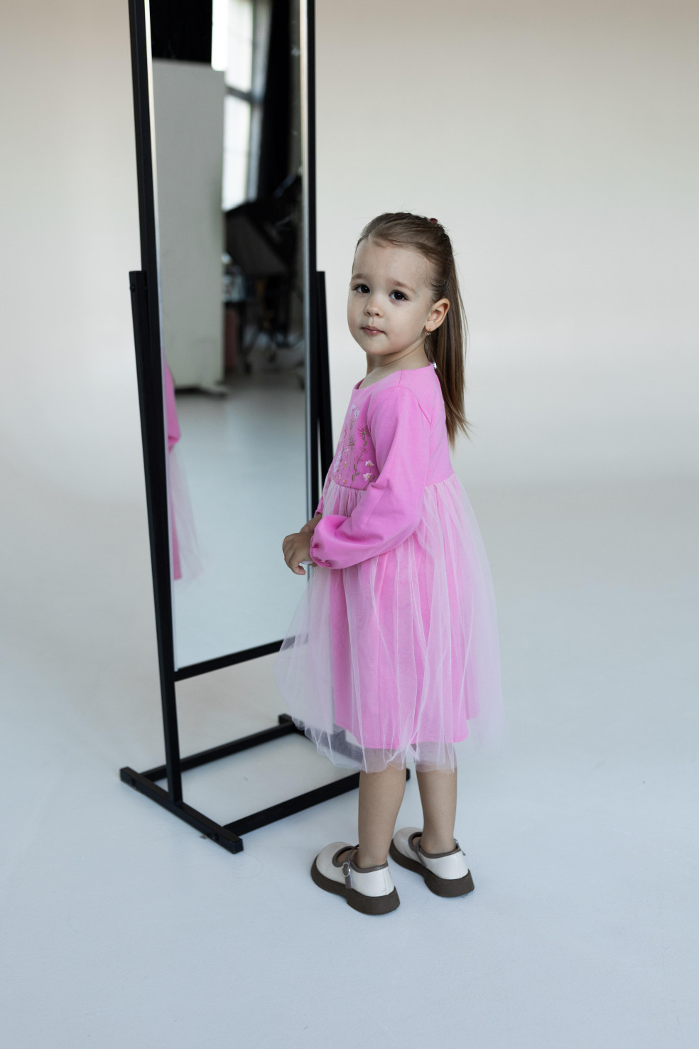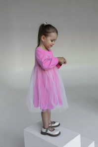 Кулирное полотно:95%х/б, 5%лайкра. Юбка 100%х/б, сетка:100%п/э. Платье-силуэт трапеция,втачной длинный рукав на резинке внизу. Отрезная юбка в сборку с сеткой. Горловина обработана обтачкой. Вышивка по переду. Застежка по спинке на 1 пуговицу.