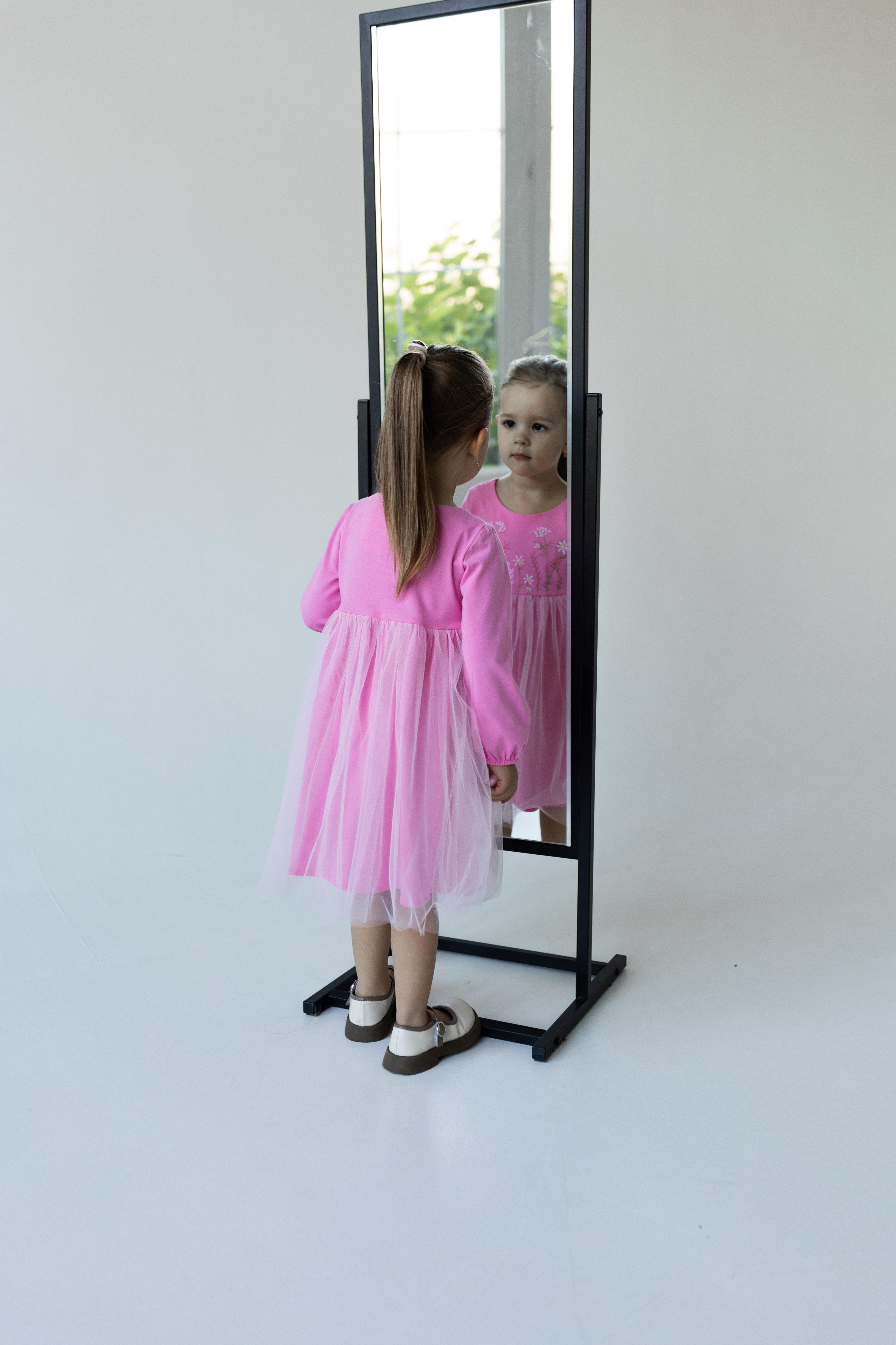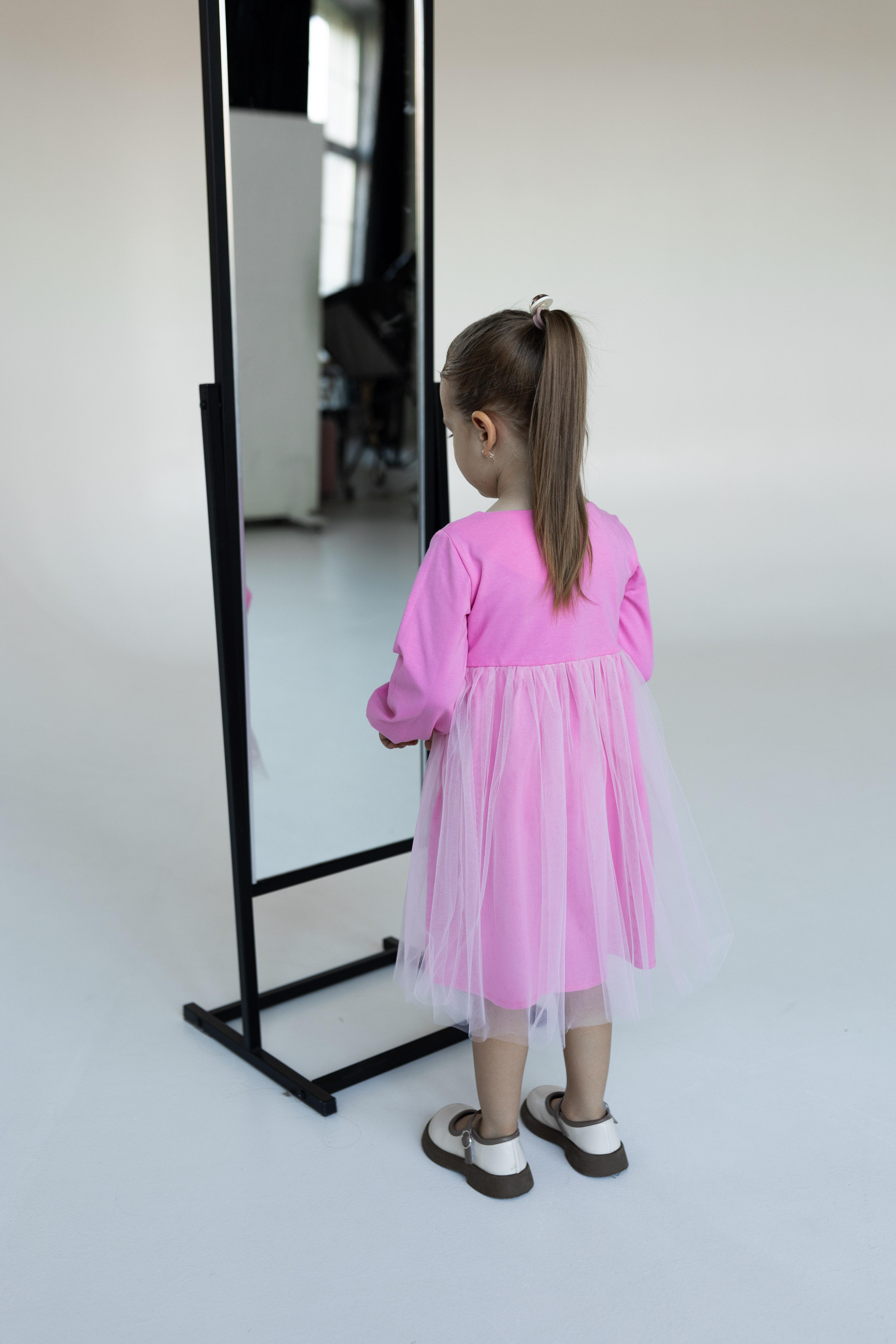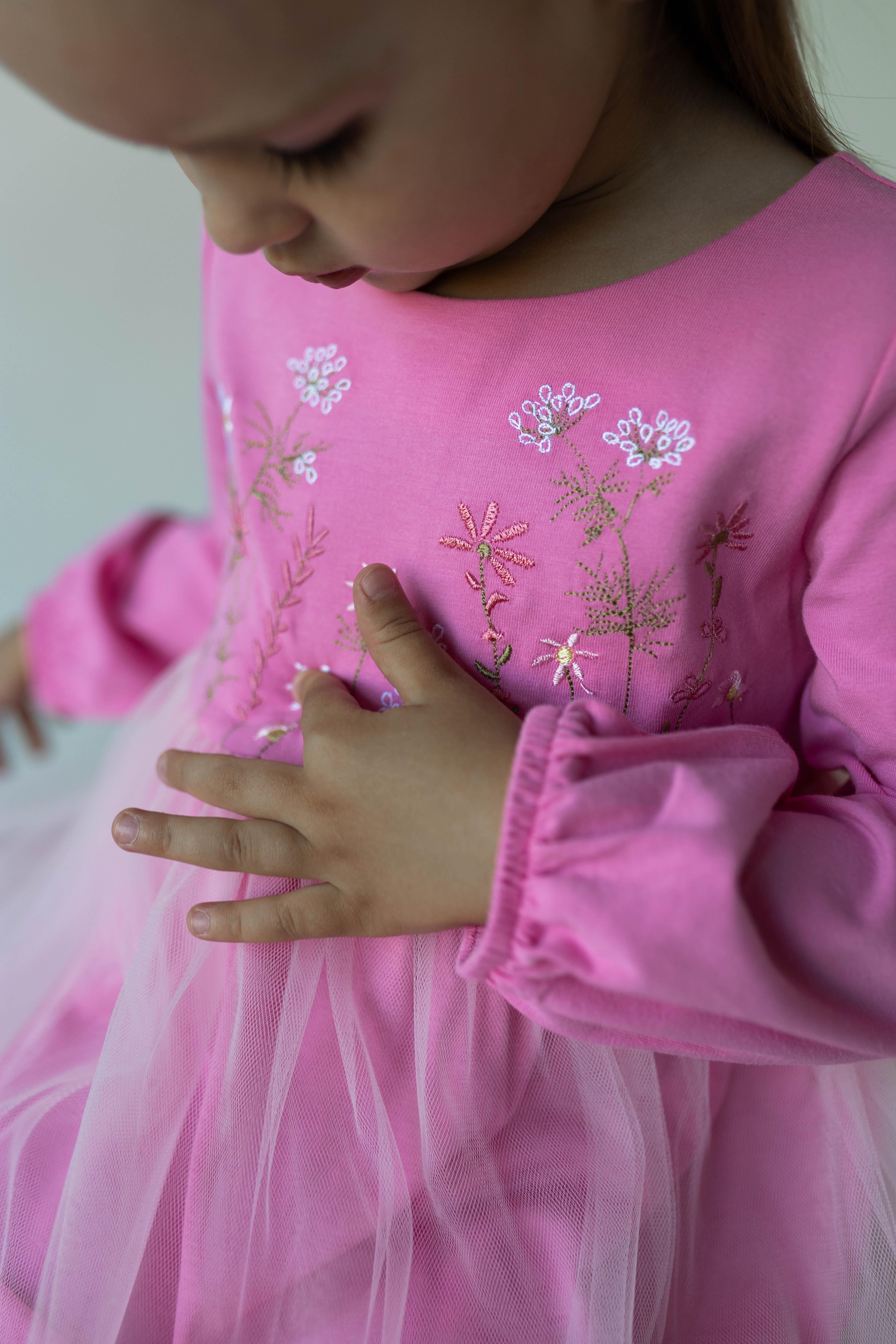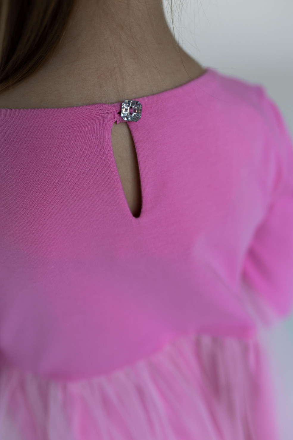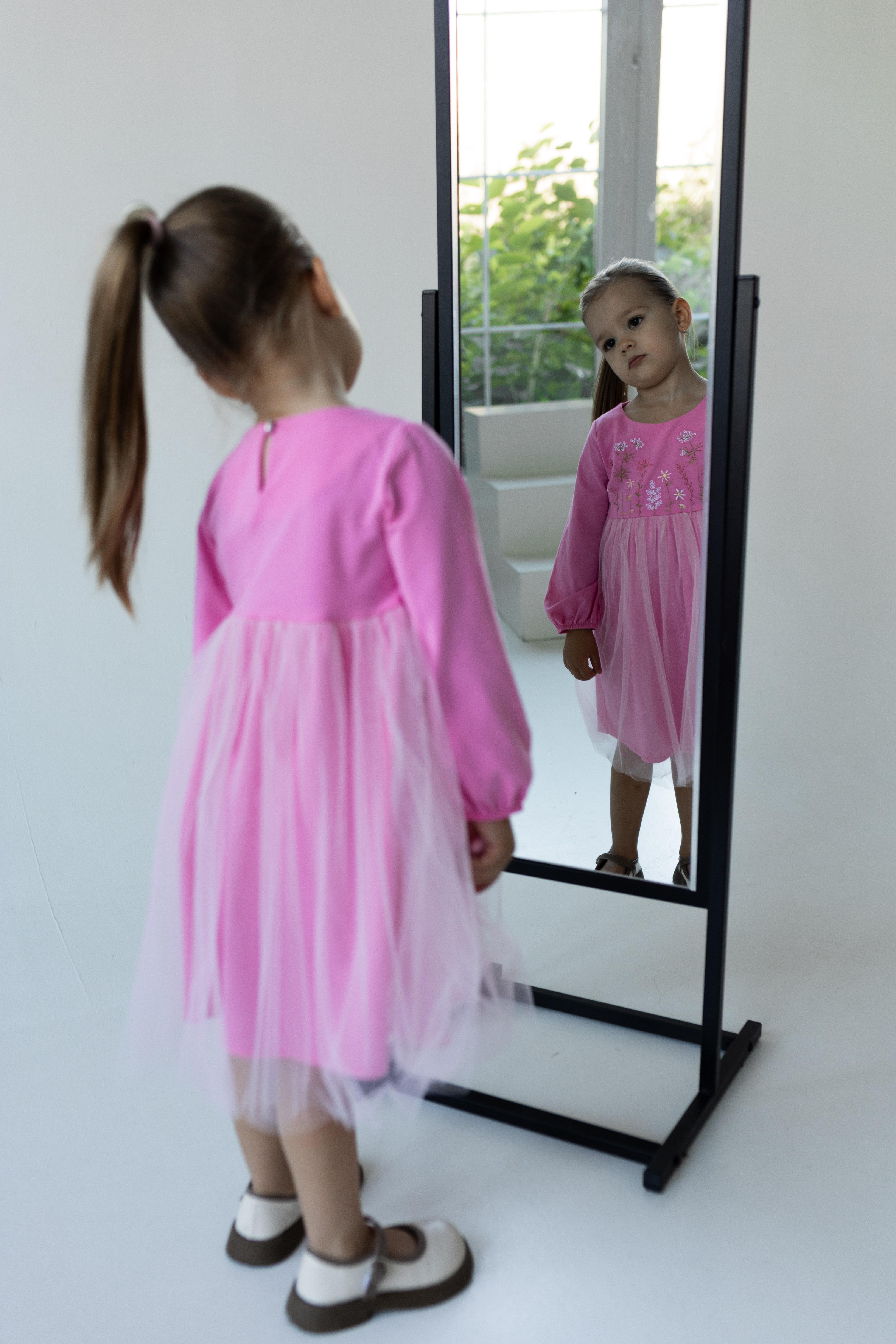 Кулирное полотно:95%х/б, 5%лайкра. Юбка 100%х/б, сетка:100%п/э. Платье-силуэт трапеция,втачной длинный рукав на резинке внизу. Отрезная юбка в сборку с сеткой. Горловина обработана обтачкой. Вышивка по переду. Застежка по спинке на 1 пуговицу.