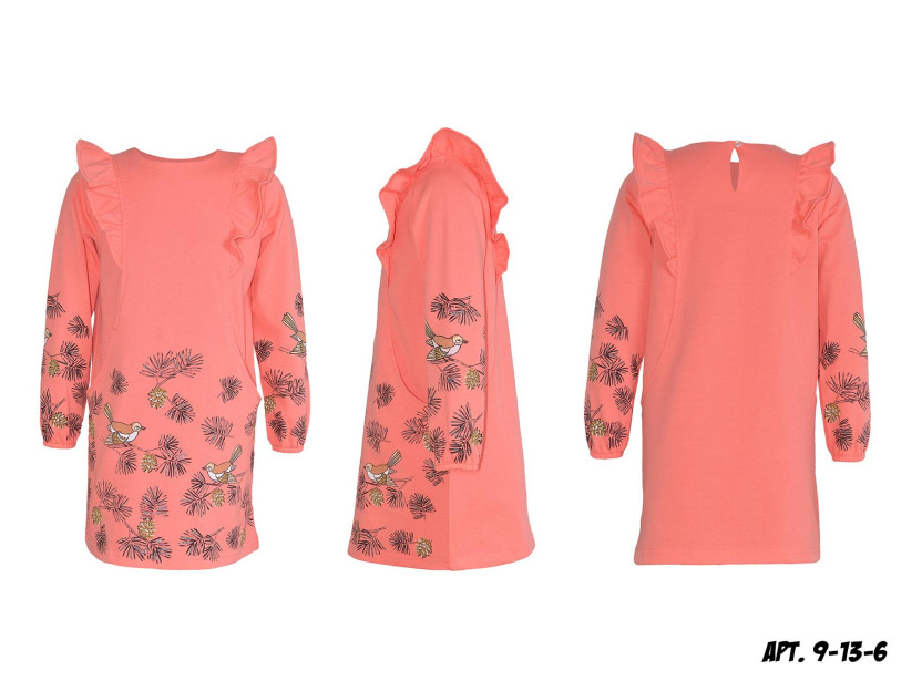 Платье выполнено из качественного кулирного полотна (100% хлопок). Модель прямого силуэта, декорирована оригинальным принтом и рюшей ,застёжка по спинке на пуговицу. Такое платье идеально подойдёт для прогулок, школы, детского сада и как повседневный вариант.