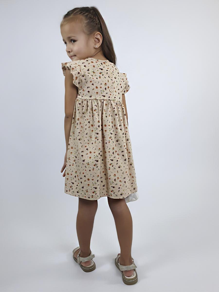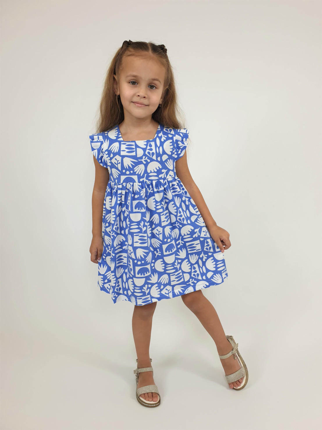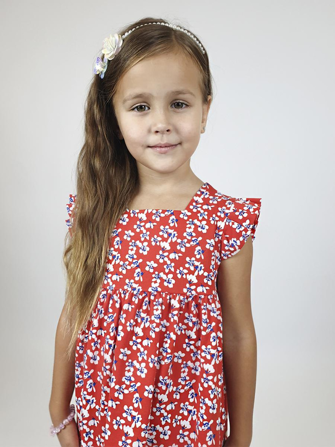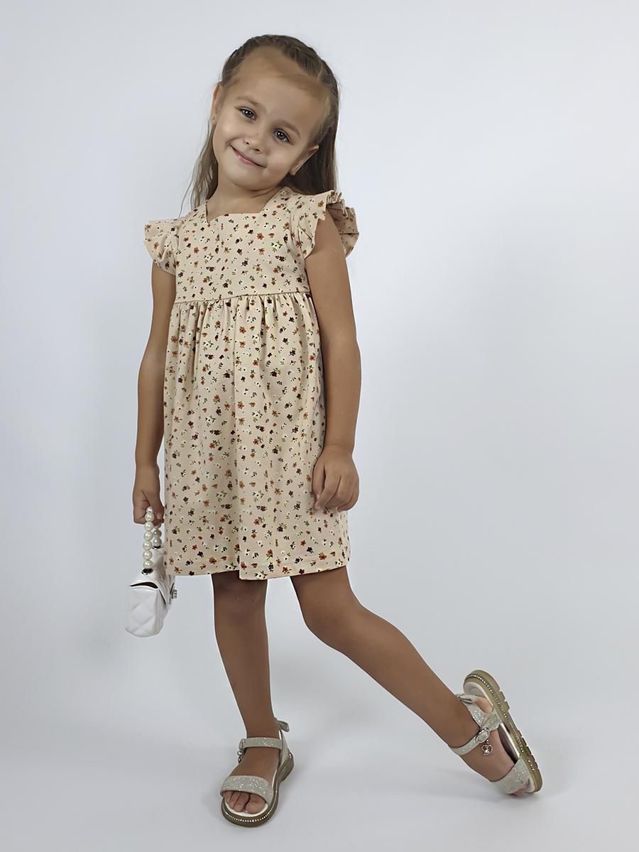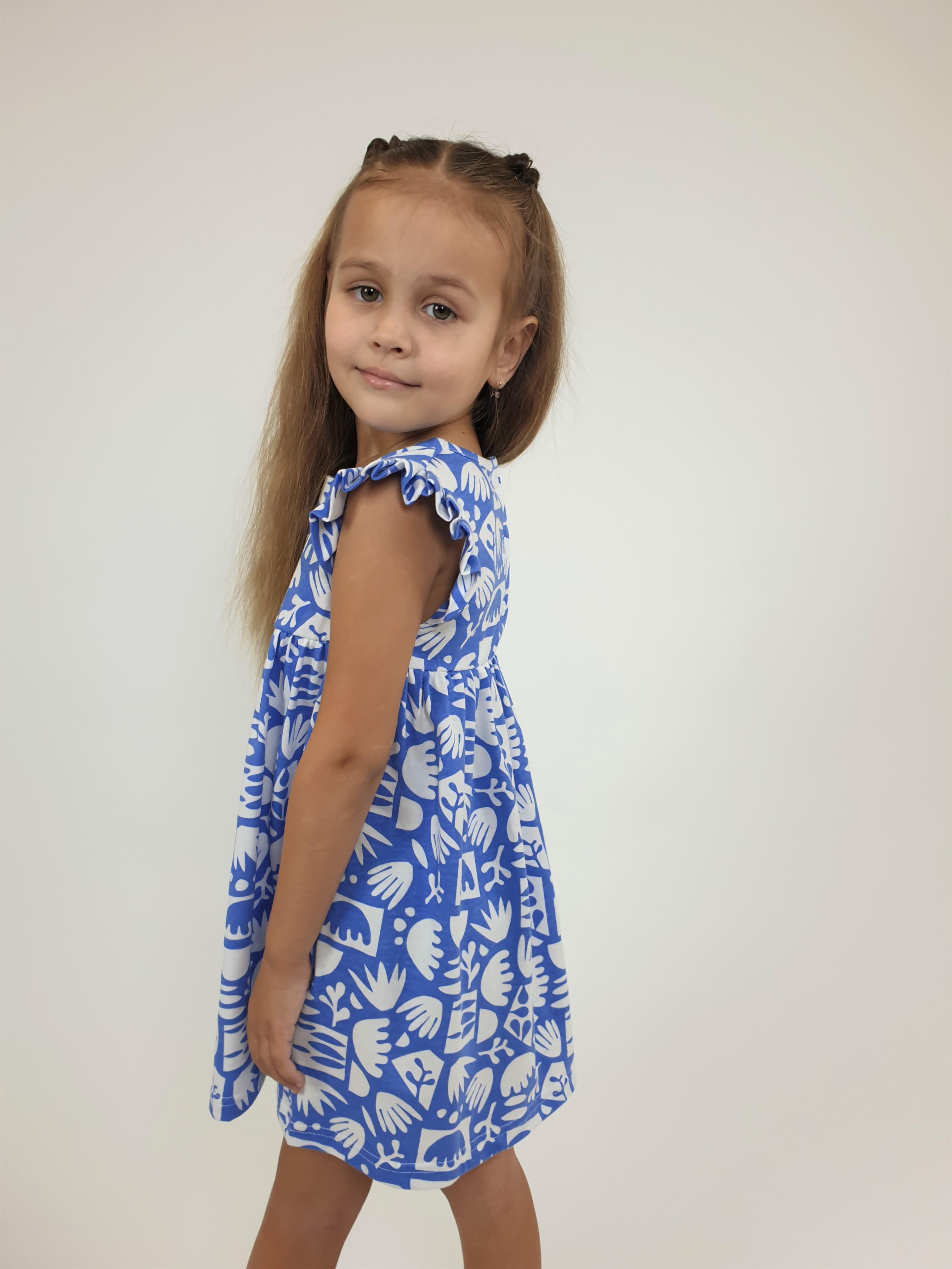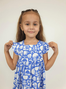 Кулирное полотно(набивка):100% х/б. Платье-завышена линия талии,отрезная юбка со сборкой.Рукав-рюша в складку.Вырез горловины квадратный,застежка по спинке на пуговицы.Низ юбки подшит.