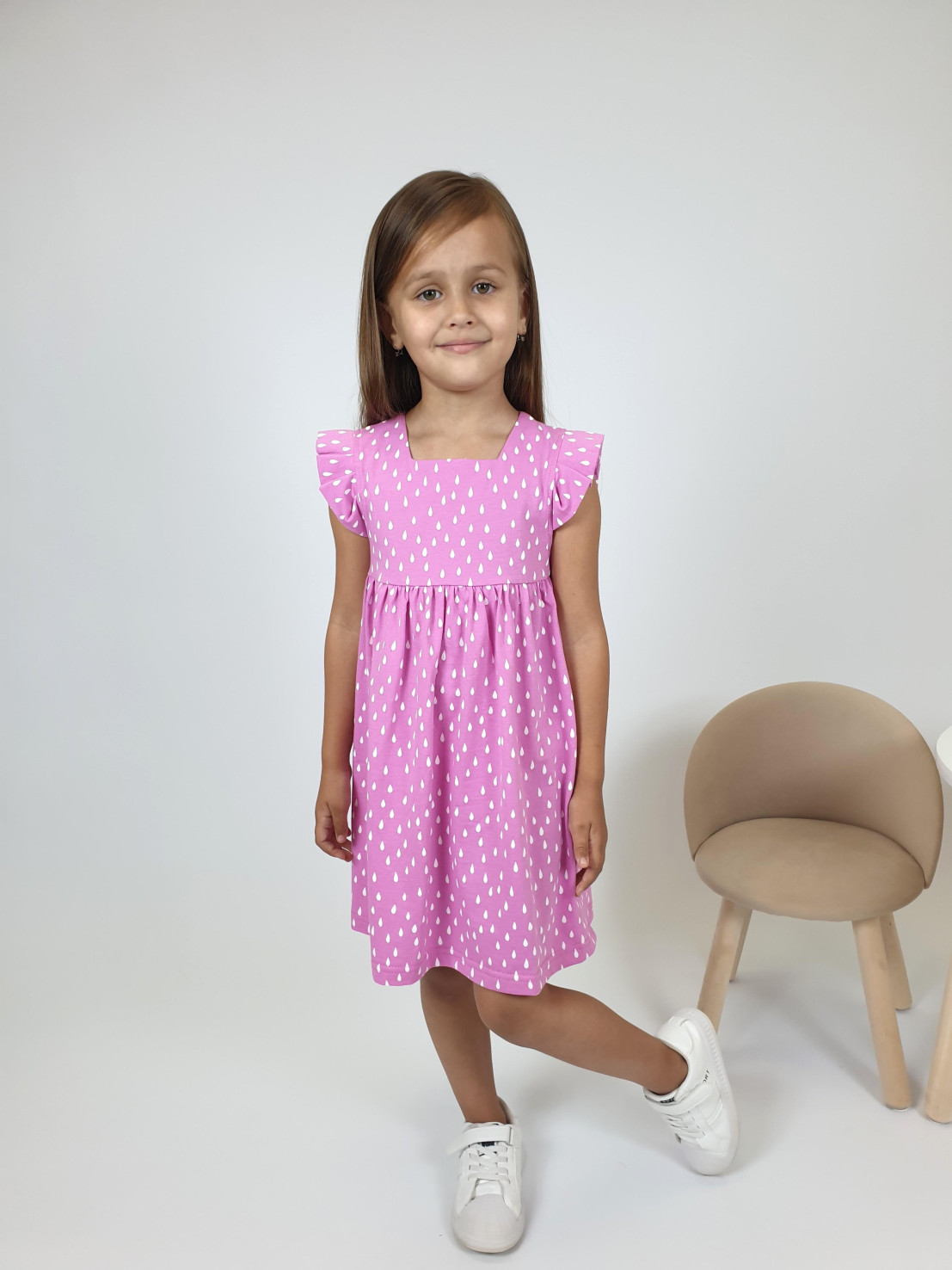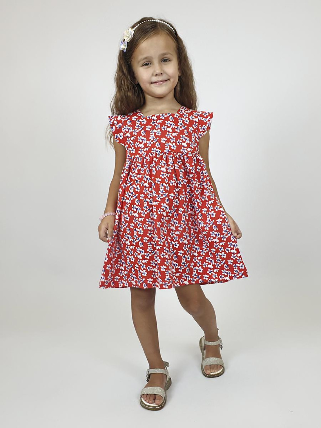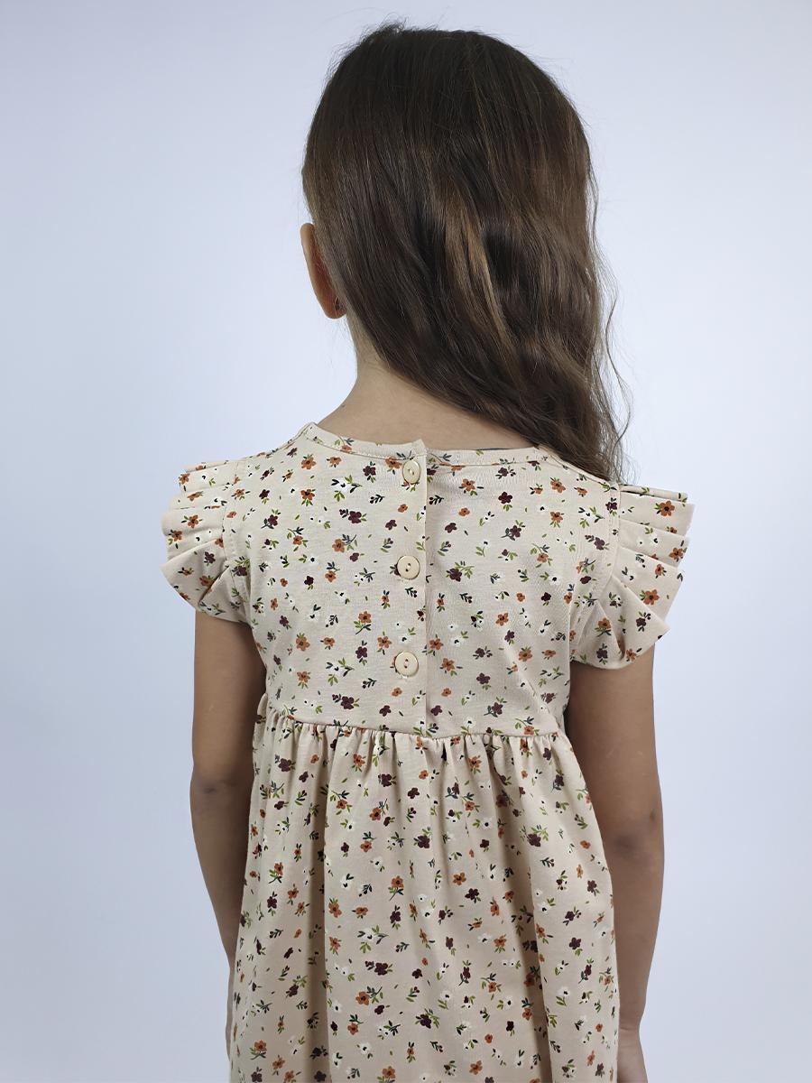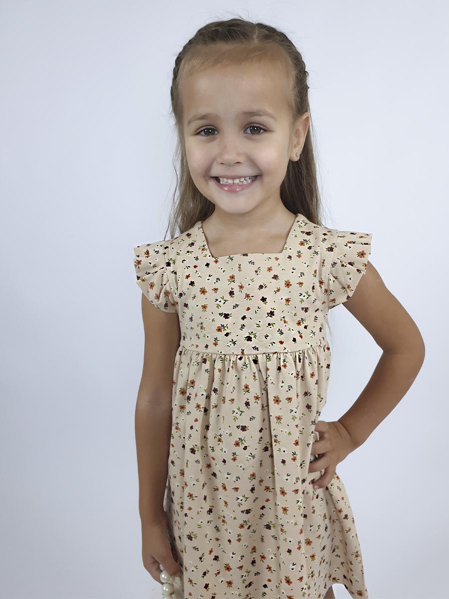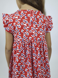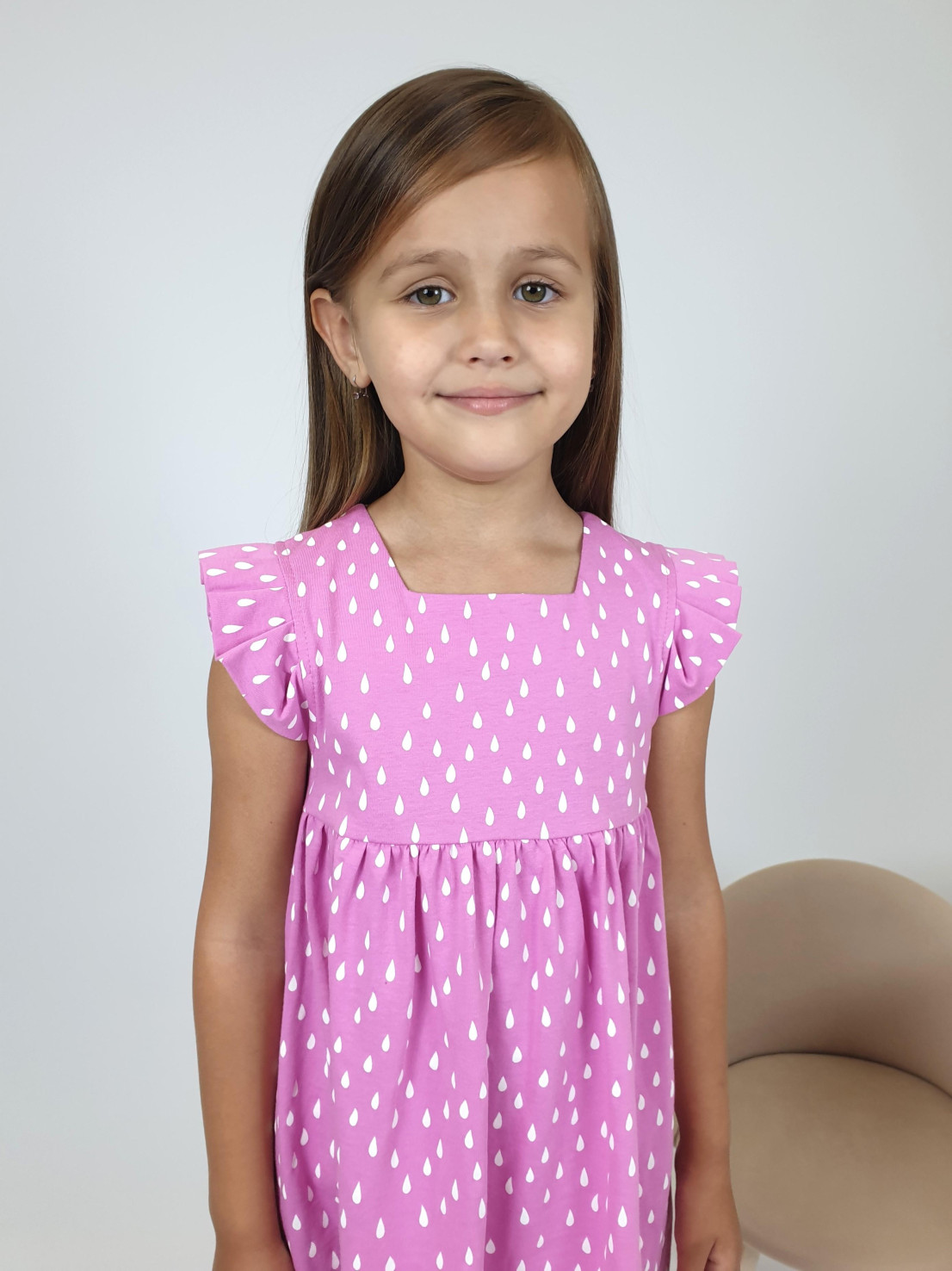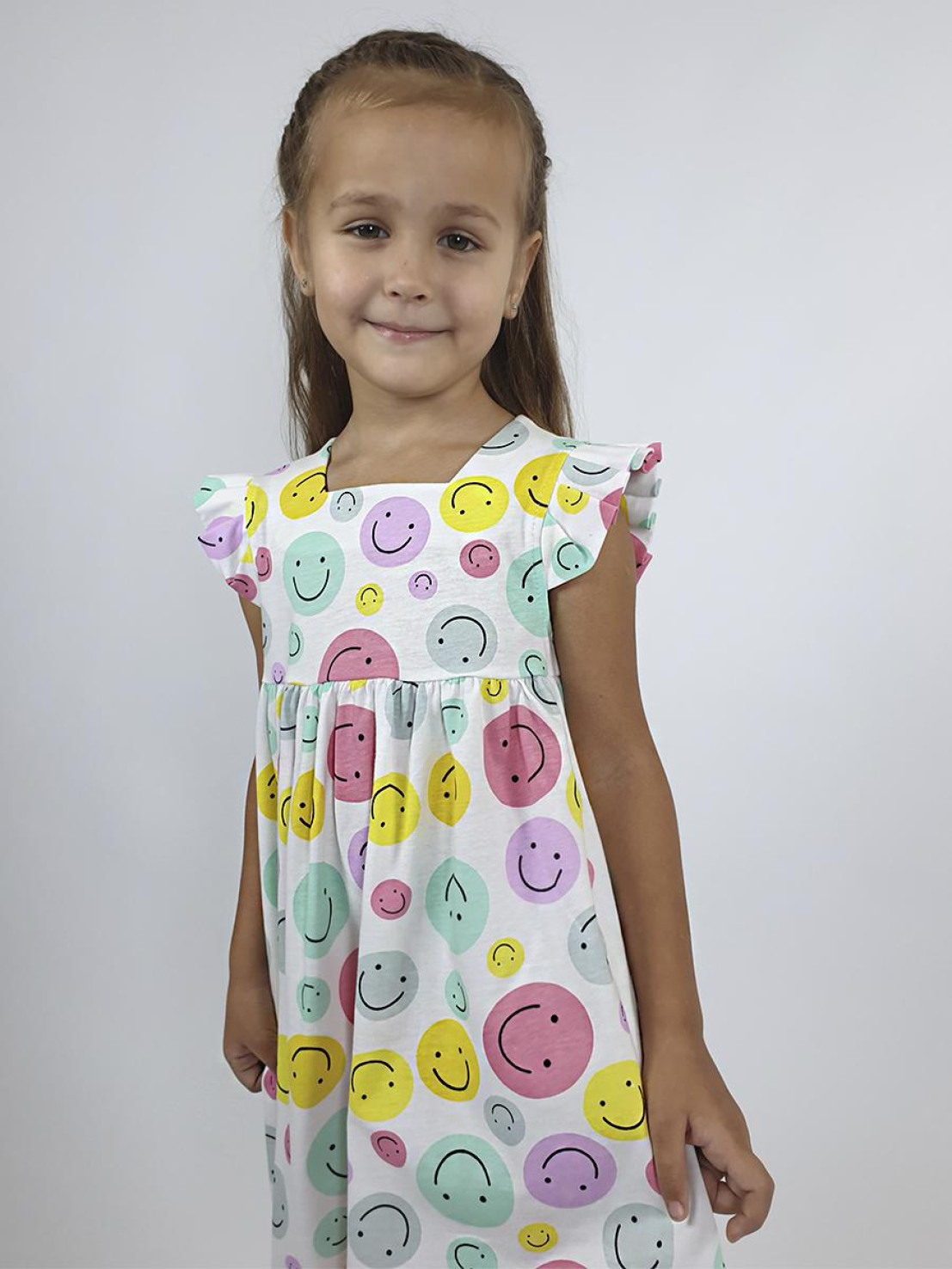 Кулирное полотно(набивка):100% х/б. Платье-завышена линия талии,отрезная юбка со сборкой.Рукав-рюша в складку.Вырез горловины квадратный,застежка по спинке на пуговицы.Низ юбки подшит.