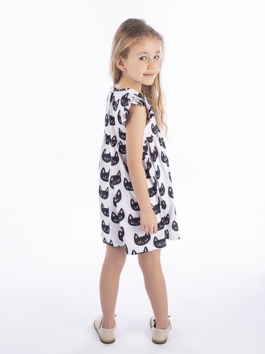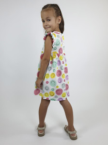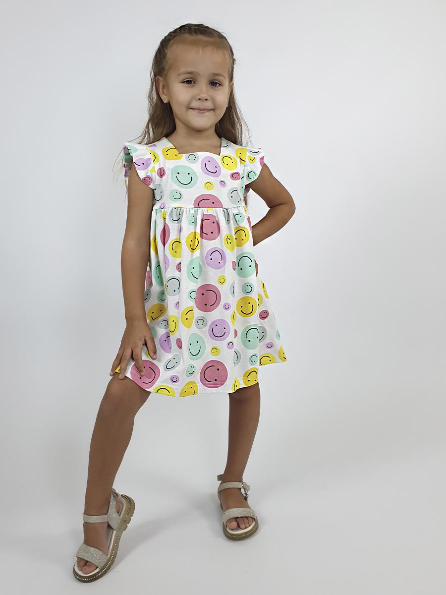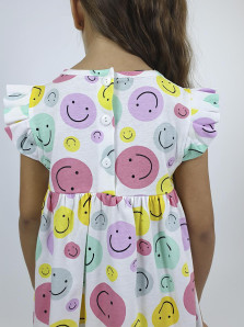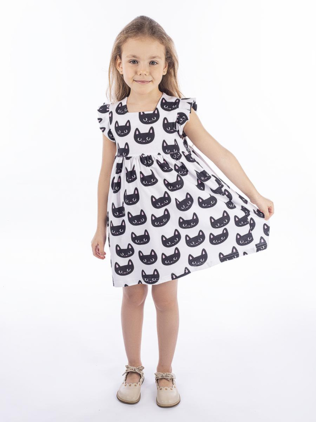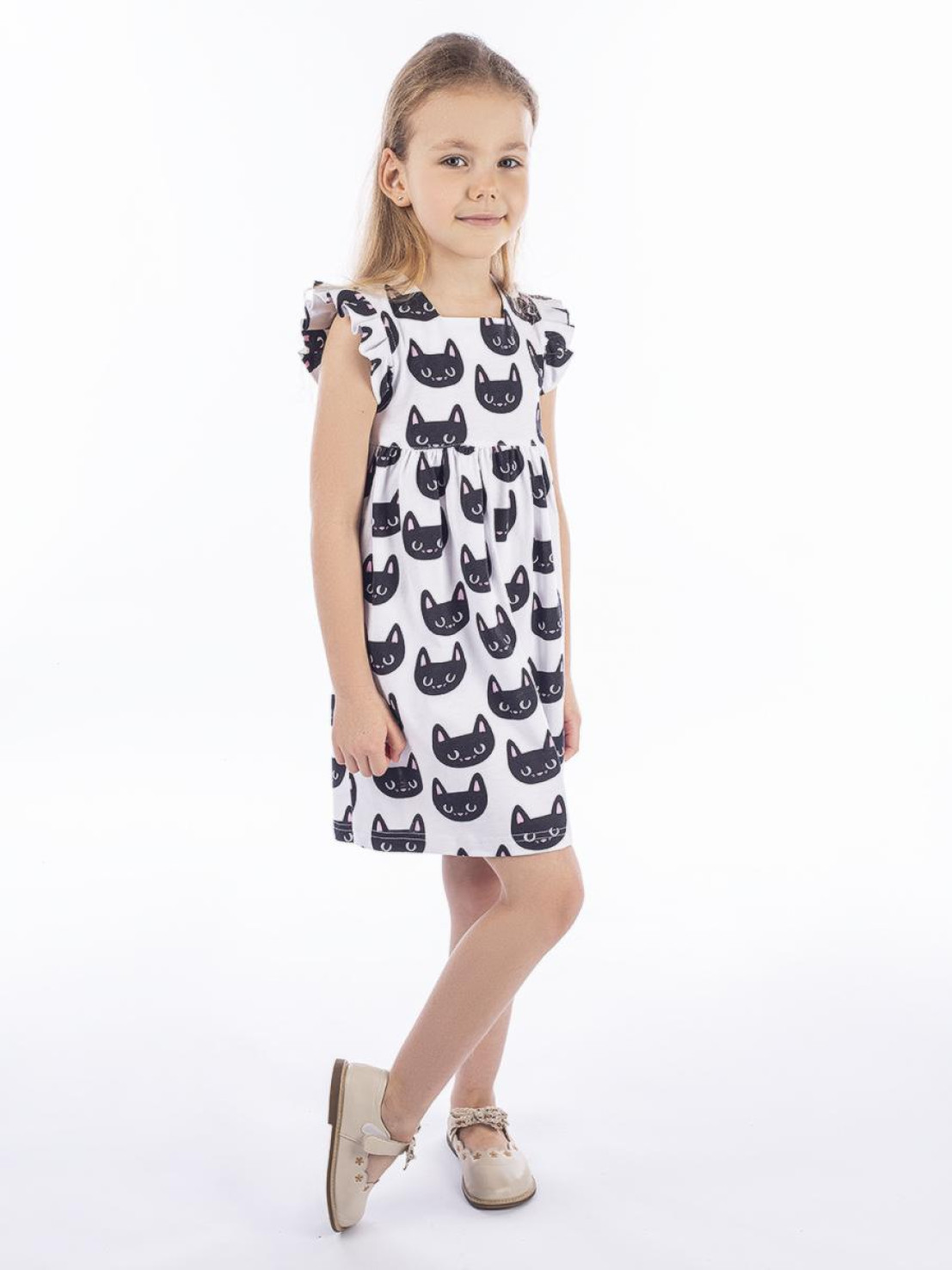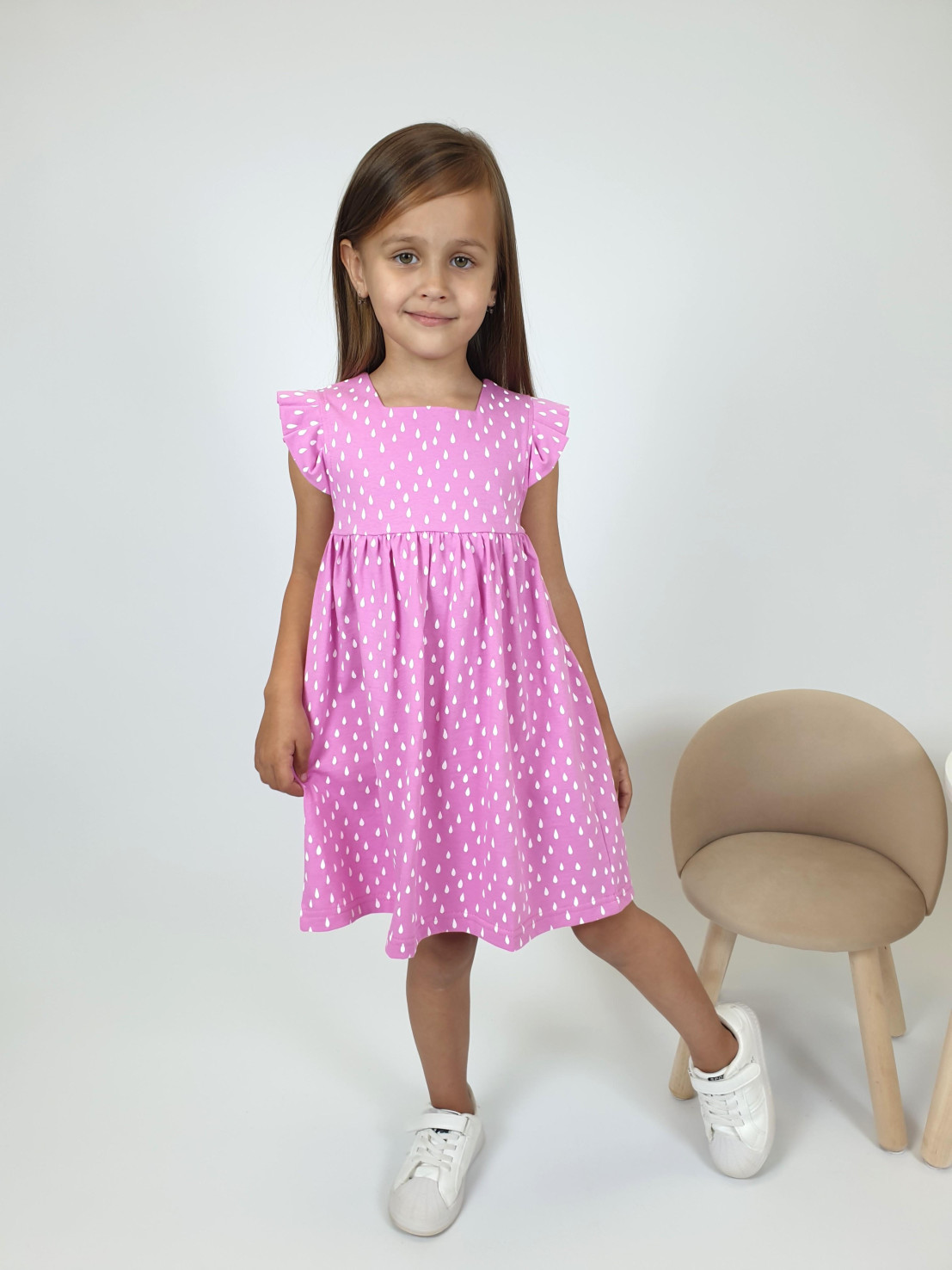 Кулирное полотно(набивка):100% х/б. Платье-завышена линия талии,отрезная юбка со сборкой.Рукав-рюша в складку.Вырез горловины квадратный,застежка по спинке на пуговицы.Низ юбки подшит.