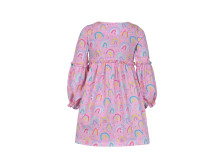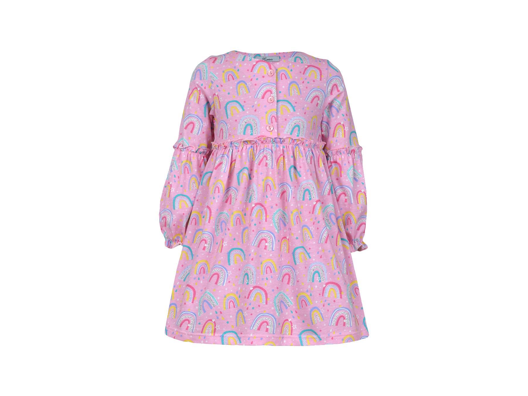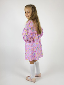 Кулирное полотно (набивка):100% х/б. Платье-силуэт трапеция.Длинный втачной рукав,внизу на резинке(шульная).Завышена линия талии,отрезная юбка.Срезы нижней части рукава и верх юбки со сборкой,обработанны спиральным швом.Горловина обработана обтачкой.Застежка по переду на пуговицы.