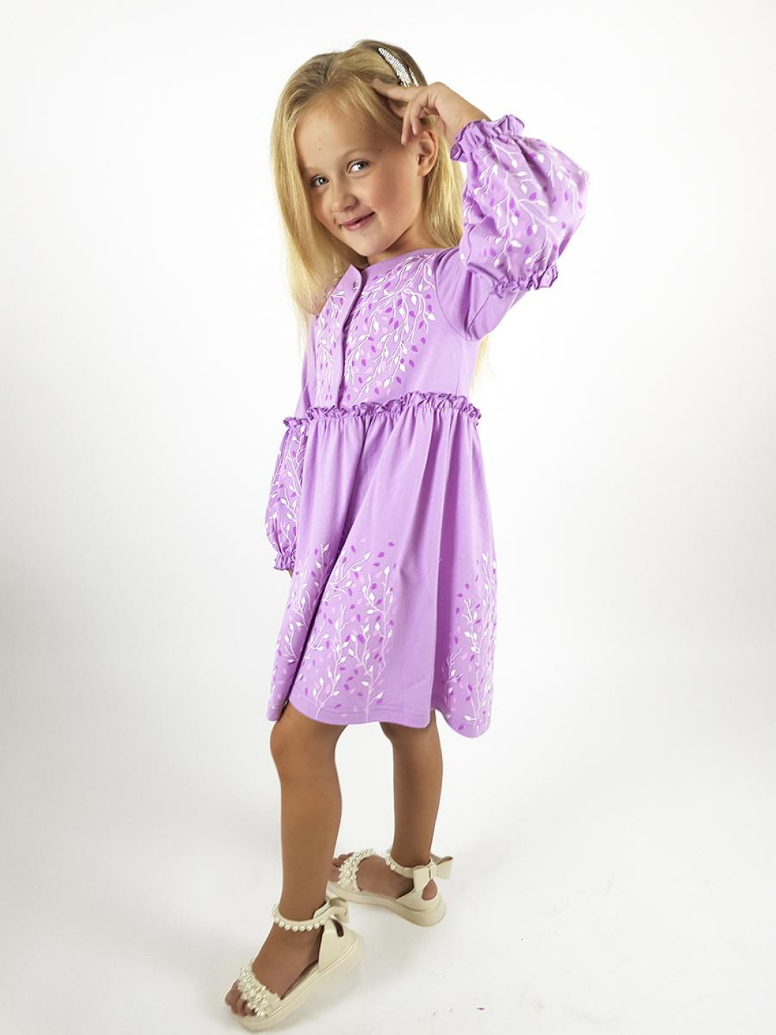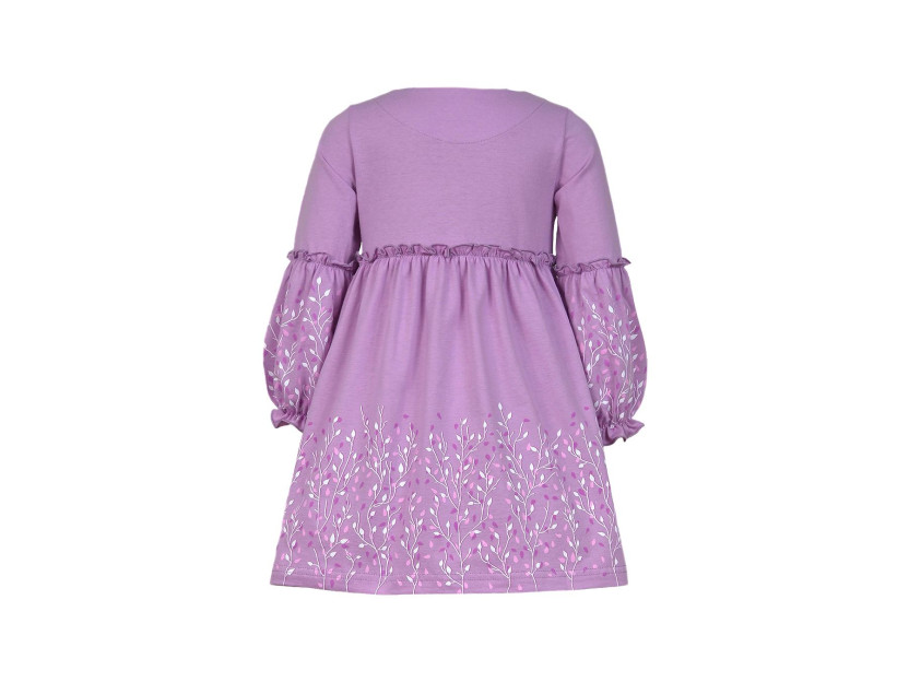 Кулирное полотно:100% х/б. Платье-силуэт трапеция.Длинный втачной рукав,внизу на резинке(шпульная).Завышена линия талии,отрезная юбка.Срезы нижней части рукава и верх юбки со сборкой,обработаны спиральным швом.Печать на переде,рукавах и юбке.Горловина обработана обтачкой.Застежка по переду на пуговицы.