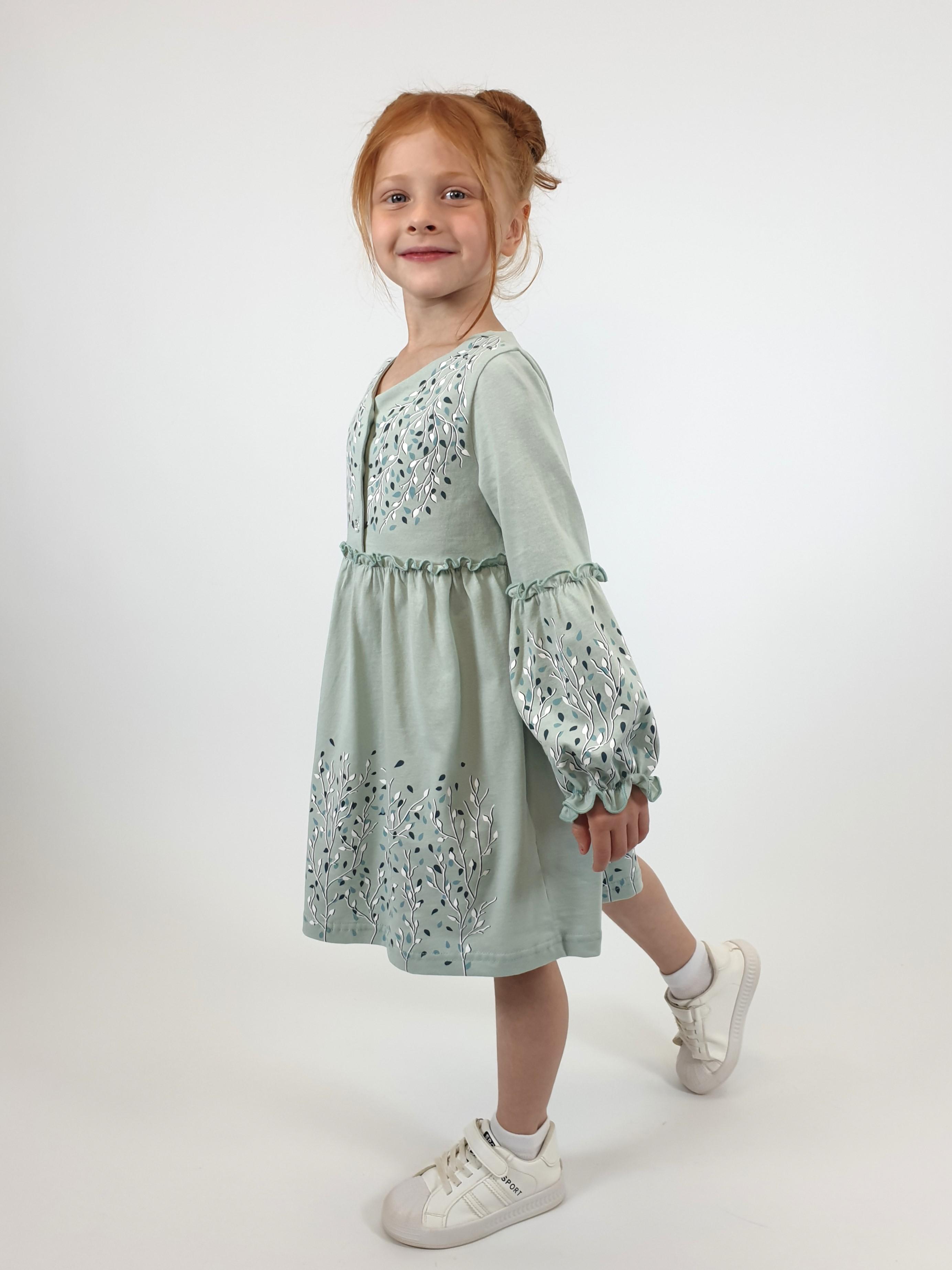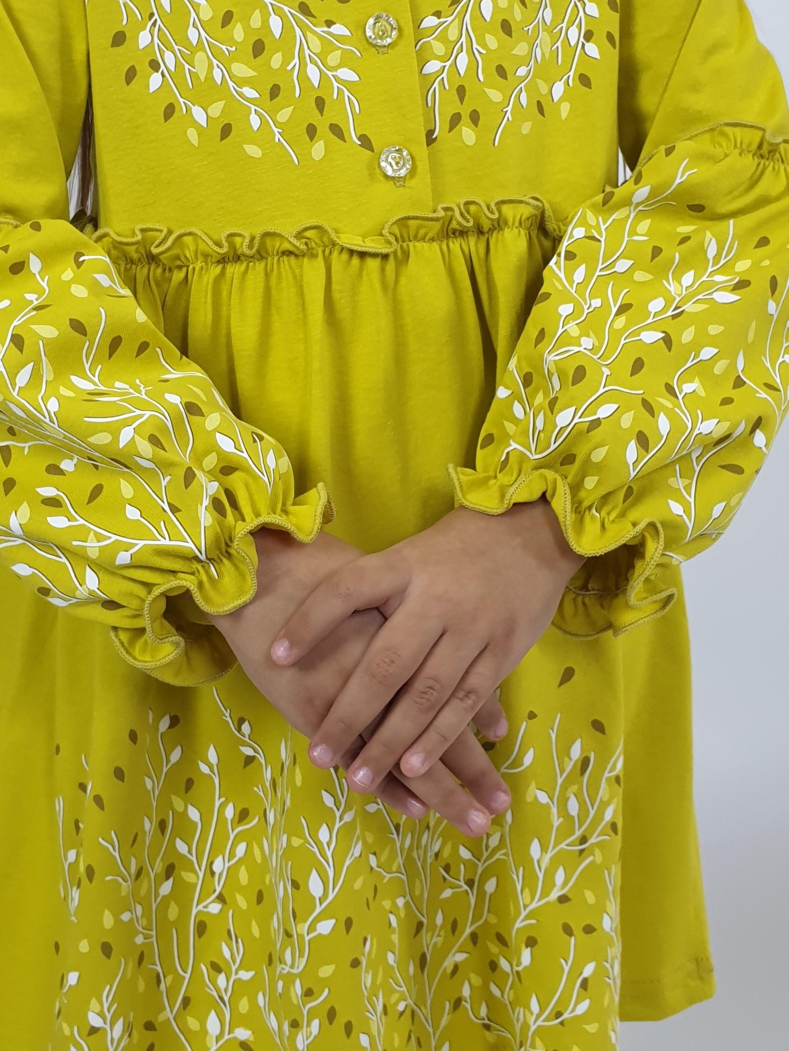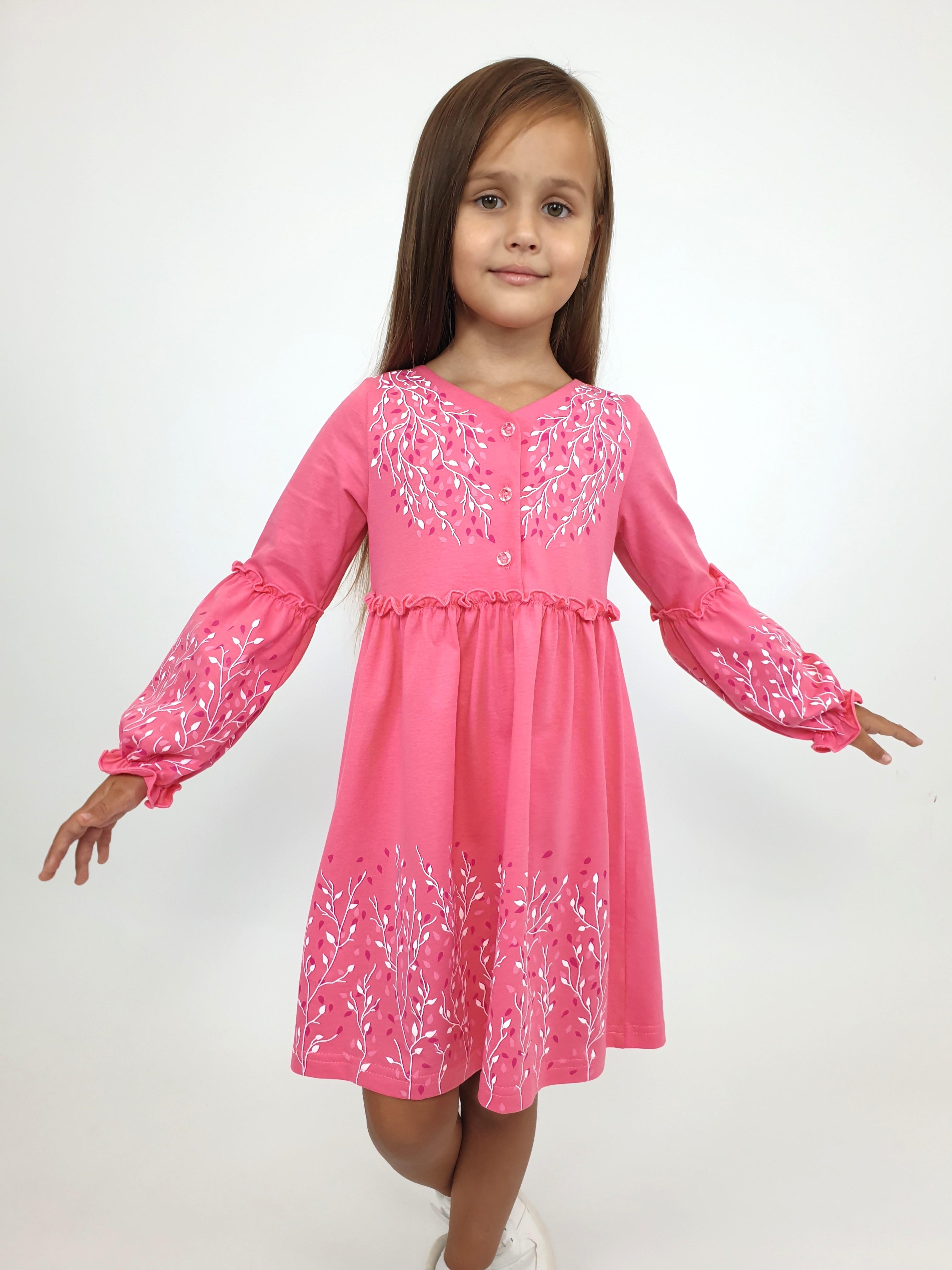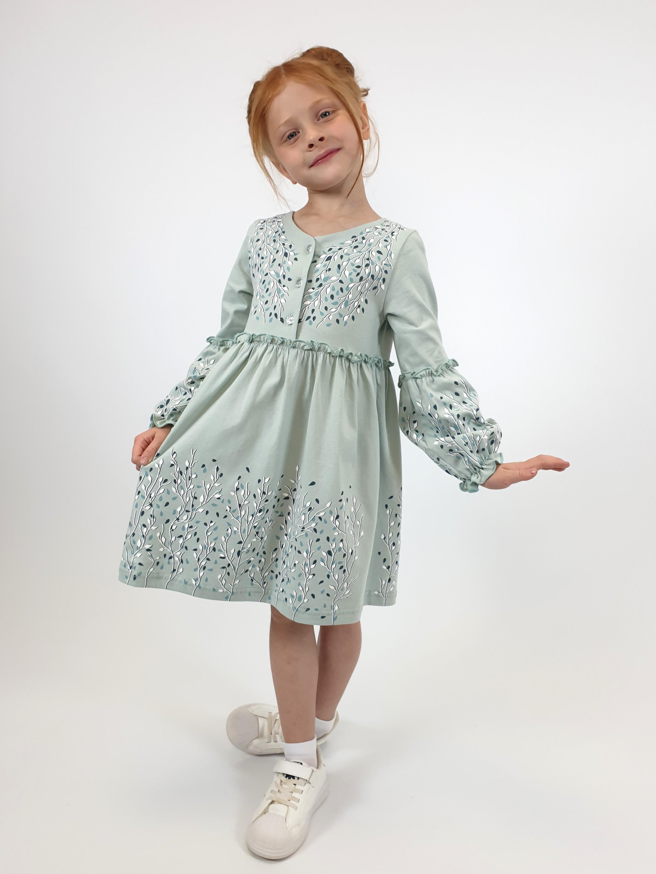 Кулирное полотно:100% х/б. Платье-силуэт трапеция.Длинный втачной рукав,внизу на резинке(шпульная).Завышена линия талии,отрезная юбка.Срезы нижней части рукава и верх юбки со сборкой,обработаны спиральным швом.Печать на переде,рукавах и юбке.Горловина обработана обтачкой.Застежка по переду на пуговицы.