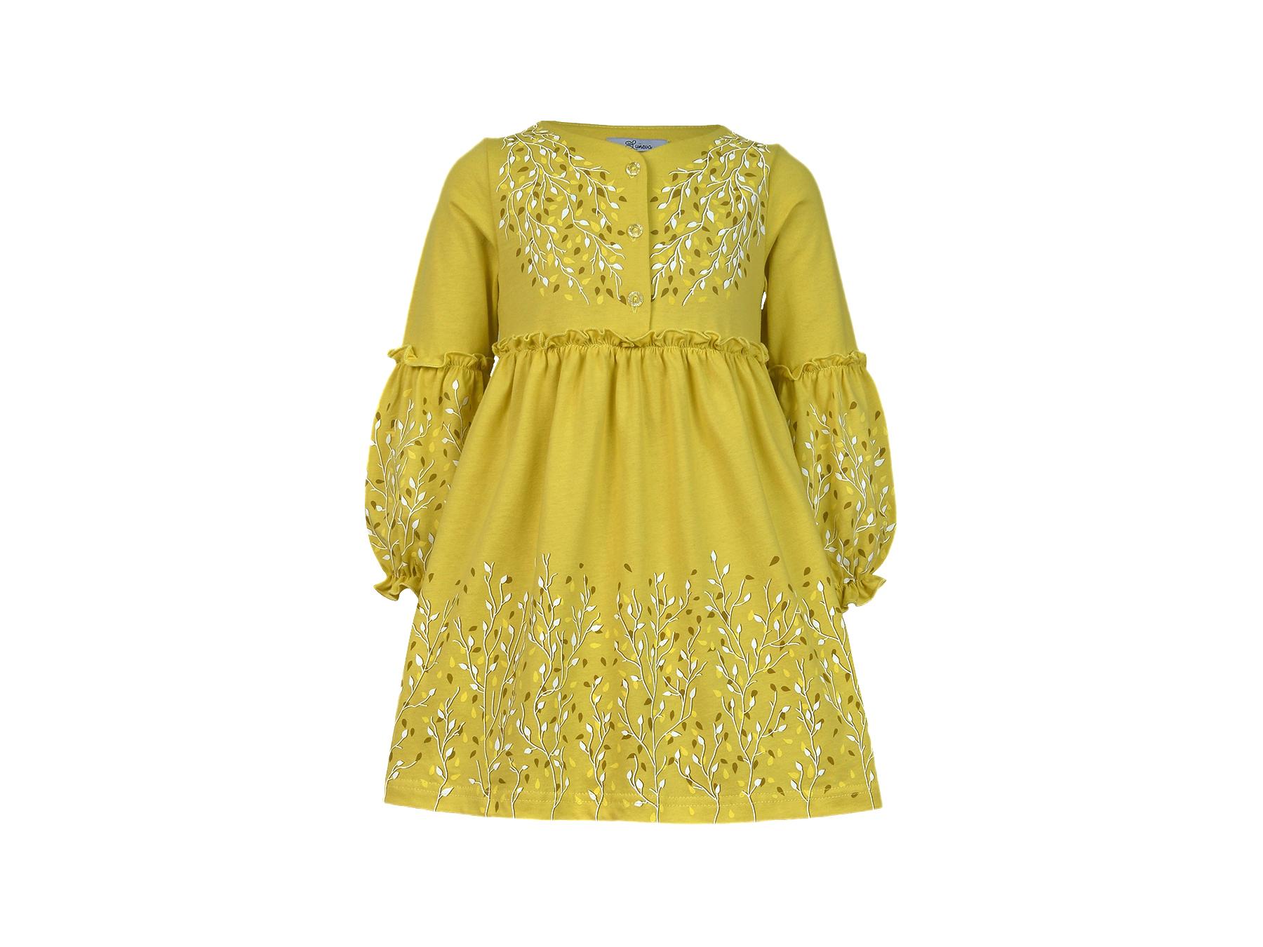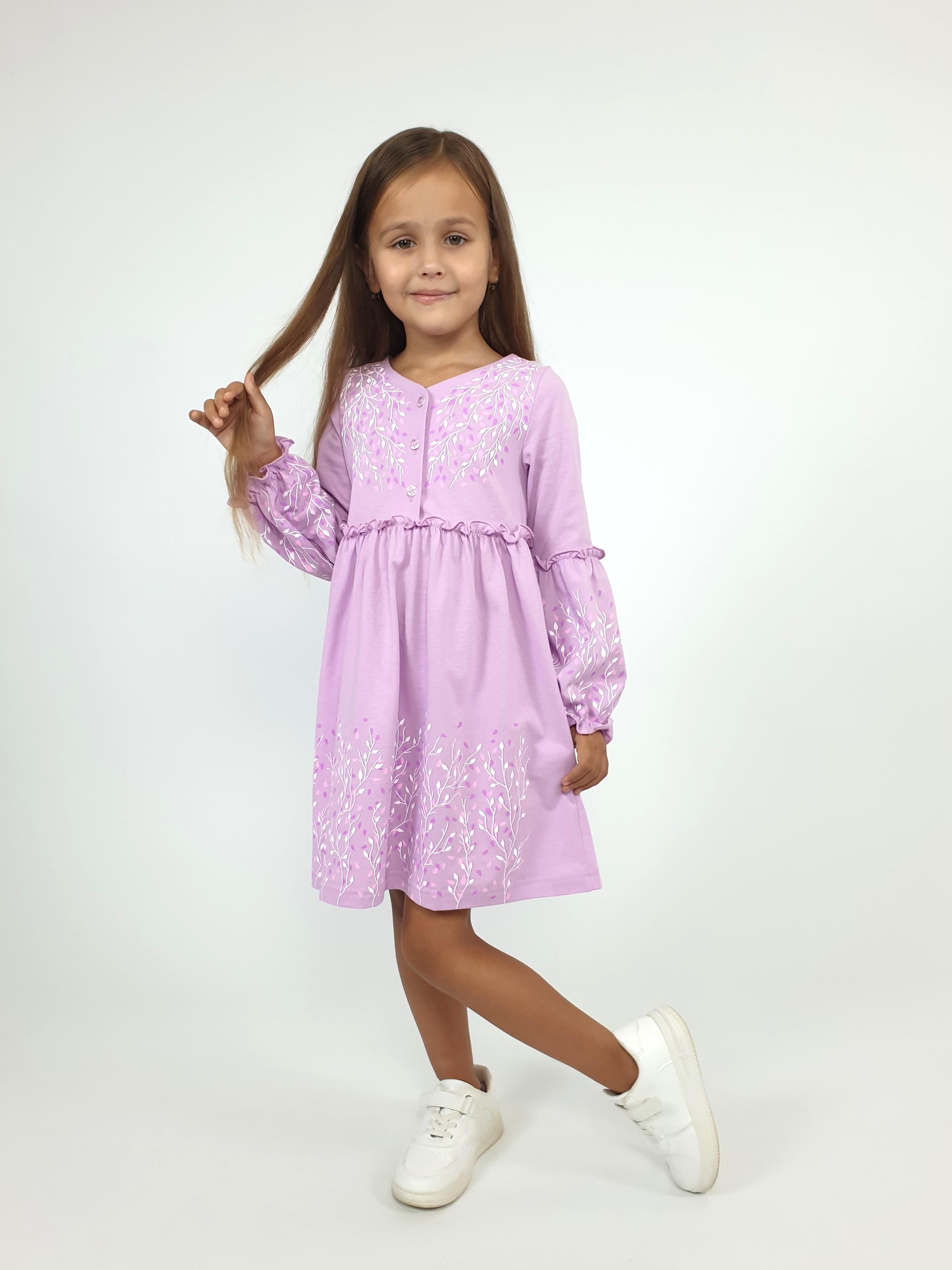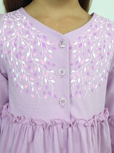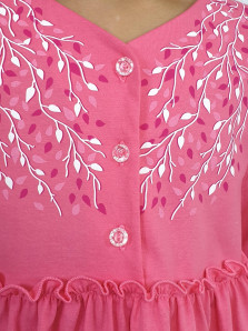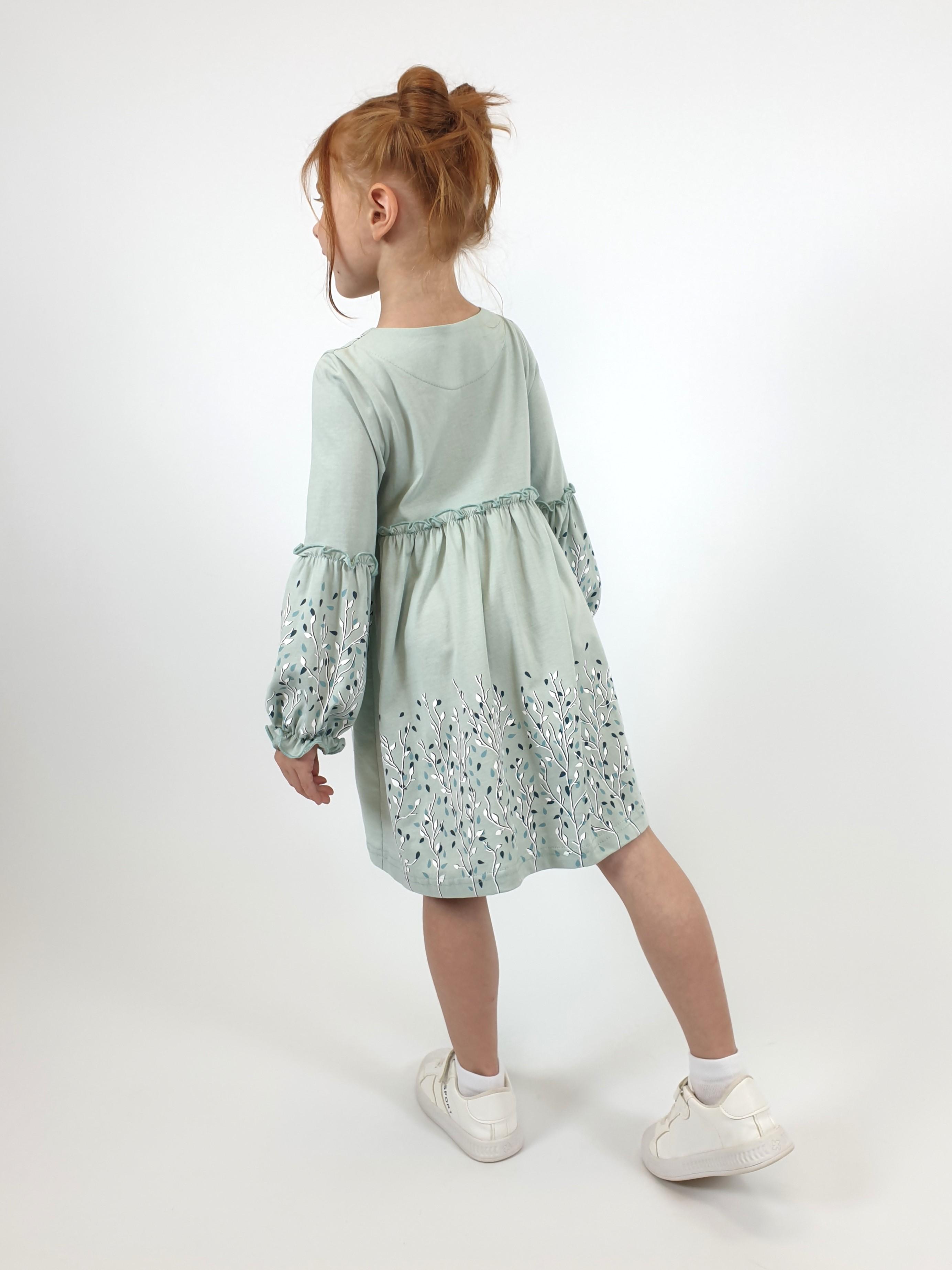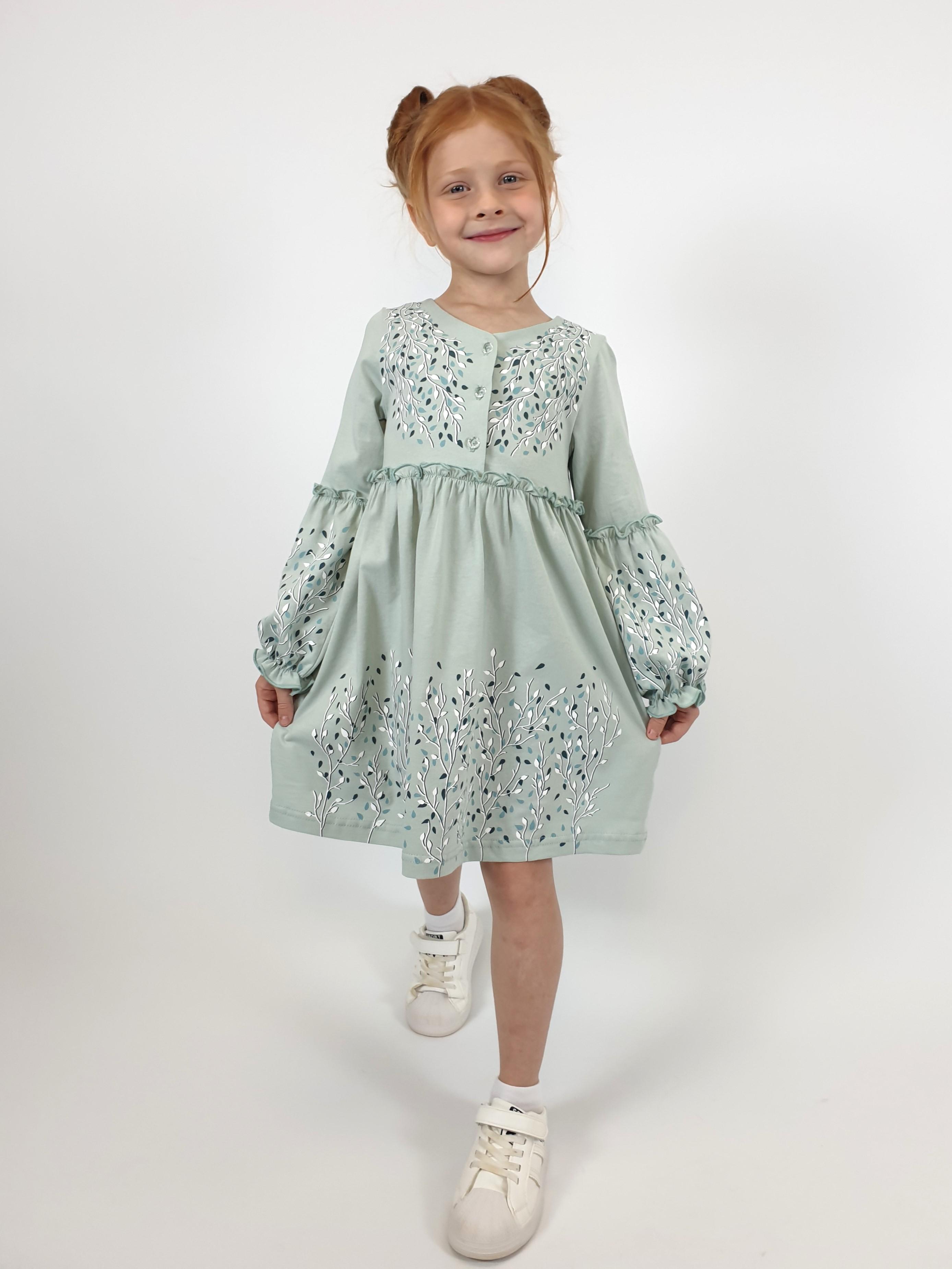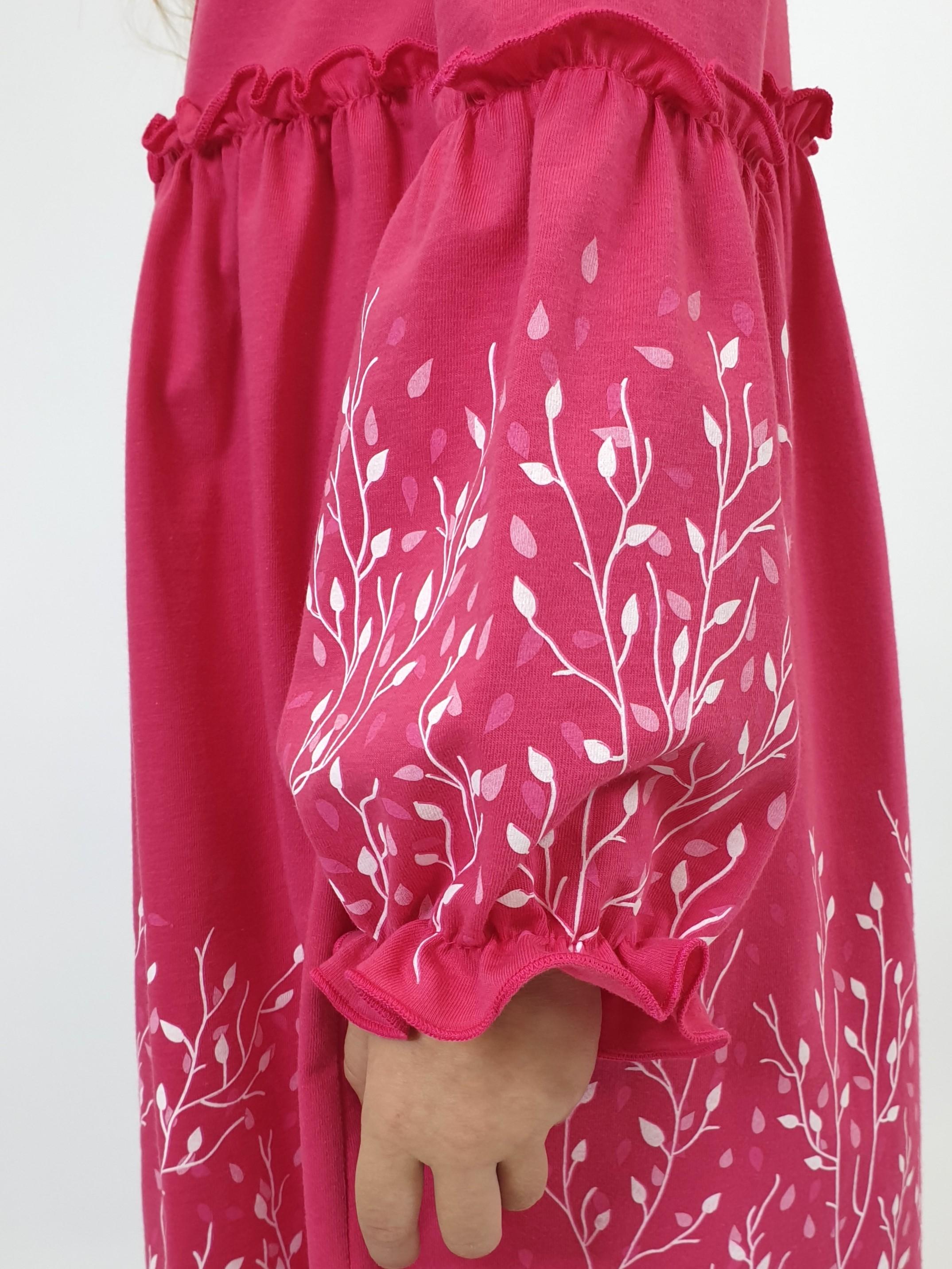 Кулирное полотно:100% х/б. Платье-силуэт трапеция.Длинный втачной рукав,внизу на резинке(шпульная).Завышена линия талии,отрезная юбка.Срезы нижней части рукава и верх юбки со сборкой,обработаны спиральным швом.Печать на переде,рукавах и юбке.Горловина обработана обтачкой.Застежка по переду на пуговицы.