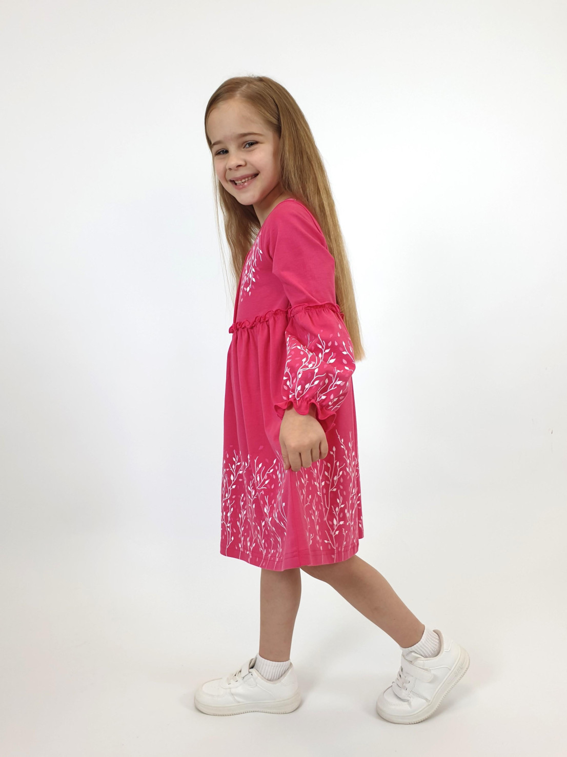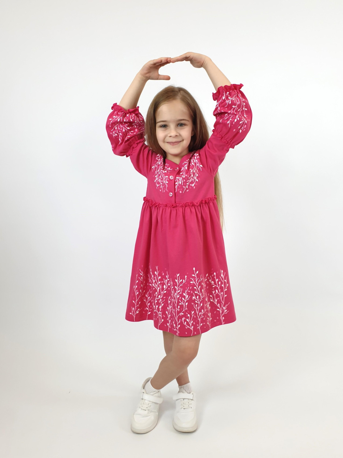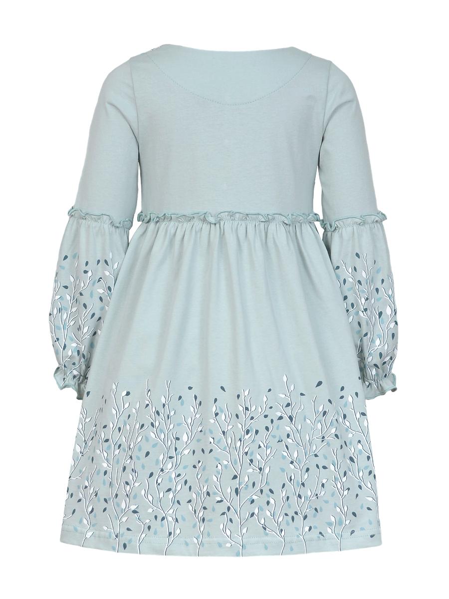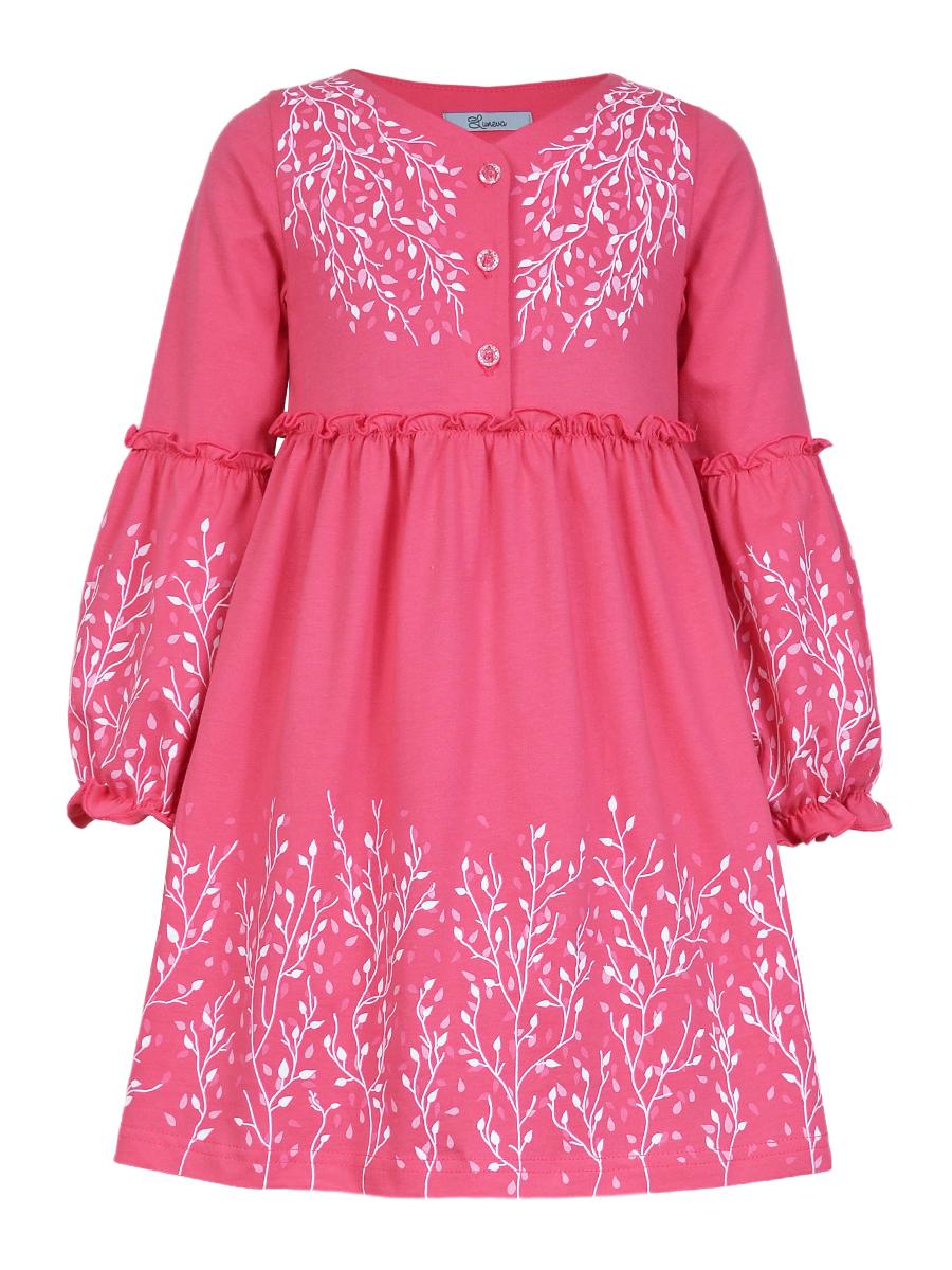 Кулирное полотно:100% х/б. Платье-силуэт трапеция.Длинный втачной рукав,внизу на резинке(шпульная).Завышена линия талии,отрезная юбка.Срезы нижней части рукава и верх юбки со сборкой,обработаны спиральным швом.Печать на переде,рукавах и юбке.Горловина обработана обтачкой.Застежка по переду на пуговицы.