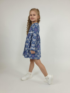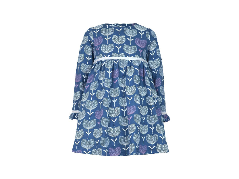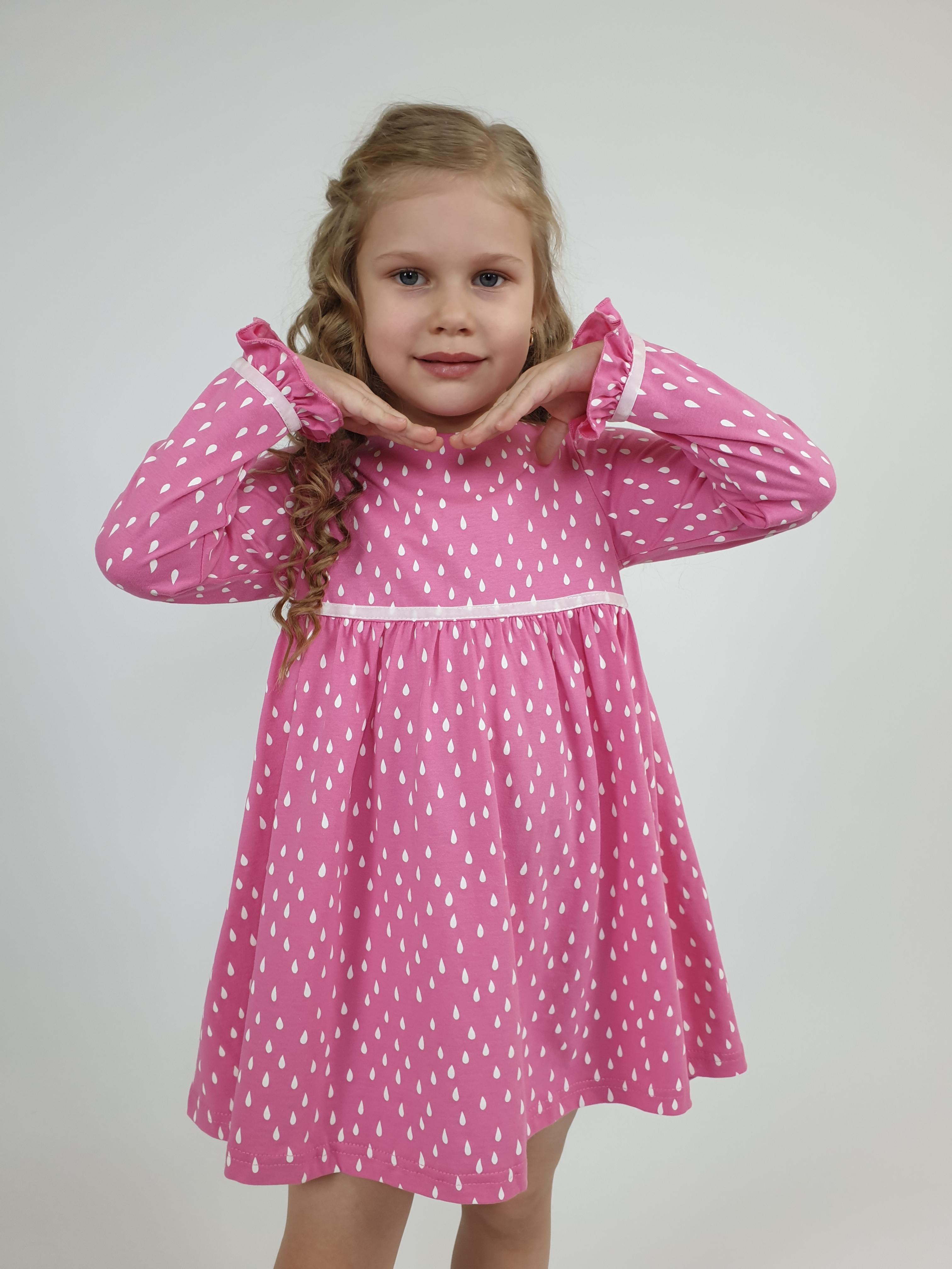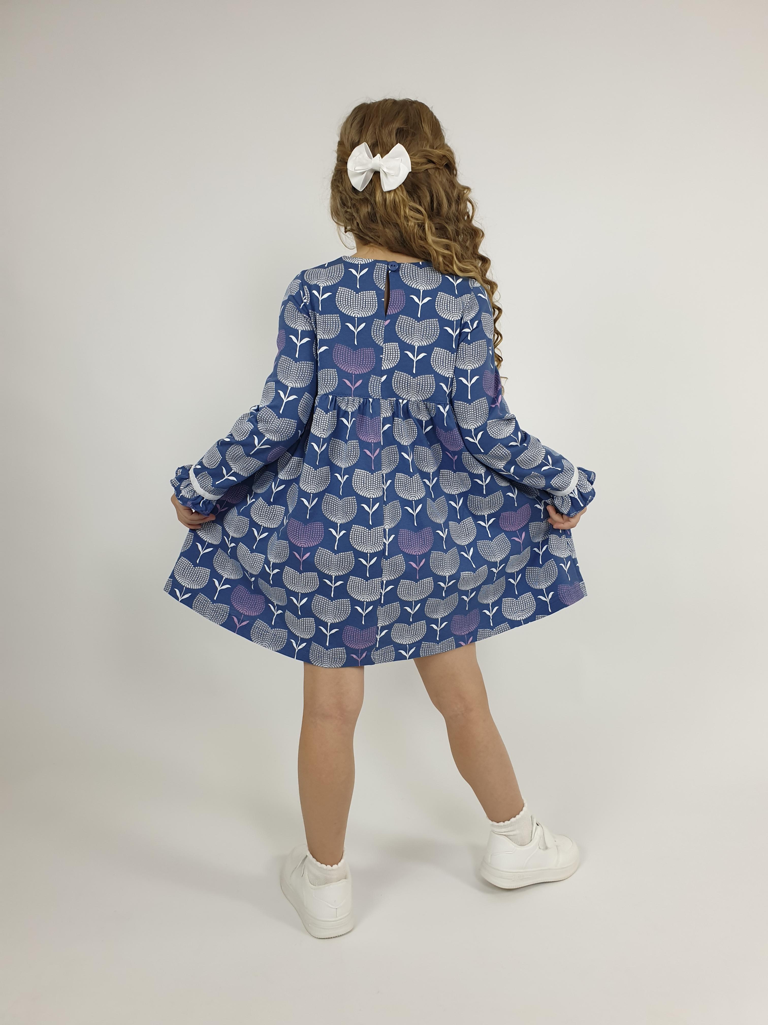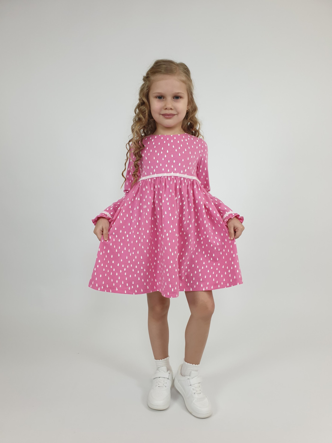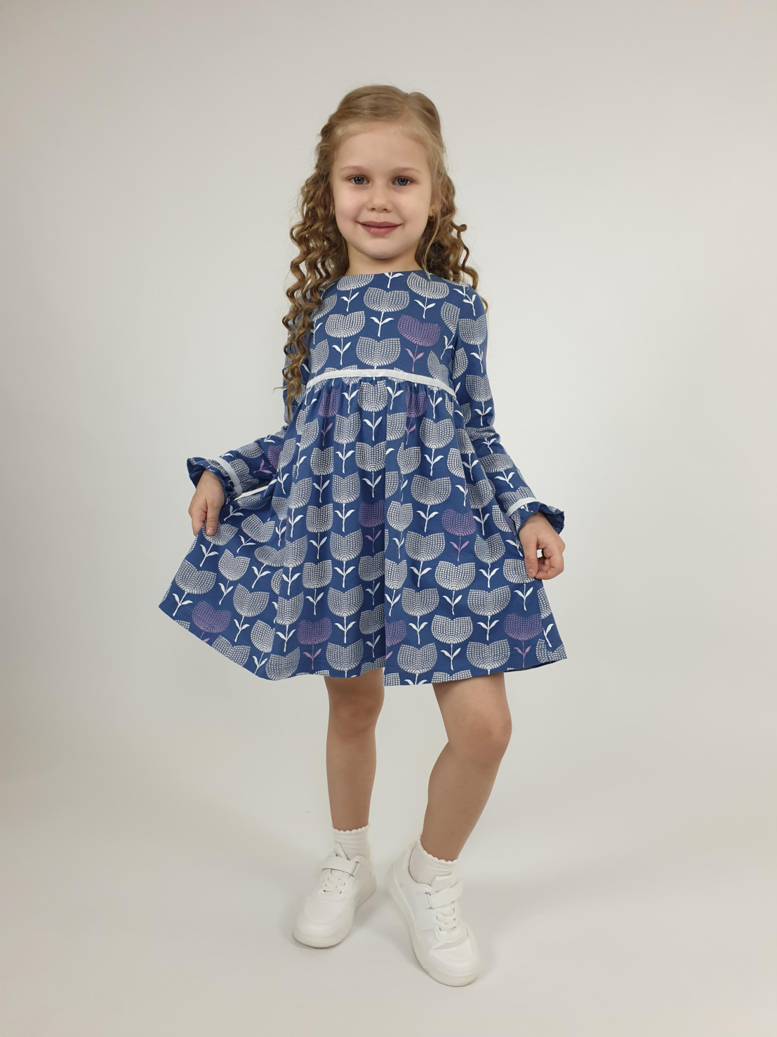 Кулирное полотно:100% х/б. Платье -завышена линия талии с кокеткой и отделочной тесьмой,юбка со сборкой.Рукав втачной длинный с рюшей и отделочной тесьмой.Застежка по спинке на пуговицу.Горловина обработана обтачкой.Низ изделия подшит.