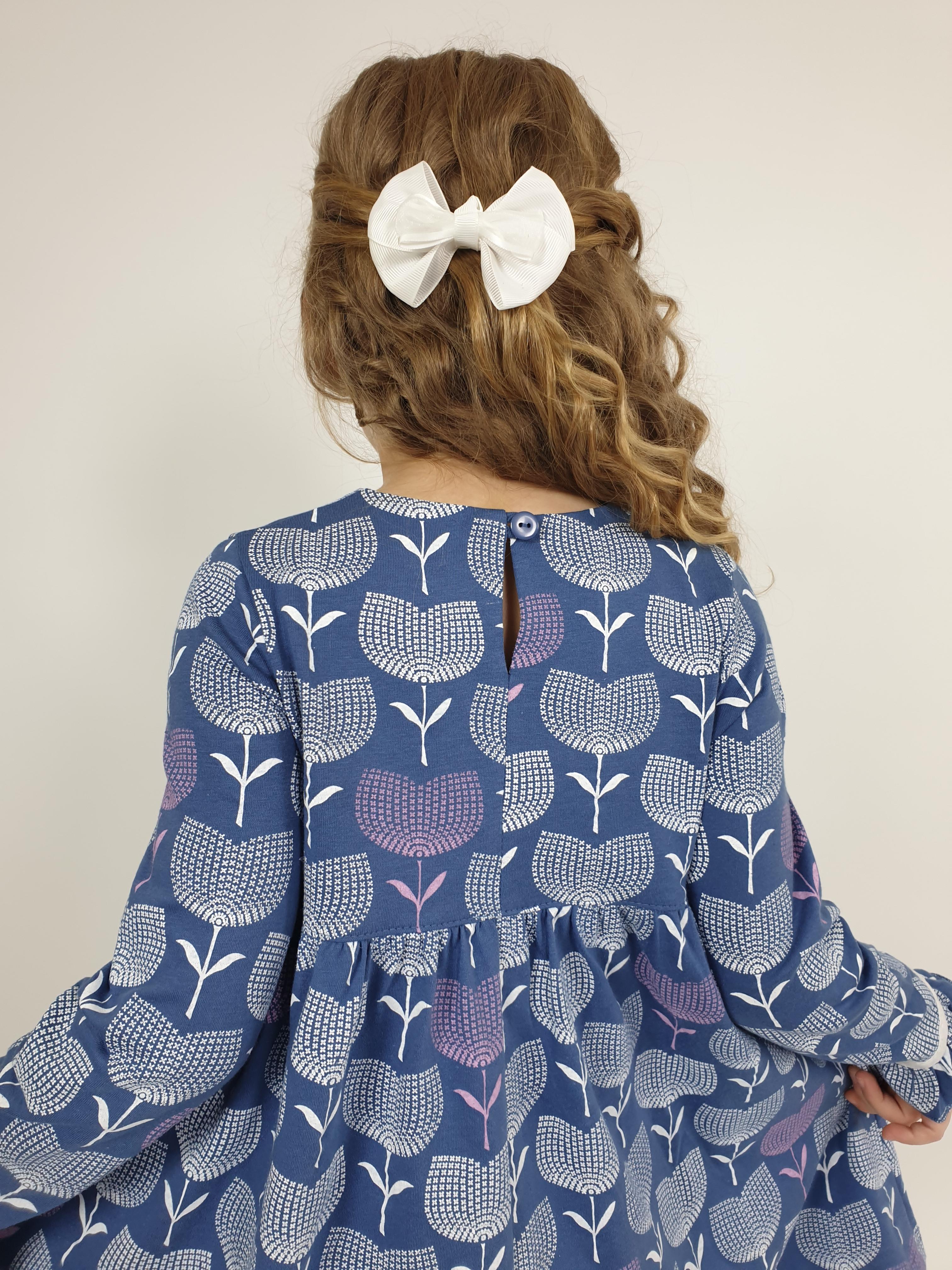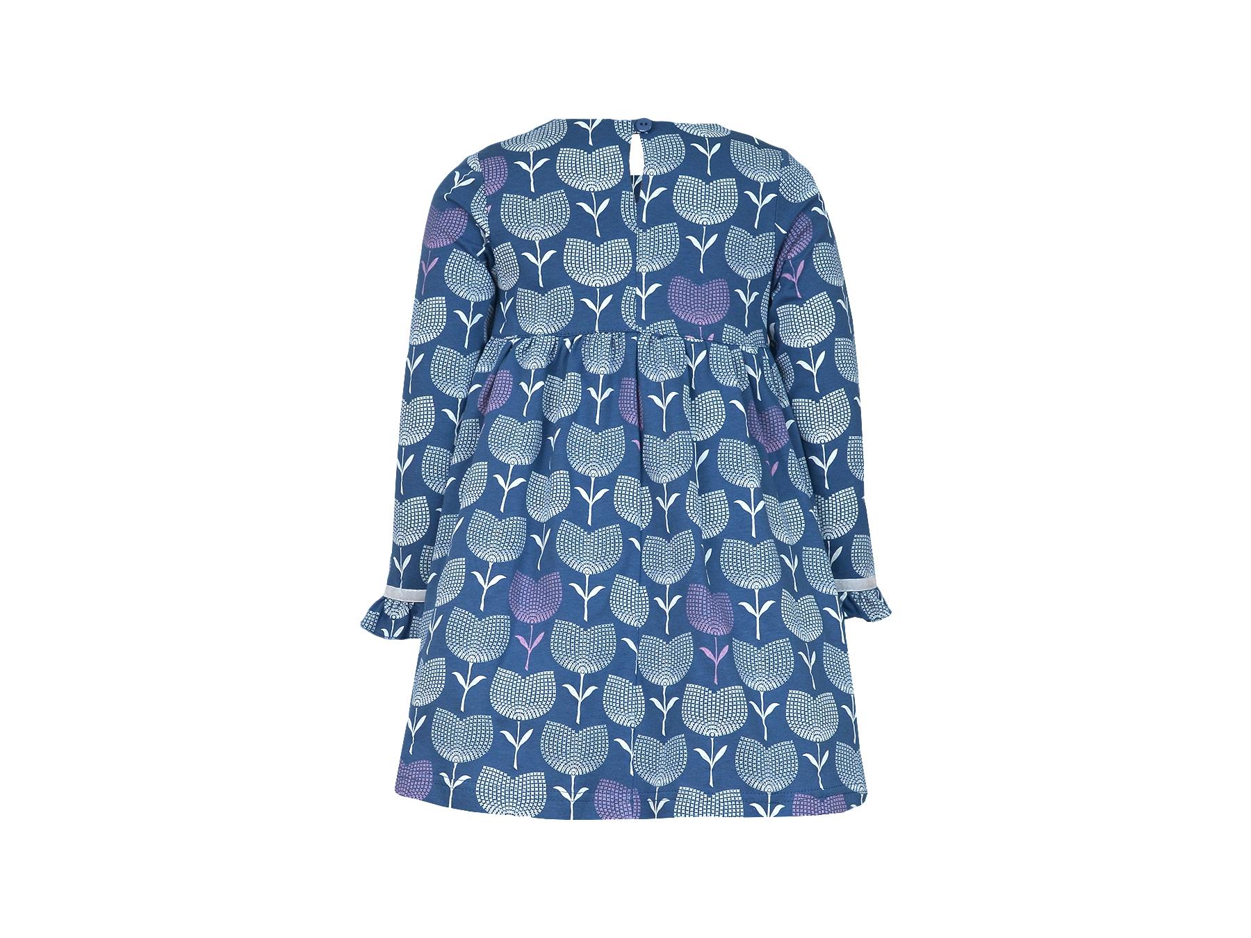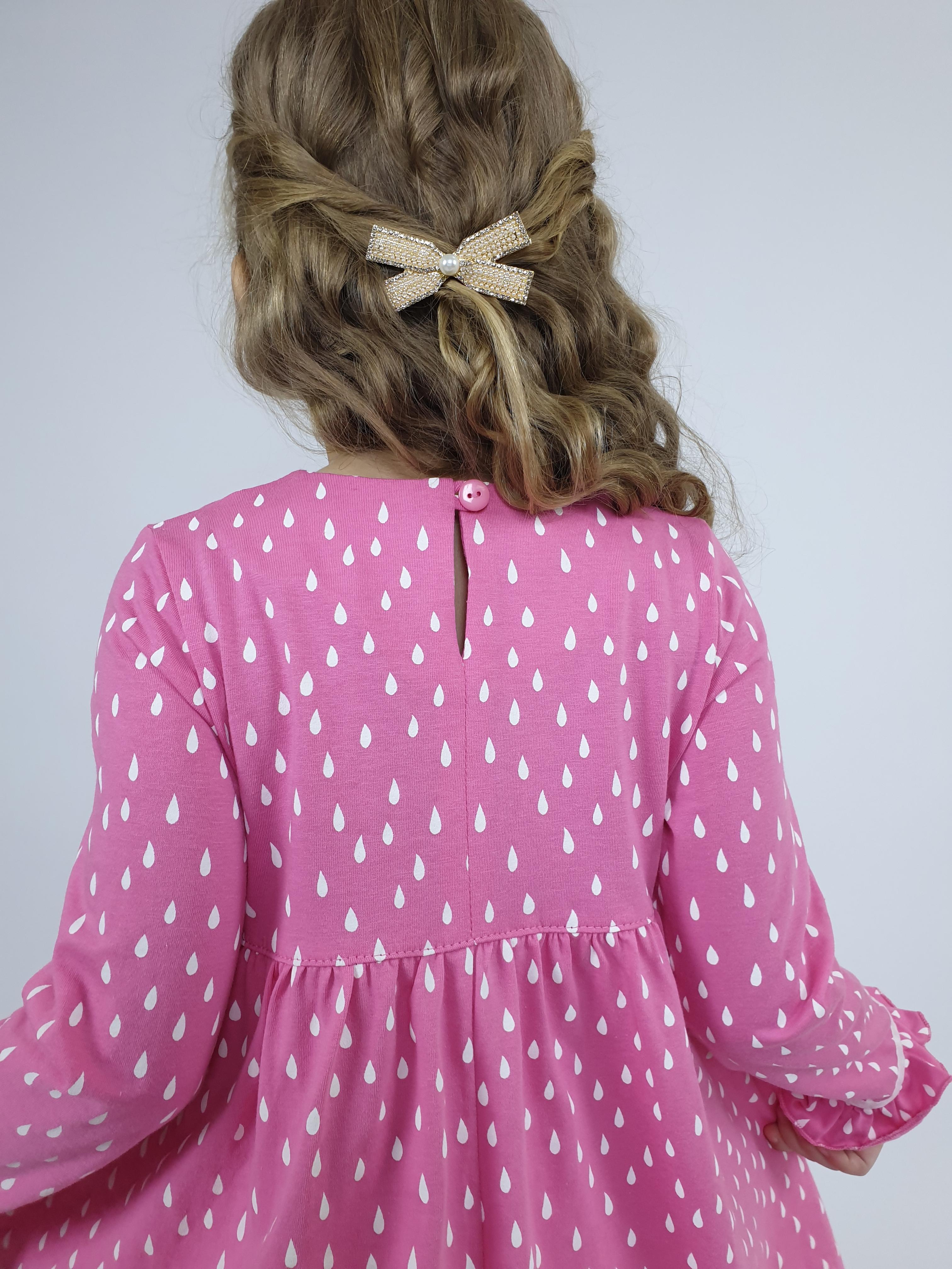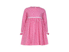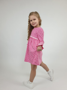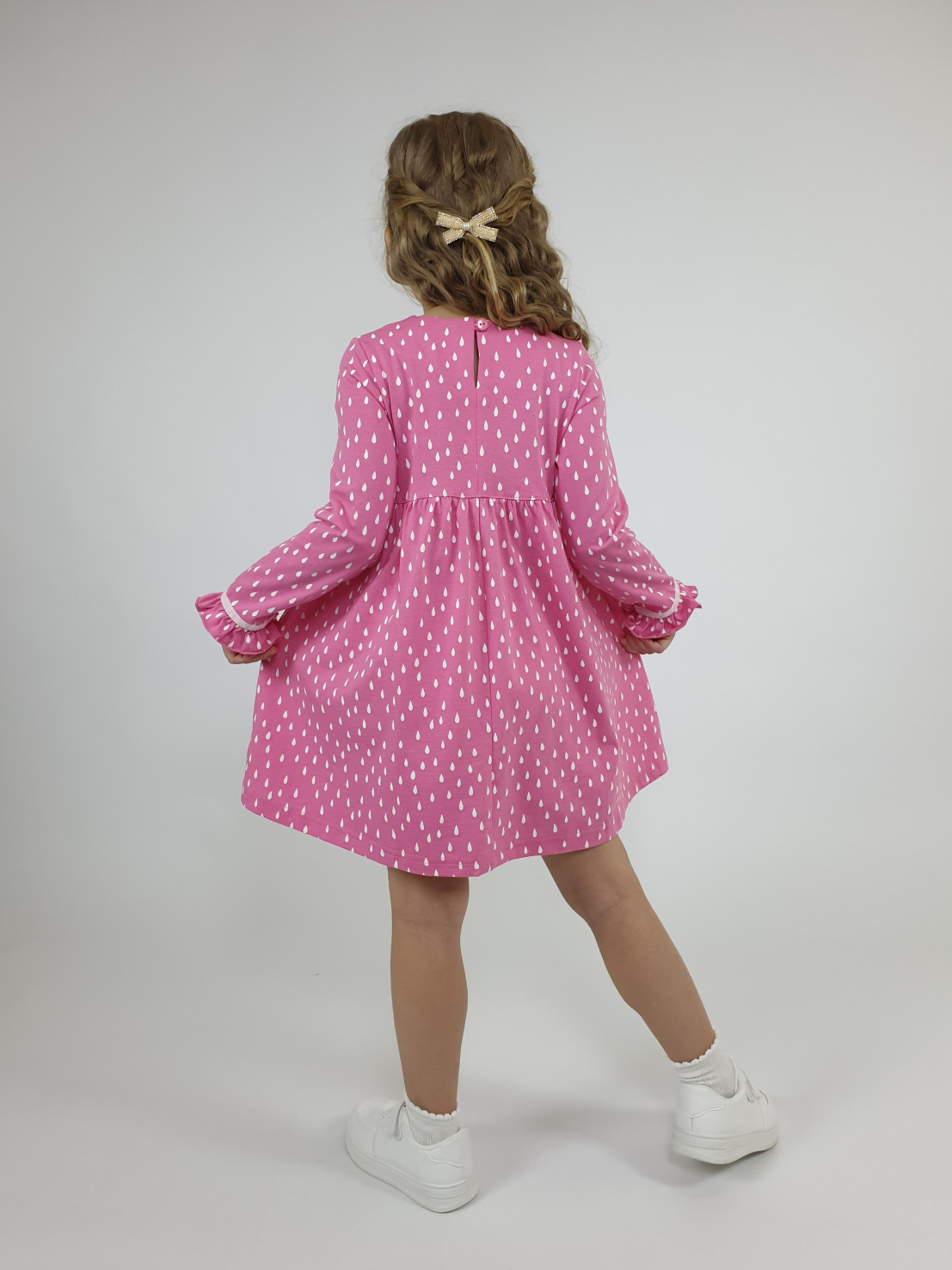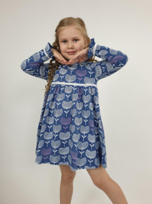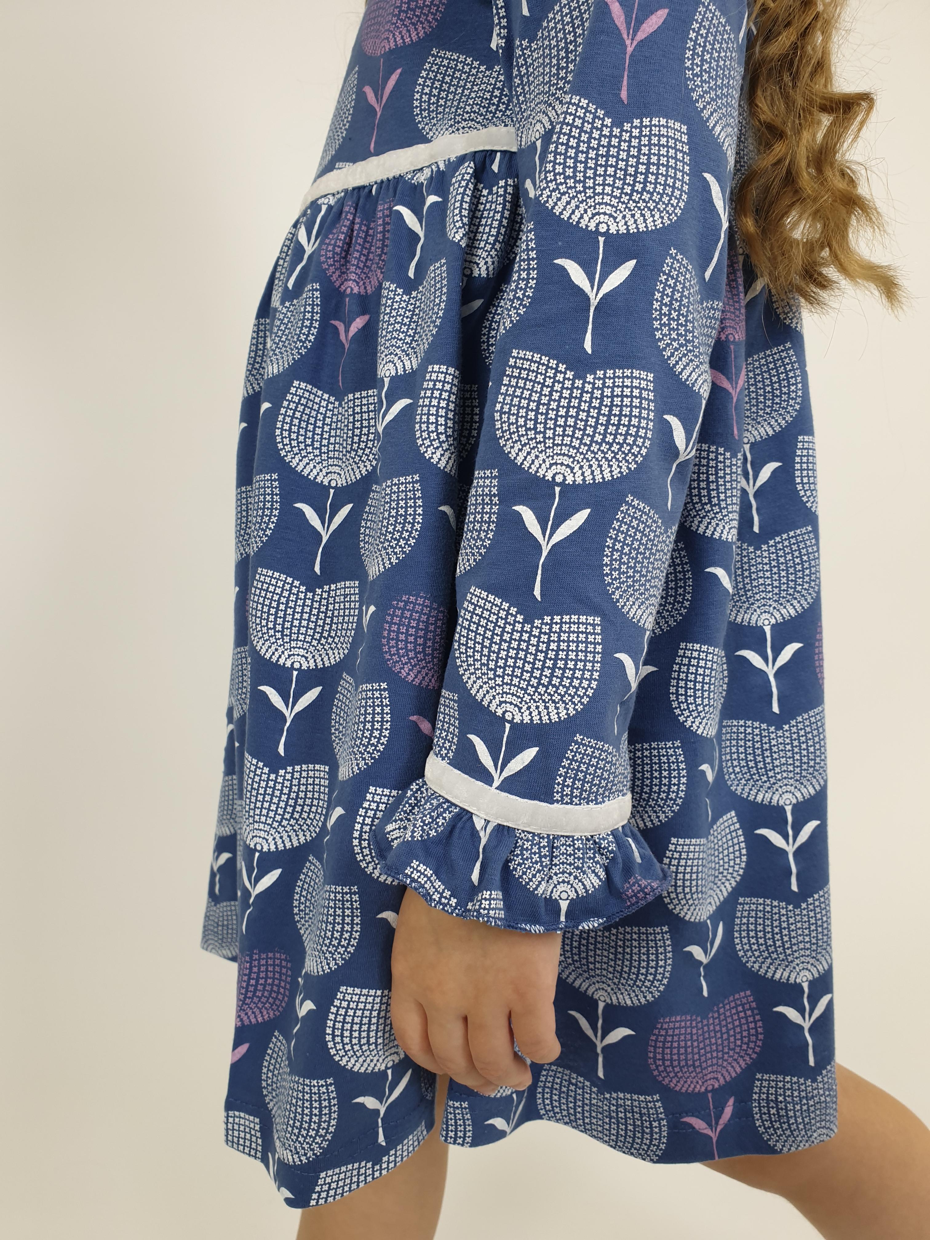 Кулирное полотно:100% х/б. Платье -завышена линия талии с кокеткой и отделочной тесьмой,юбка со сборкой.Рукав втачной длинный с рюшей и отделочной тесьмой.Застежка по спинке на пуговицу.Горловина обработана обтачкой.Низ изделия подшит.