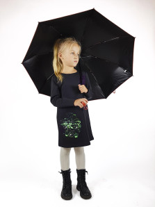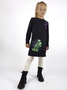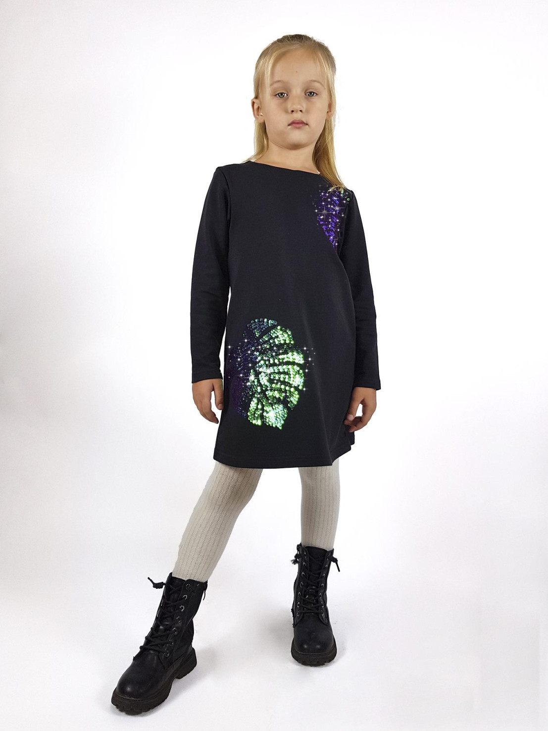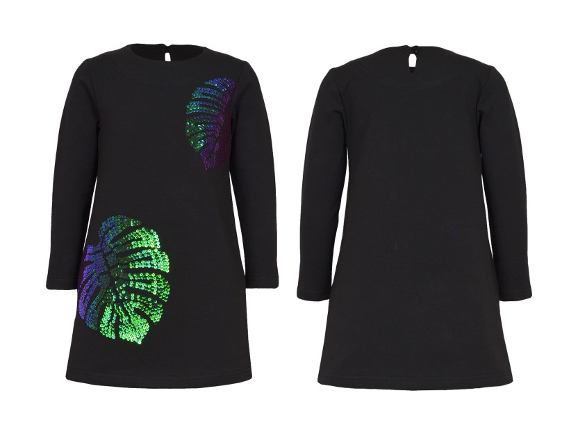 Футер двухнитка:97% х/б.,3% лайкра. Платье-силуэт трапеция,втачной длинный рукав.Вышивка-паетки по переду,горловина обработана обтачкой.Застежка по спинке на пуговицу.