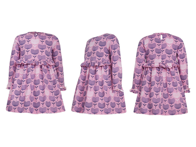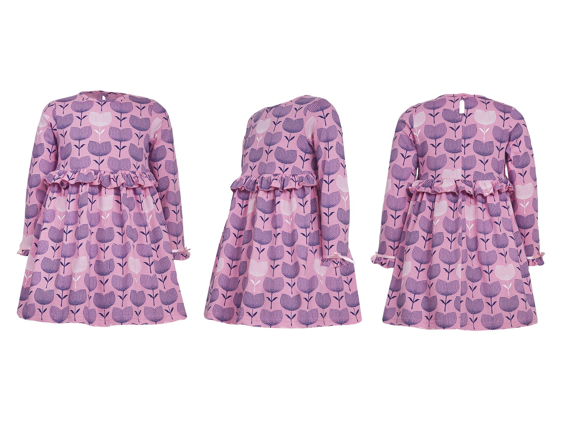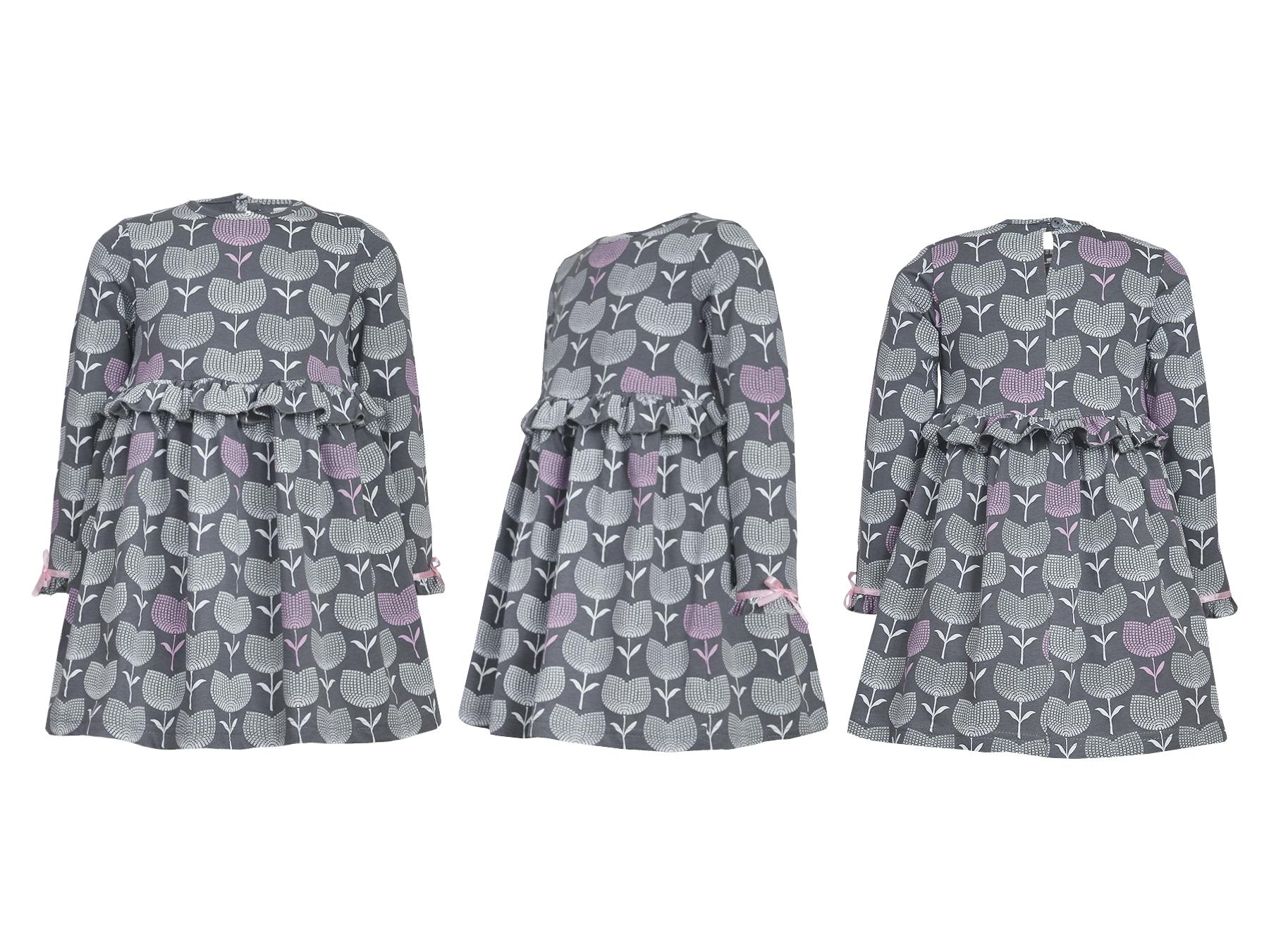 Кулирное полотно:100% х/б. Платье -завышена линия талии с рюшей,юбка со сборкой.Рукав втачной длинный с рюшей и отделочной тесьмой.Застежка по спинке на пуговицу.Горловина окантована.Низ изделия подшит.