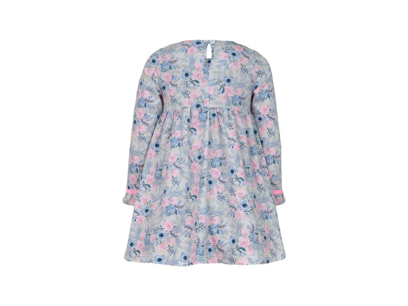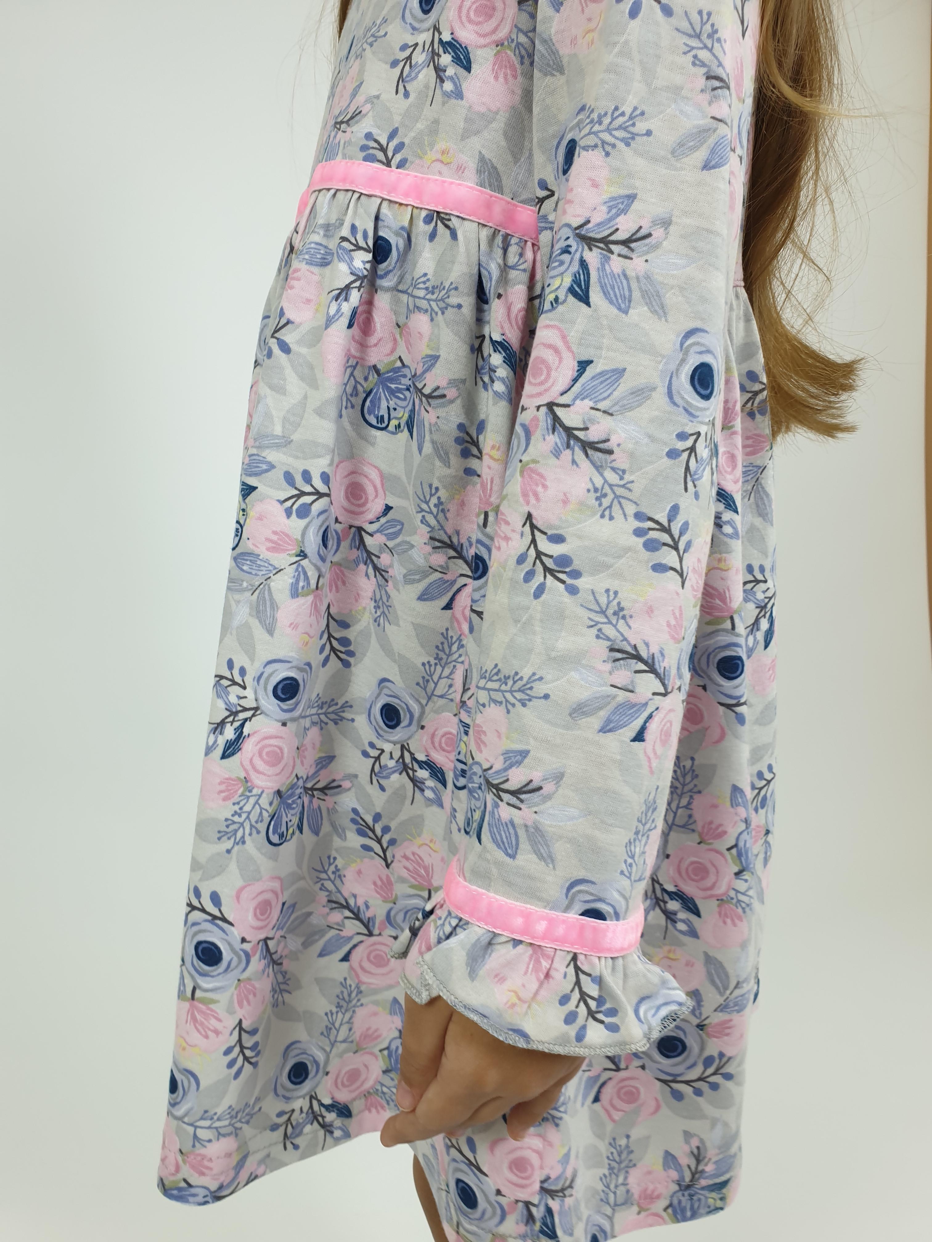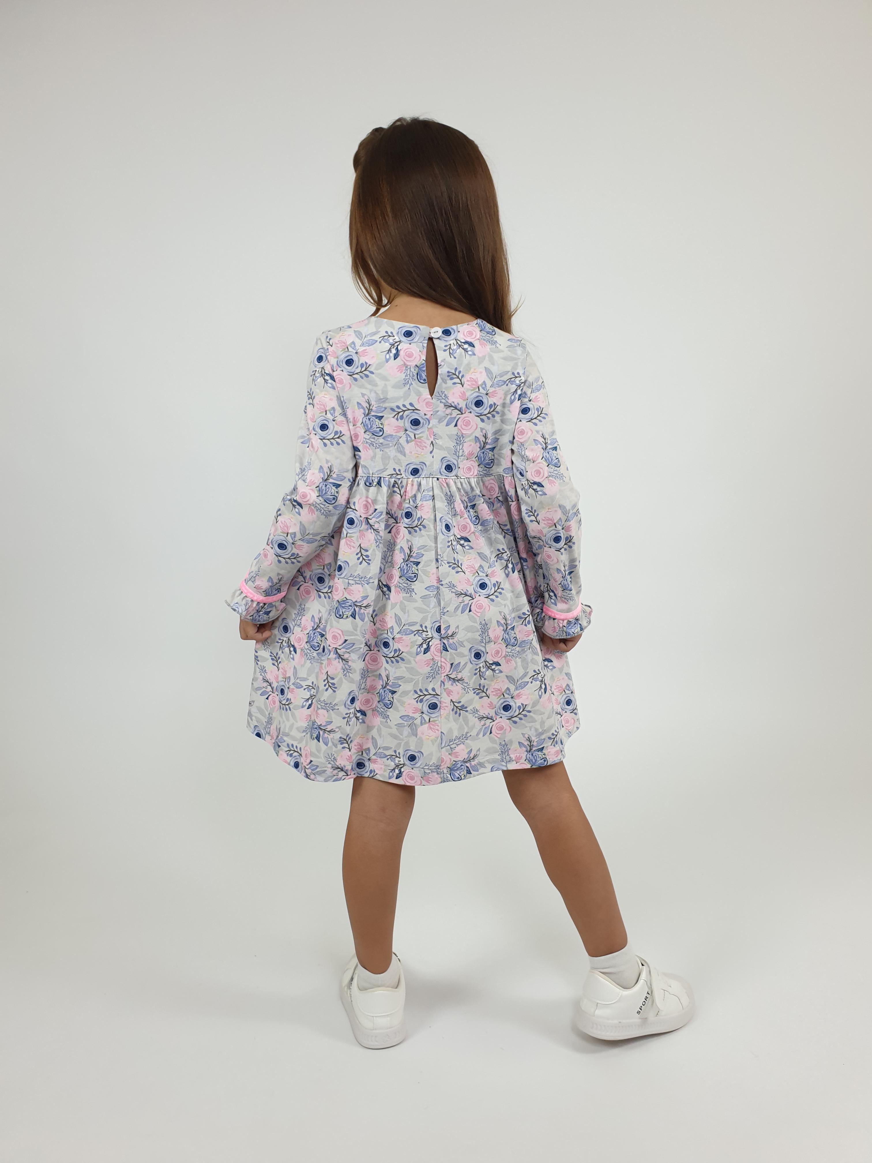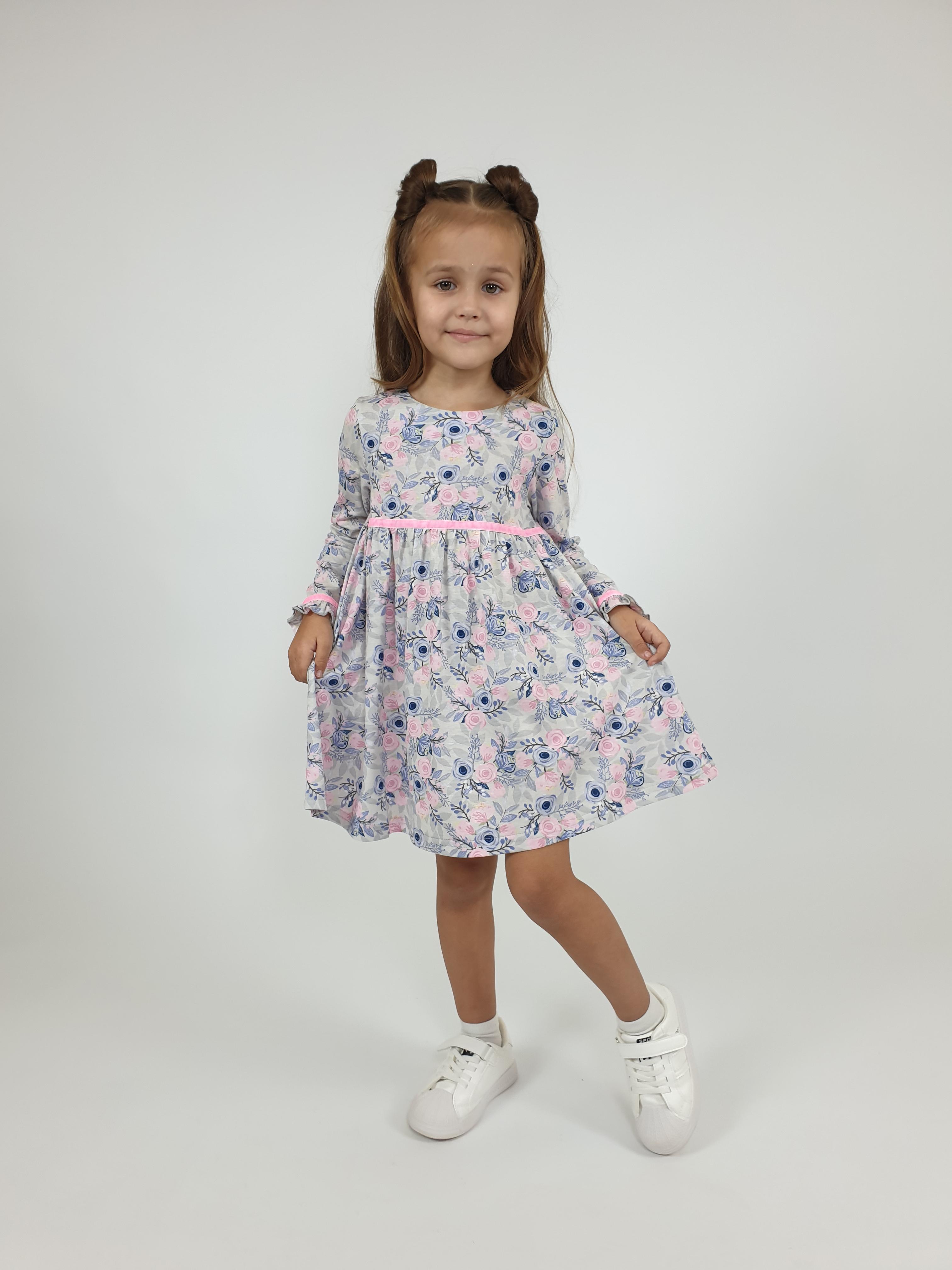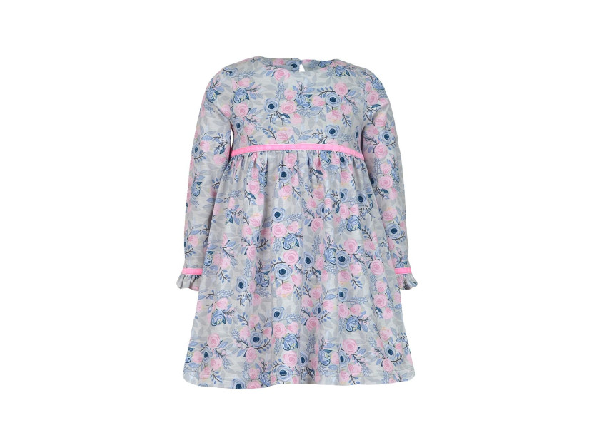 Кулирное полотно:100% х/б. Платье -завышена линия талии с кокеткой и отделочной тесьмой,юбка со сборкой.Рукав втачной длинный с рюшей и отделочной тесьмой.Застежка по спинке на пуговицу.Горловина обработана обтачкой.Низ изделия подшит.