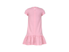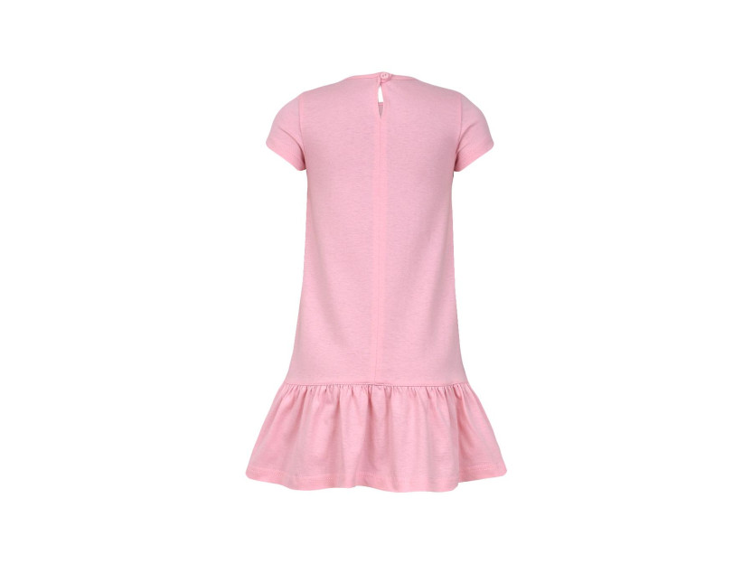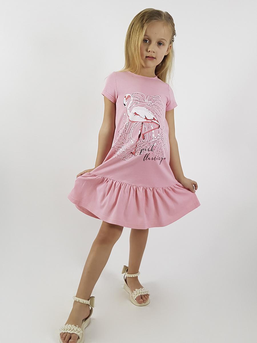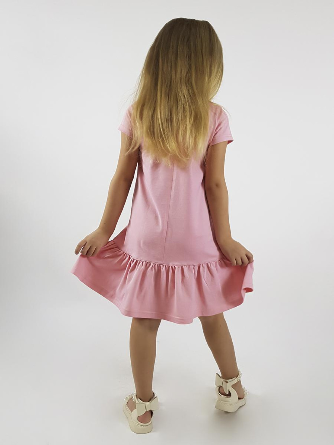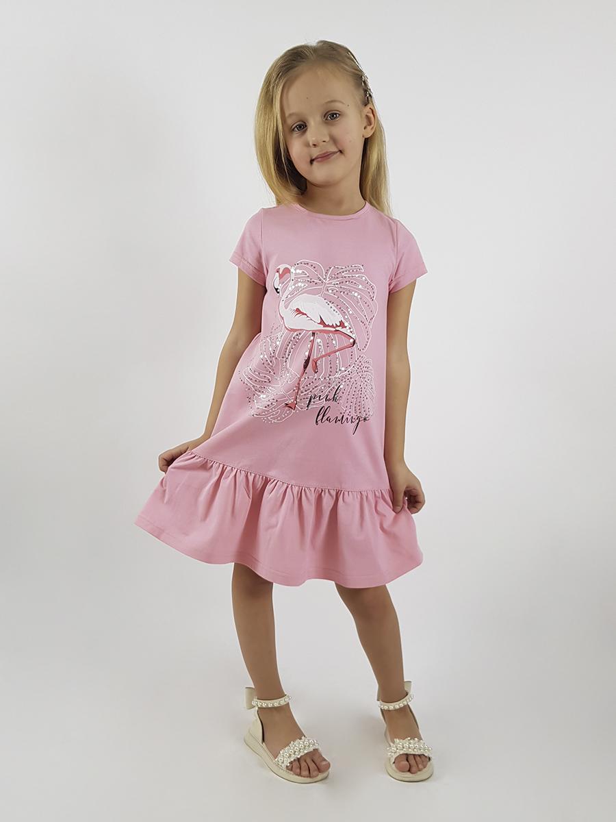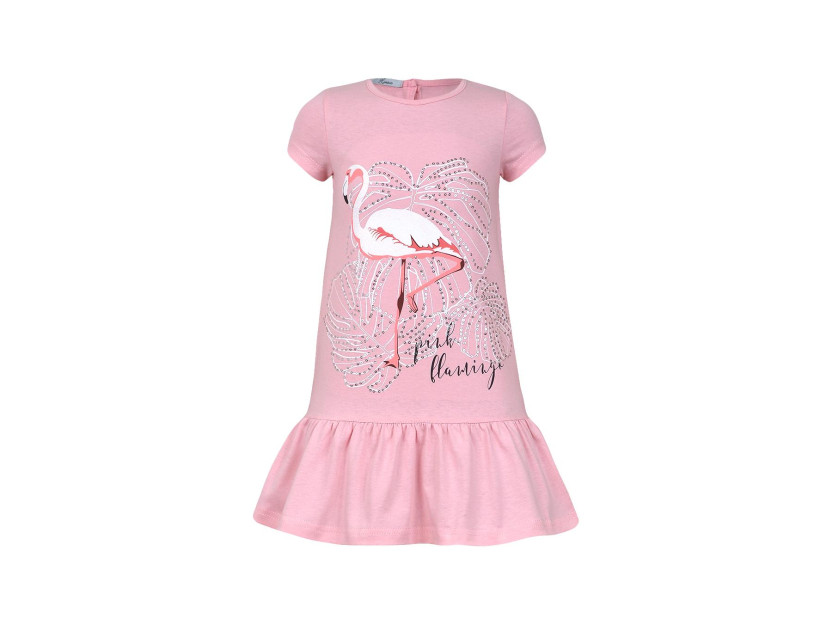 Кулирное полотно: 100% х/б. Платье-силуэт трапеция,короткий рукав,внизу волан.Печать и вышивка(пайетки)на переде.Горловина окантована,застежка по спинке на пуговицу.Ярлык на спинке.