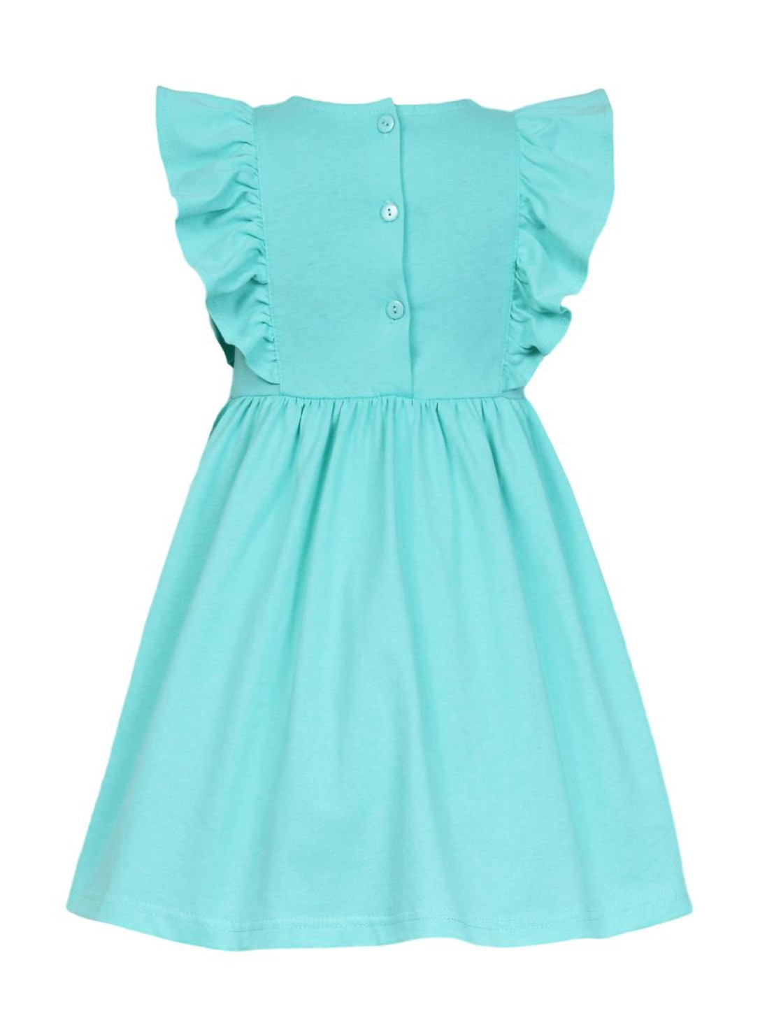 Кулирное полотно:100% х/б. Платье- полуприлегающего силуэта. Отрезная юбка со сборкой, рельефы с рюшей. Печать на переде. Горловина окантована и подшита, застежка сзади на пуговицы.