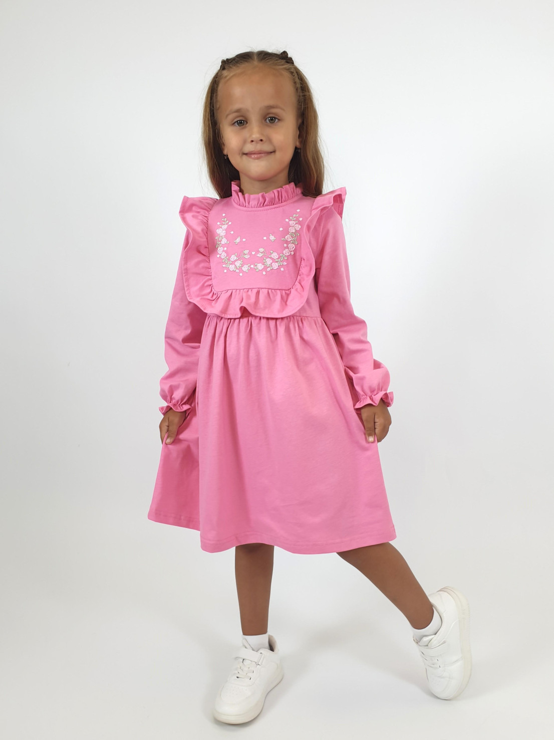 Кулирное полотно (гладь):100%х/б. Платье-отрезная юбка в сборку,кокетка переда и рельефы спинки с рюшей.Рукав длинный,внизу на резинке(венгерке).В горловине рюша со сгибом,шов окантован и подшит.Застежка по спинке на пуговицу.Кокетка с вышивкой.