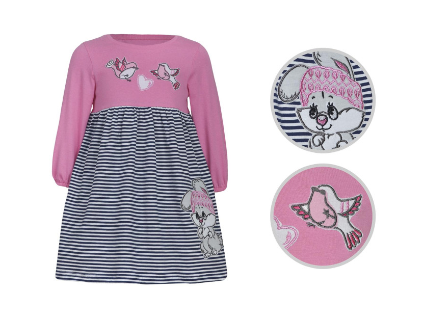 Кулирное полотно:100% х/б. Платье-перед и спинка с кокеткой,сборка по верху юбки.Рукав 3/4,внизу на резинке.Горловина обработана ластиком.По кокетке переда и на юбке вышивка-аппликация.