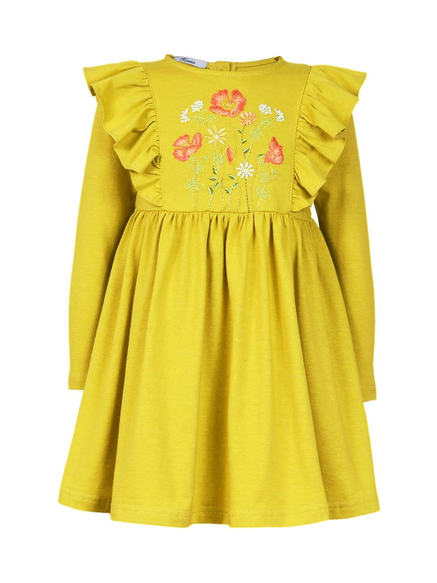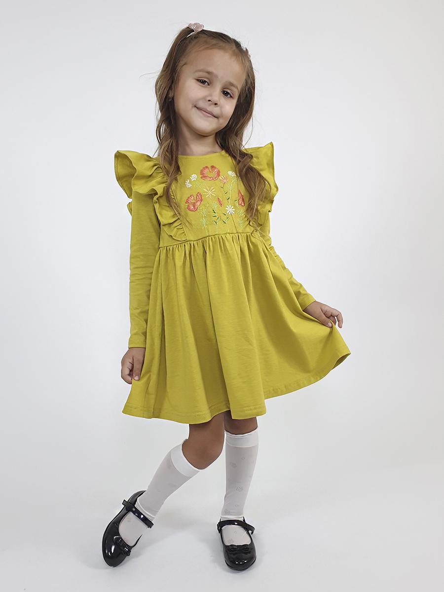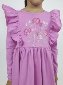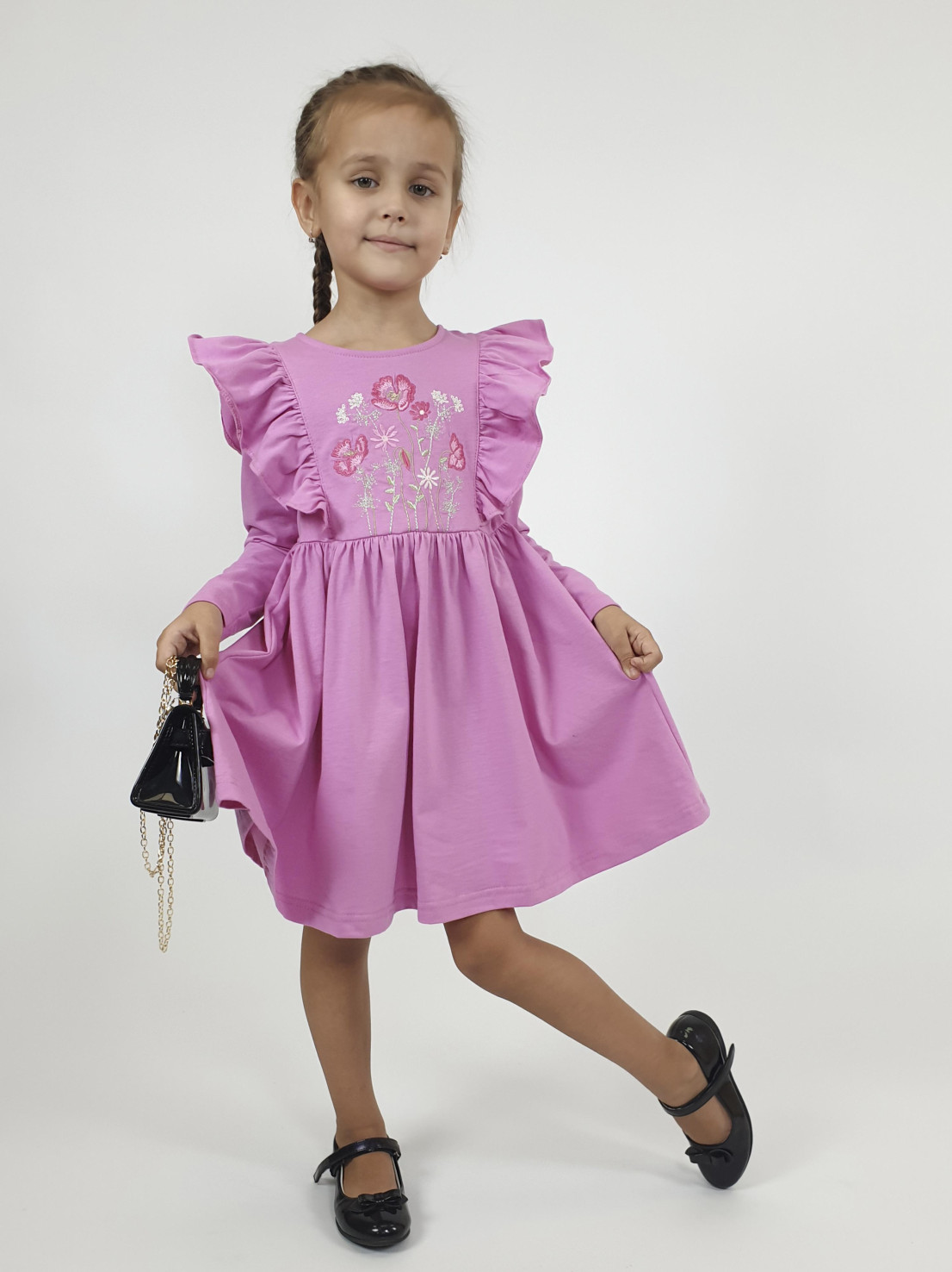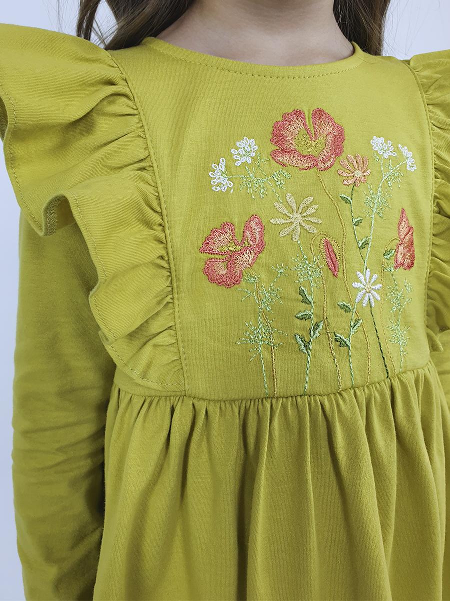 Кулирное полотно:100%х/б. Платье-полуприлегающего силуэта,длинный рукав.Отрезная юбка со сборкой,рельефы с рюшей.Вышивка на центральной части переда.Горловина окантована и подшита,застежка сзади на пуговицы.