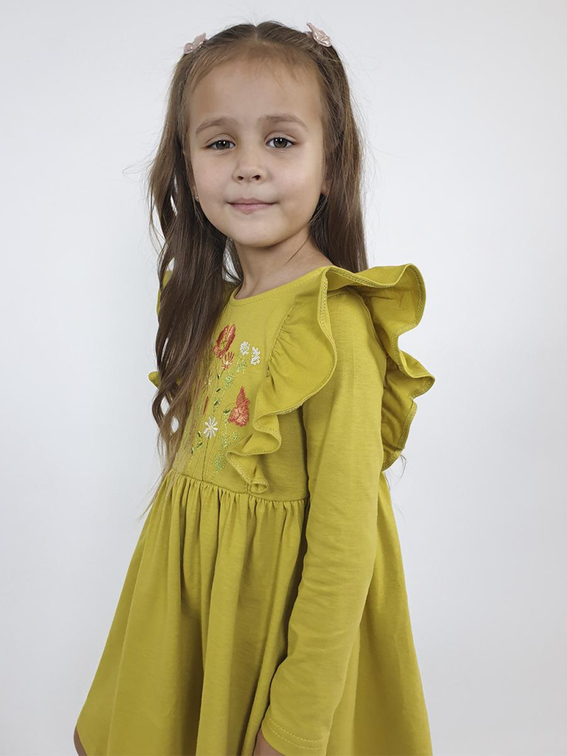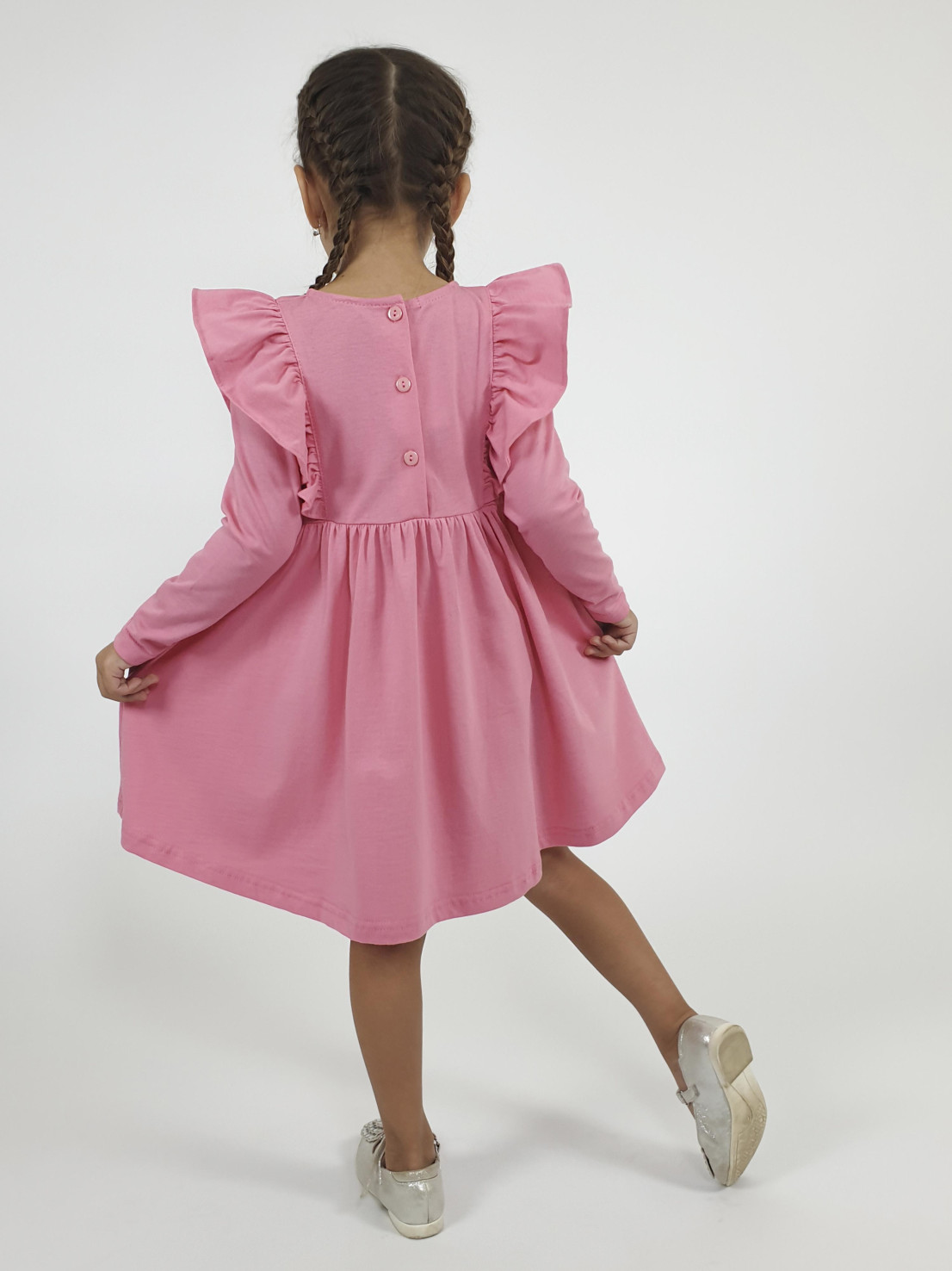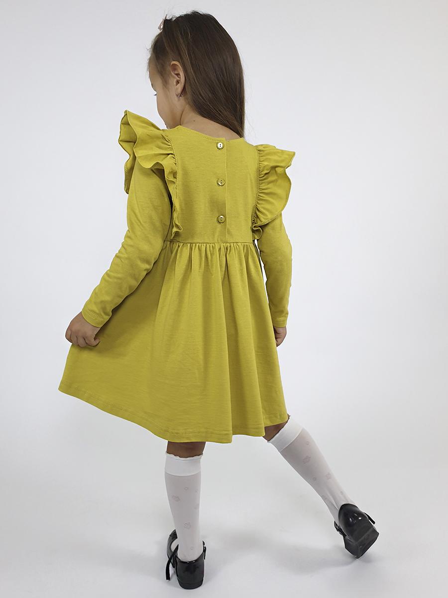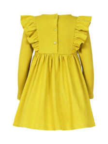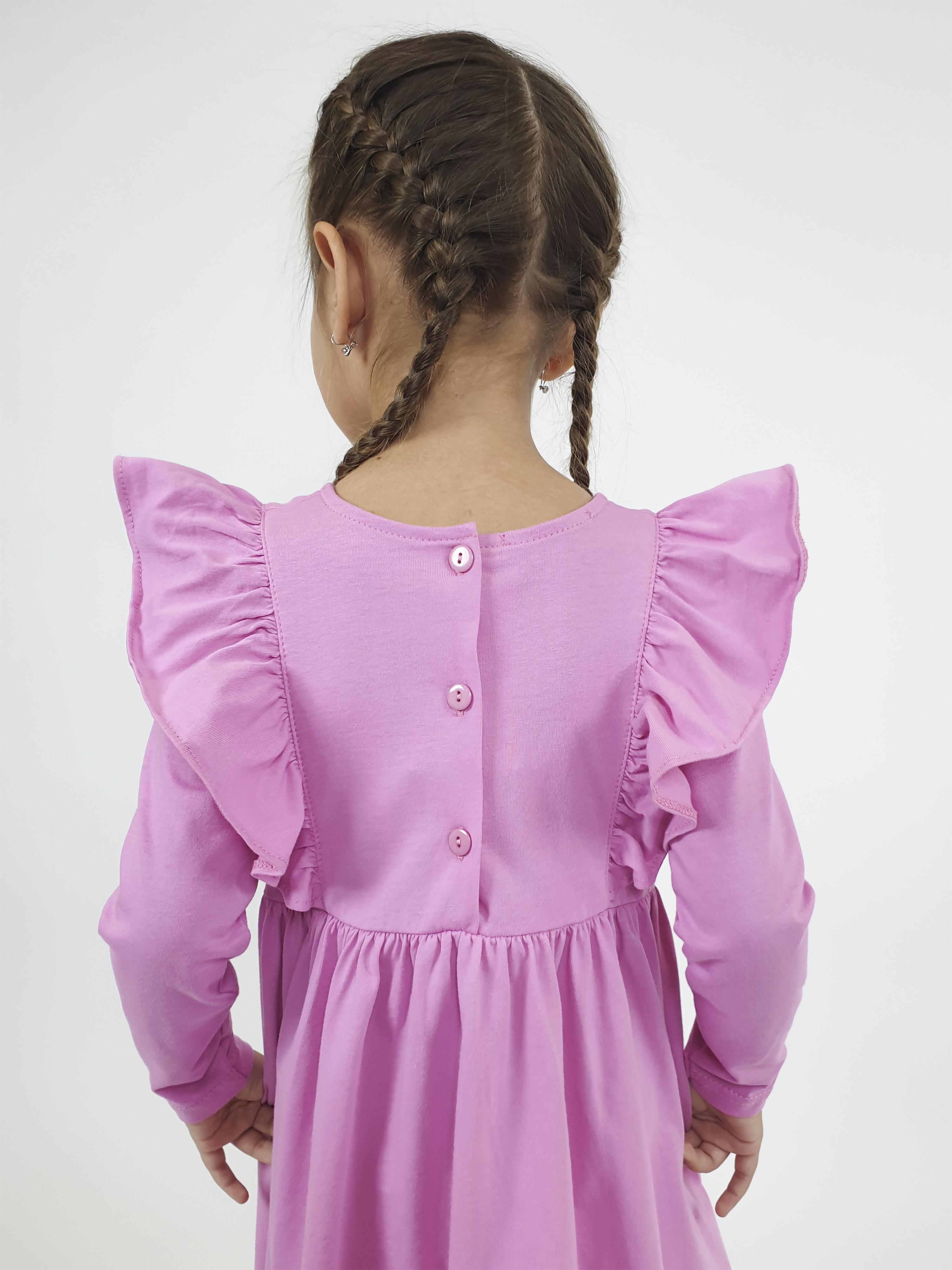 Кулирное полотно:100%х/б. Платье-полуприлегающего силуэта,длинный рукав.Отрезная юбка со сборкой,рельефы с рюшей.Вышивка на центральной части переда.Горловина окантована и подшита,застежка сзади на пуговицы.