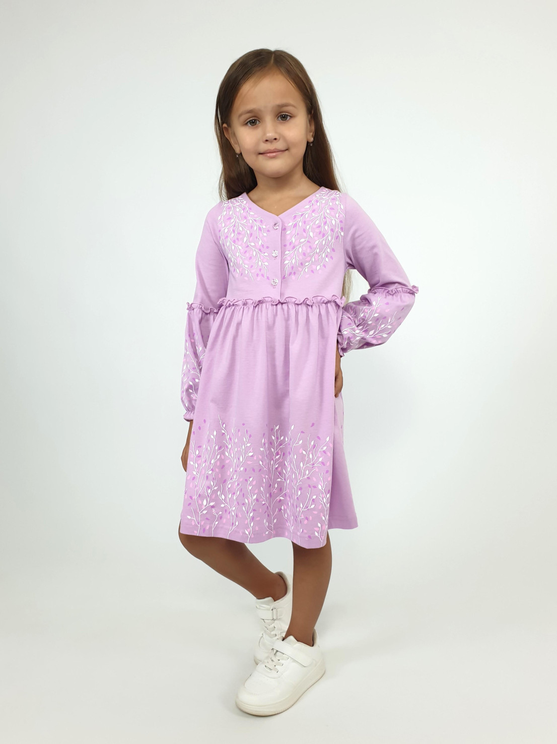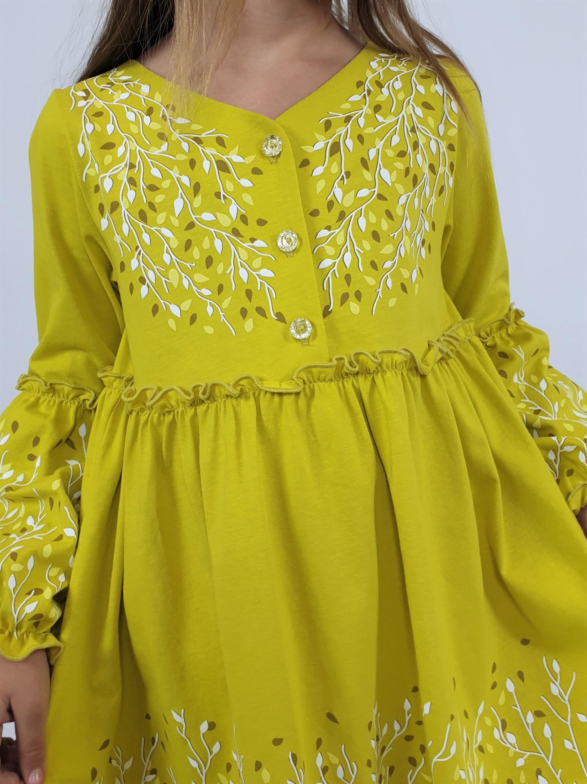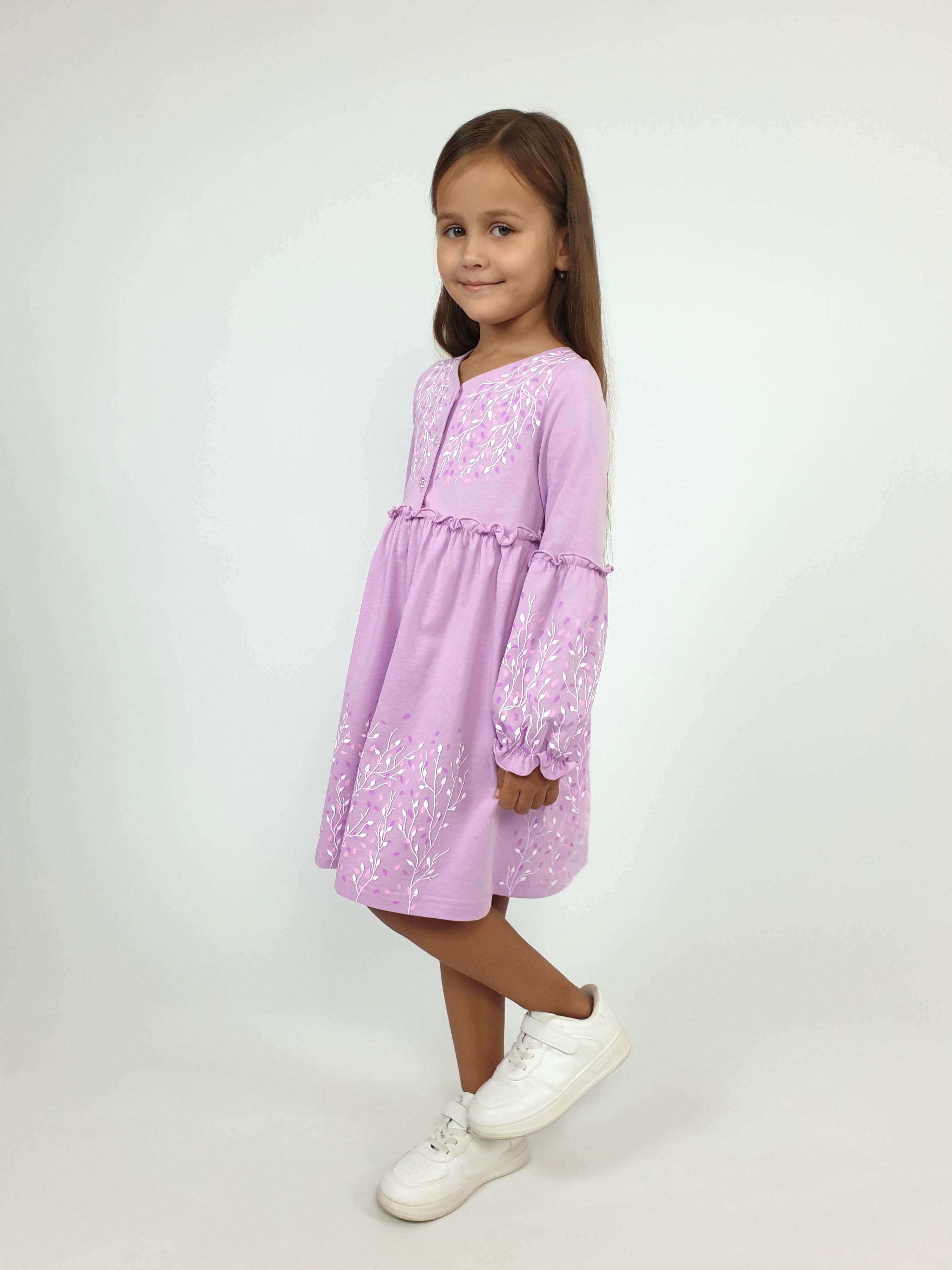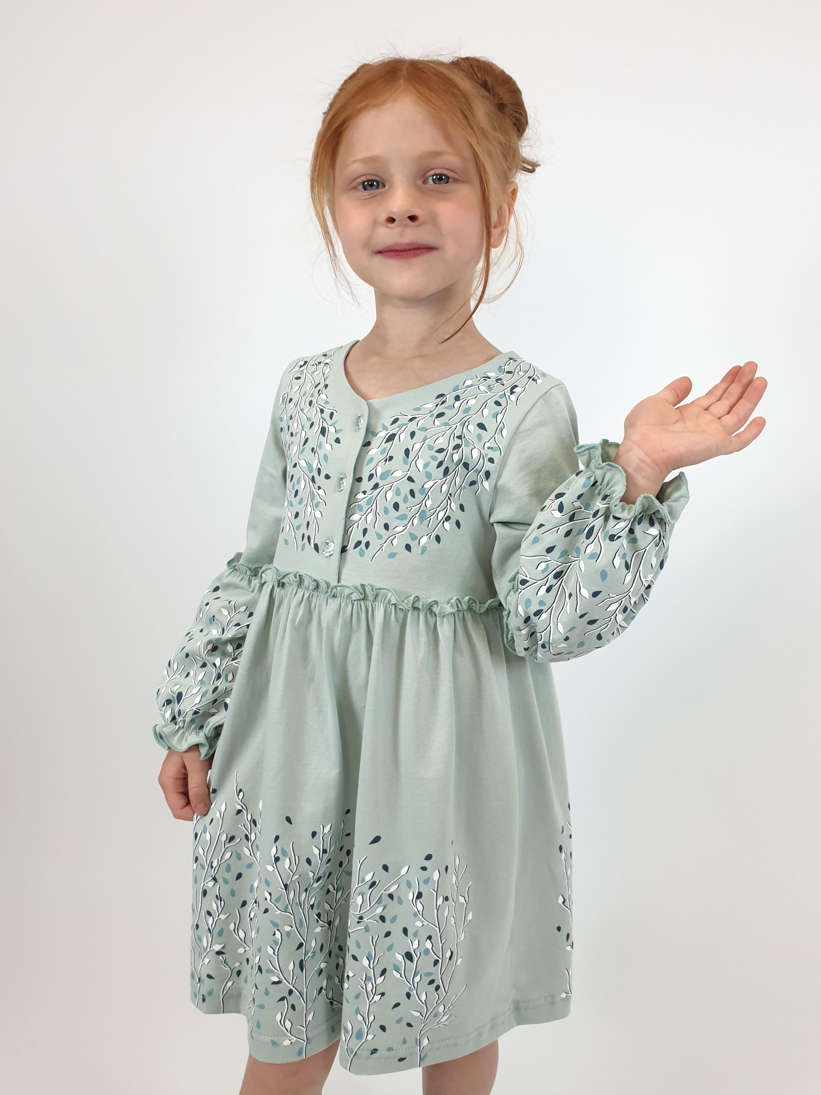 Кулирное полотно:100% х/б. Платье-силуэт трапеция.Длинный втачной рукав,внизу на резинке(шпульная).Завышена линия талии,отрезная юбка.Срезы нижней части рукава и верх юбки со сборкой,обработаны спиральным швом.Печать на переде,рукавах и юбке.Горловина обработана обтачкой.Застежка по переду на пуговицы.