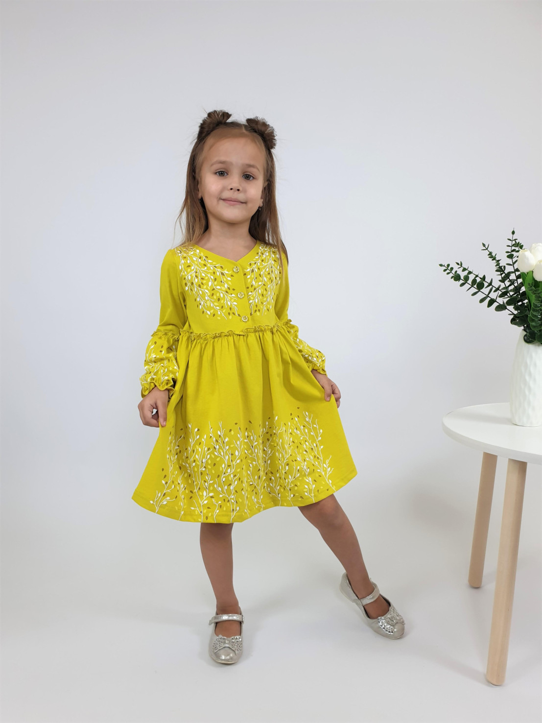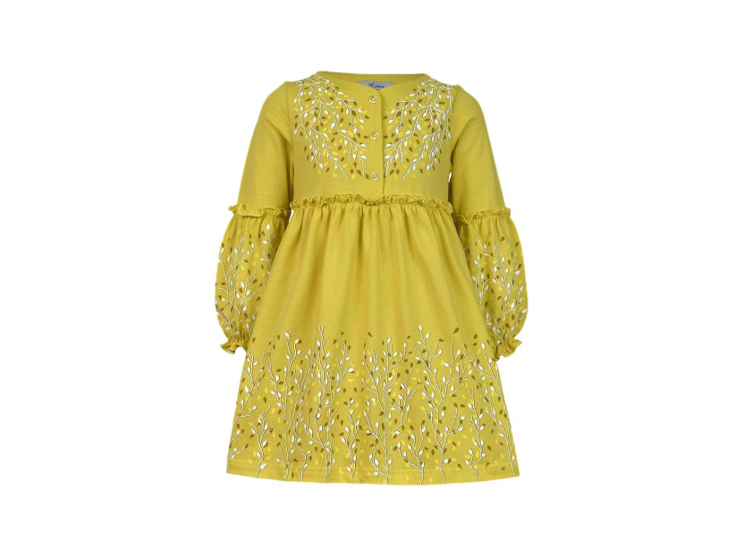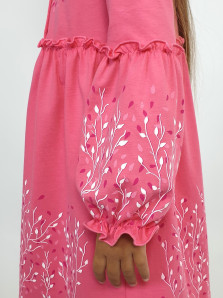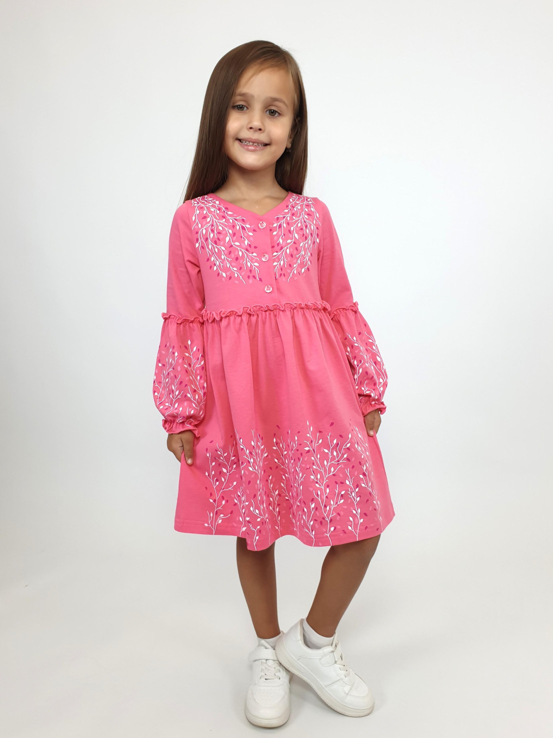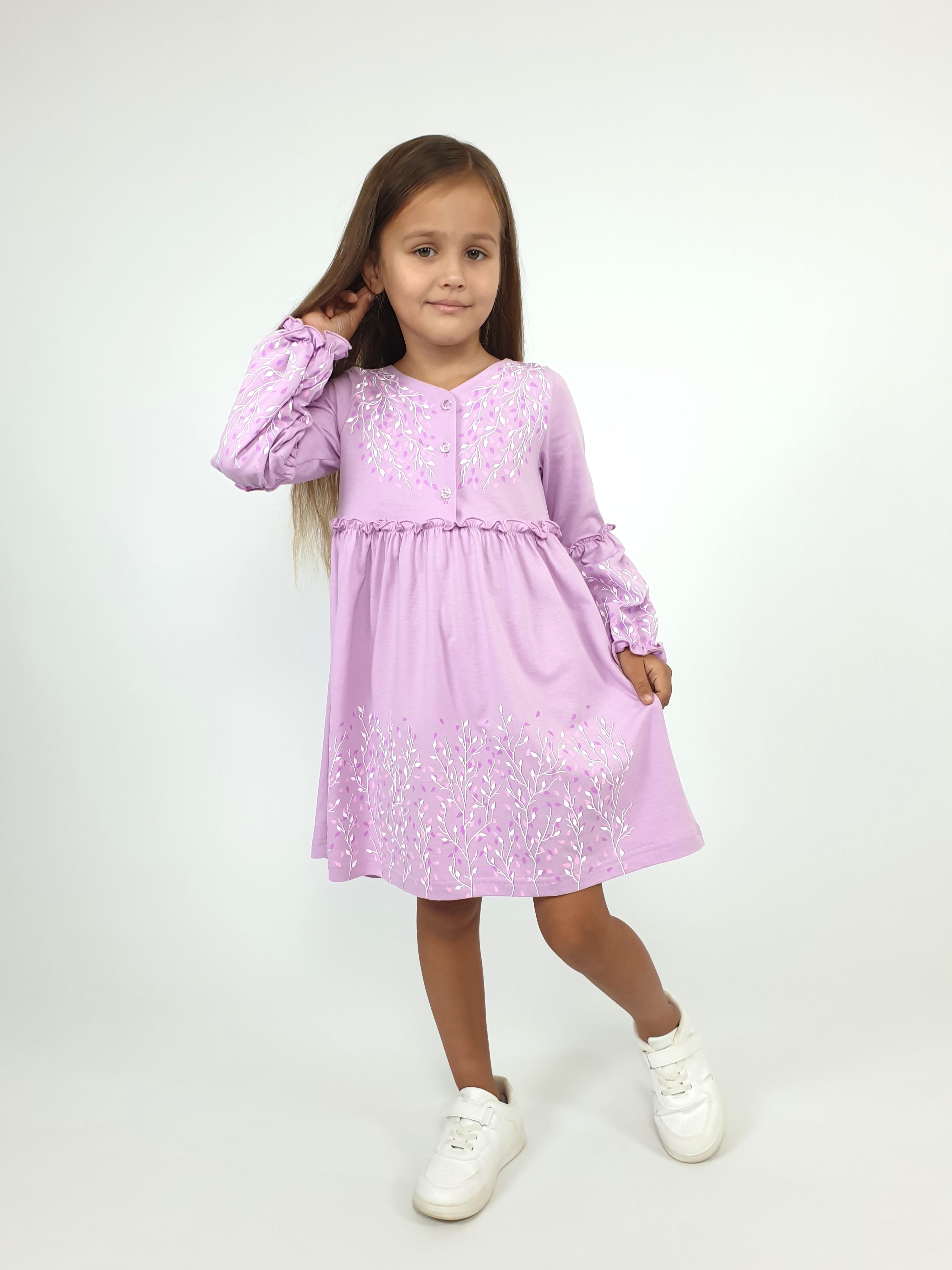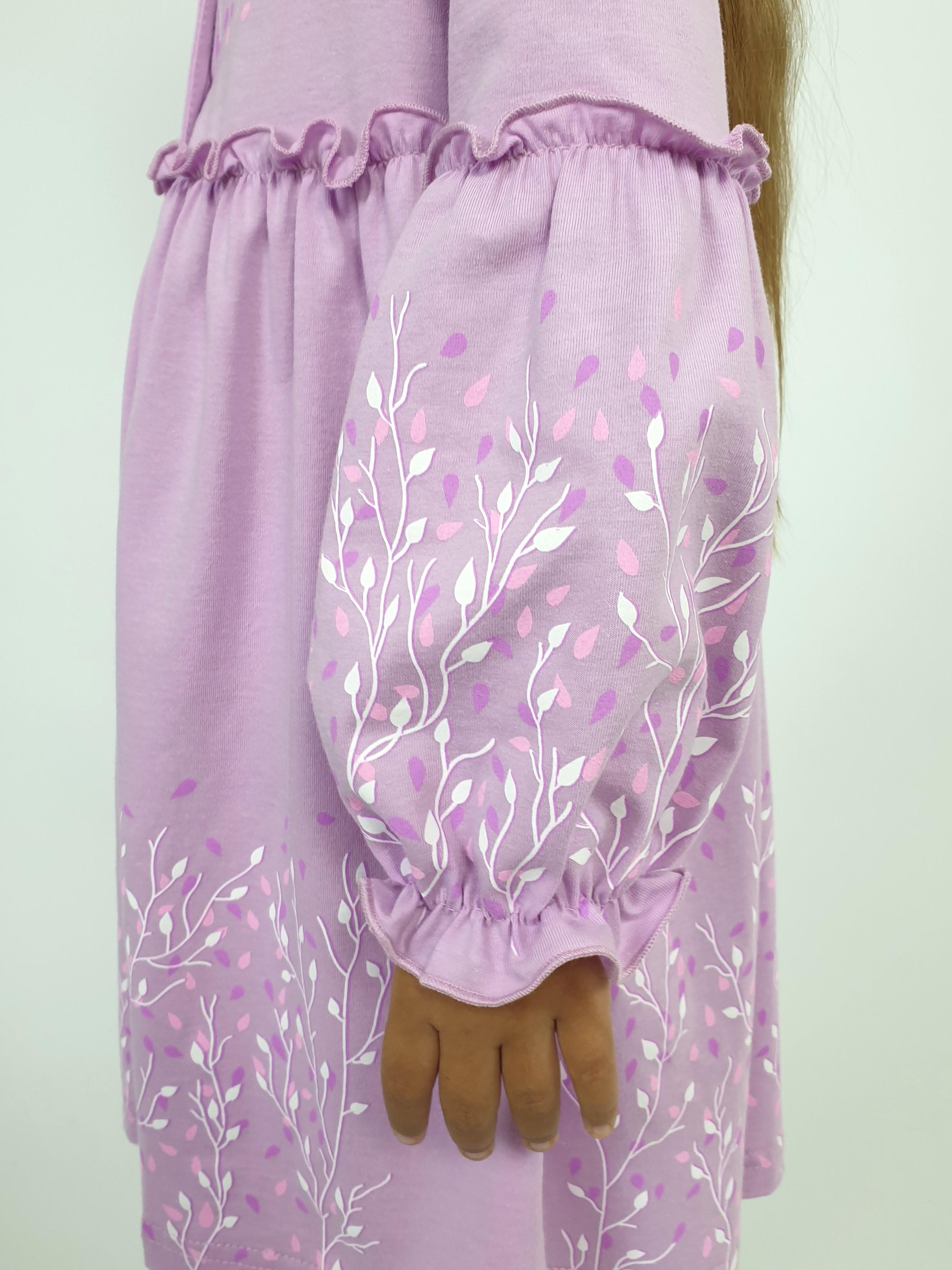 Кулирное полотно:100% х/б. Платье-силуэт трапеция.Длинный втачной рукав,внизу на резинке(шпульная).Завышена линия талии,отрезная юбка.Срезы нижней части рукава и верх юбки со сборкой,обработаны спиральным швом.Печать на переде,рукавах и юбке.Горловина обработана обтачкой.Застежка по переду на пуговицы.