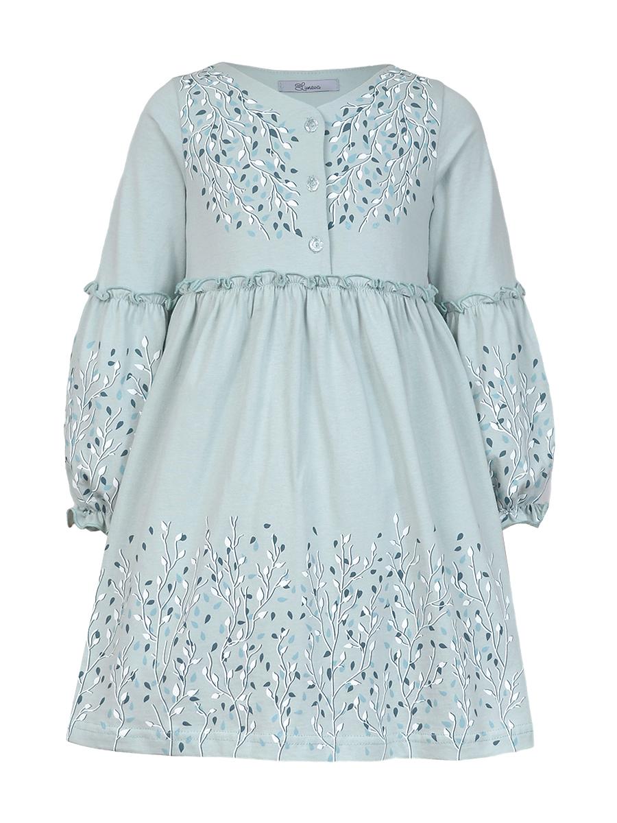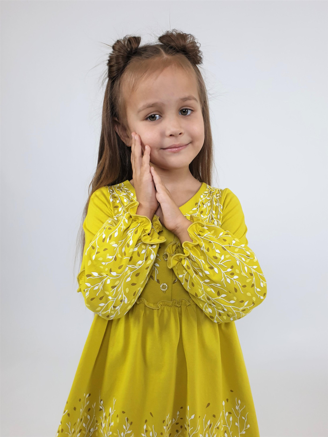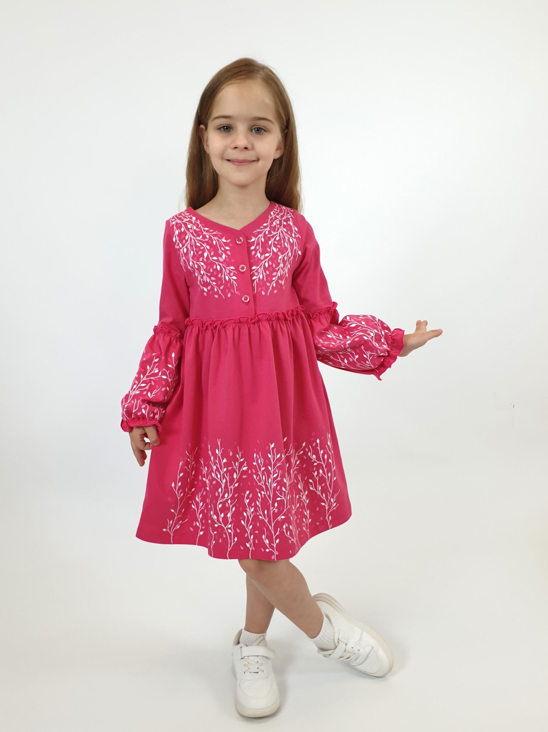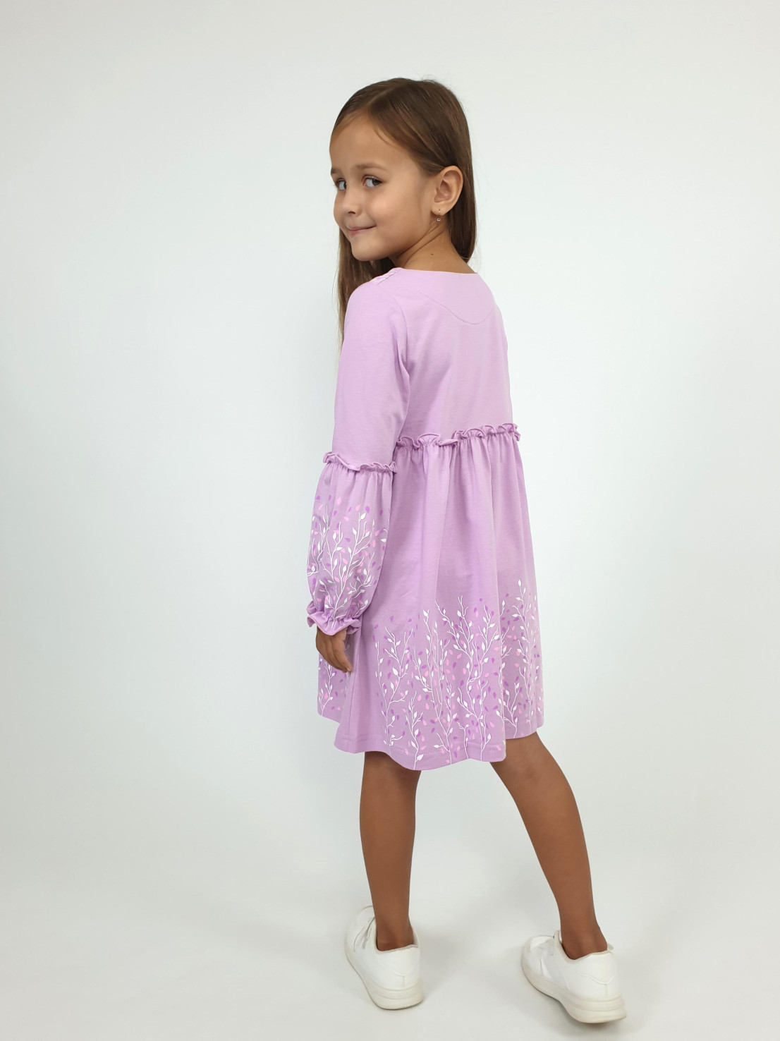 Кулирное полотно:100% х/б. Платье-силуэт трапеция.Длинный втачной рукав,внизу на резинке(шпульная).Завышена линия талии,отрезная юбка.Срезы нижней части рукава и верх юбки со сборкой,обработаны спиральным швом.Печать на переде,рукавах и юбке.Горловина обработана обтачкой.Застежка по переду на пуговицы.