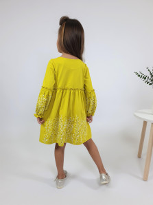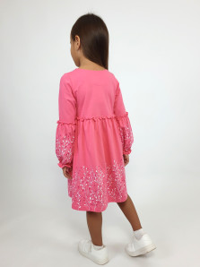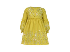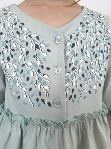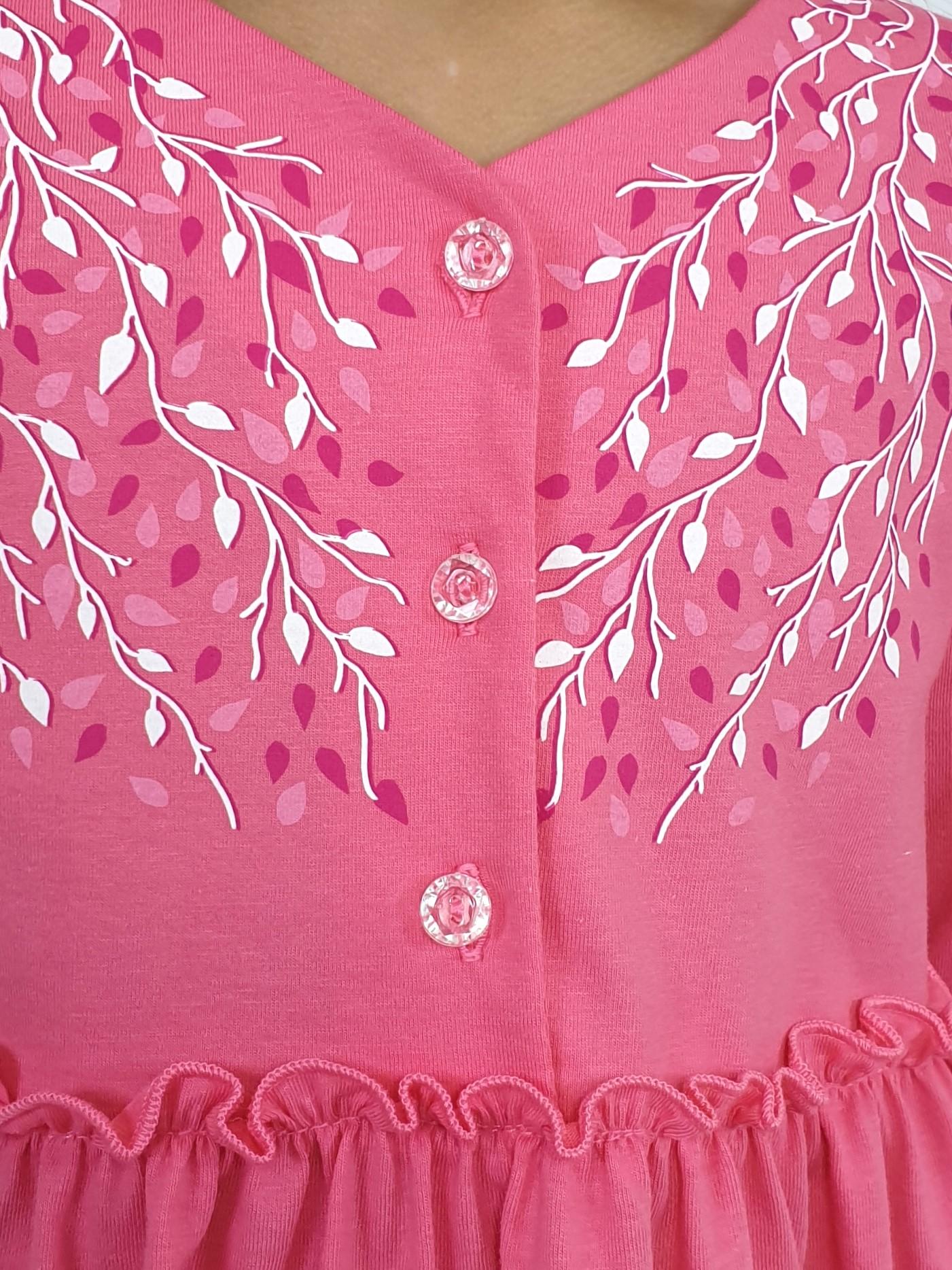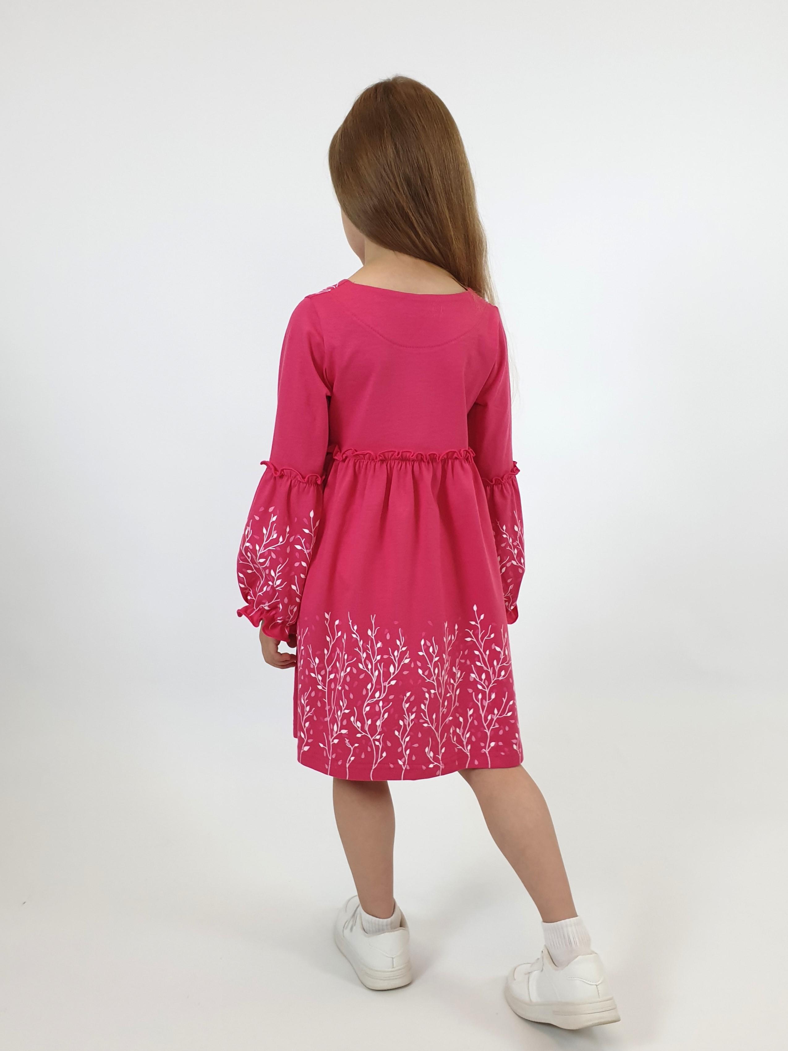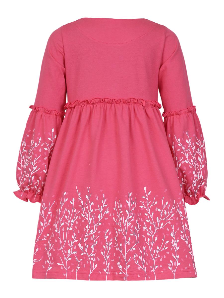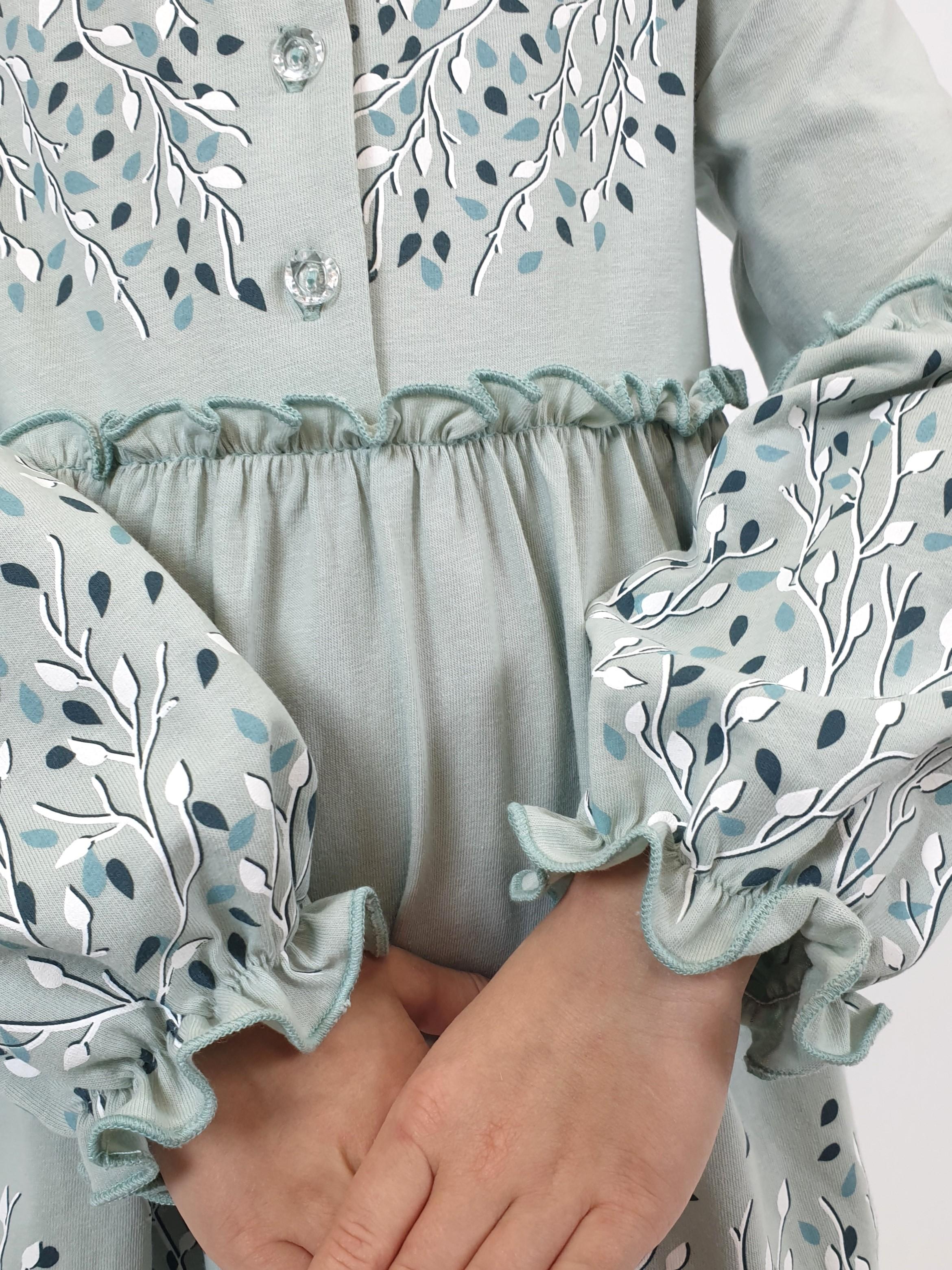 Кулирное полотно:100% х/б. Платье-силуэт трапеция.Длинный втачной рукав,внизу на резинке(шпульная).Завышена линия талии,отрезная юбка.Срезы нижней части рукава и верх юбки со сборкой,обработаны спиральным швом.Печать на переде,рукавах и юбке.Горловина обработана обтачкой.Застежка по переду на пуговицы.