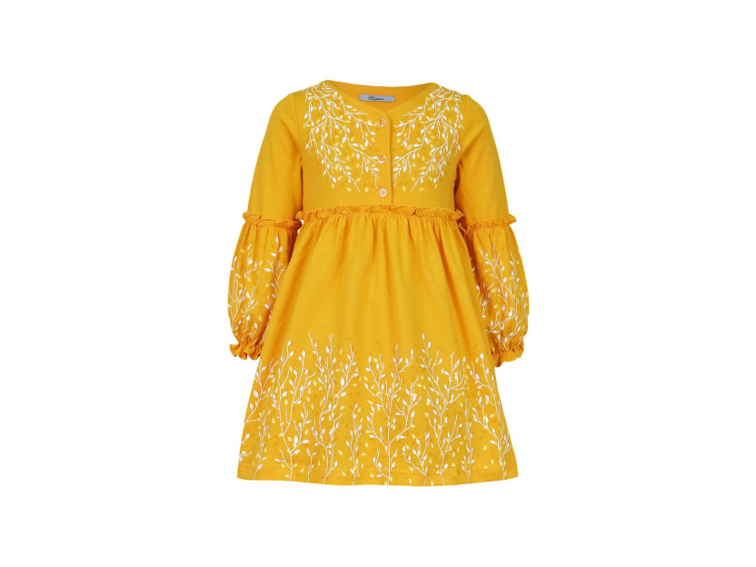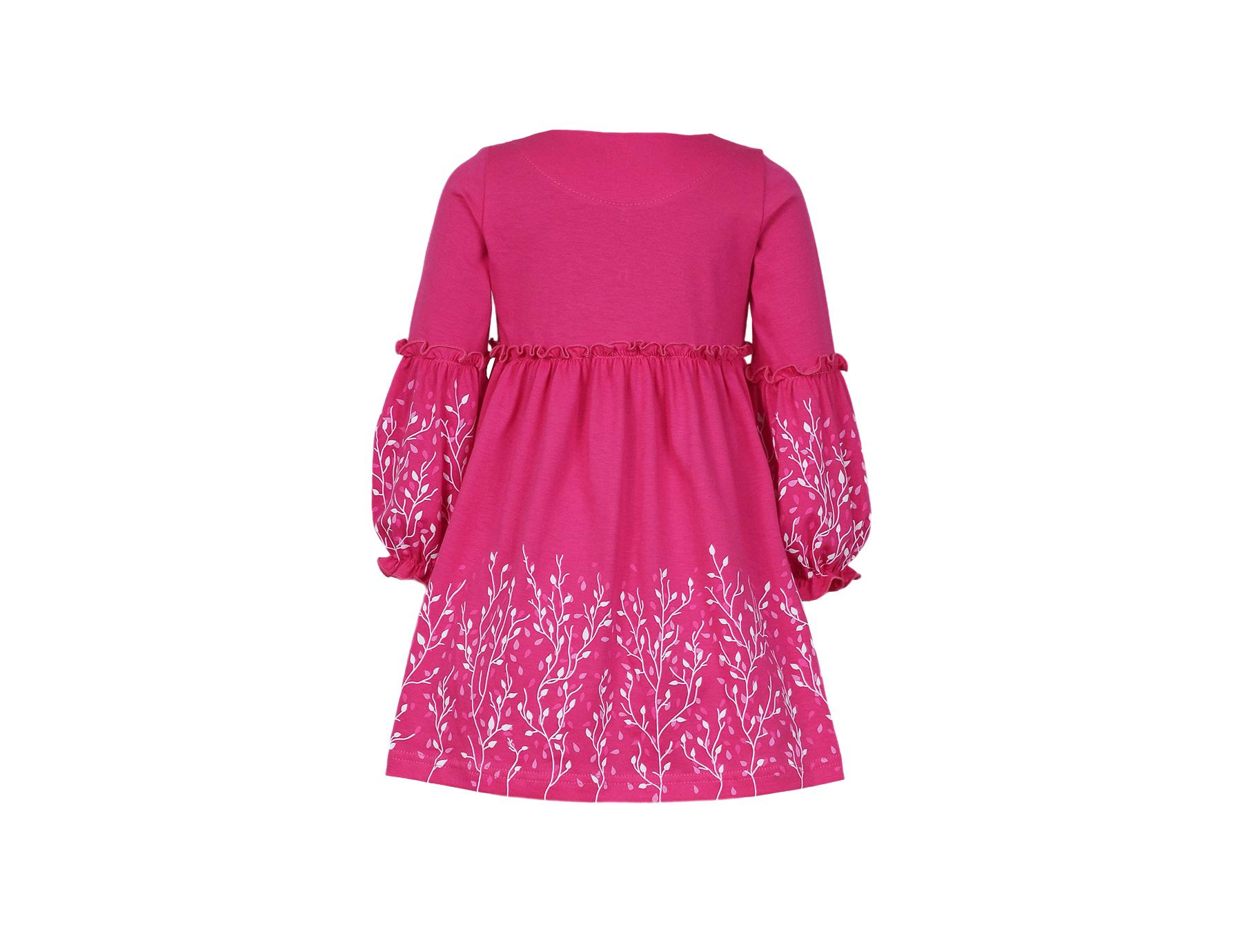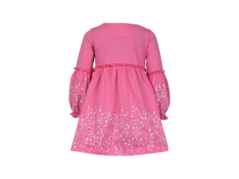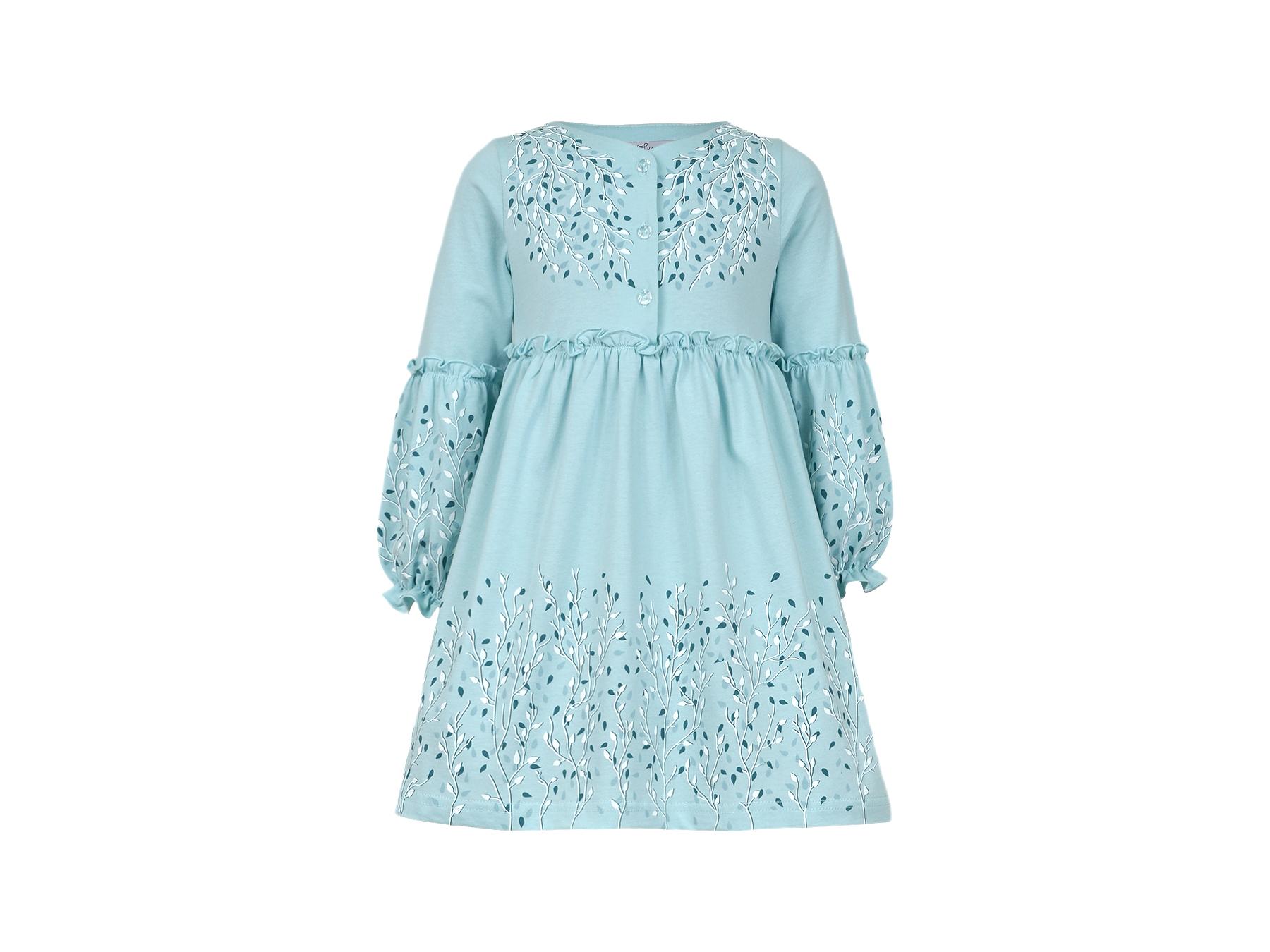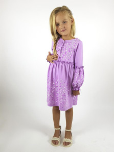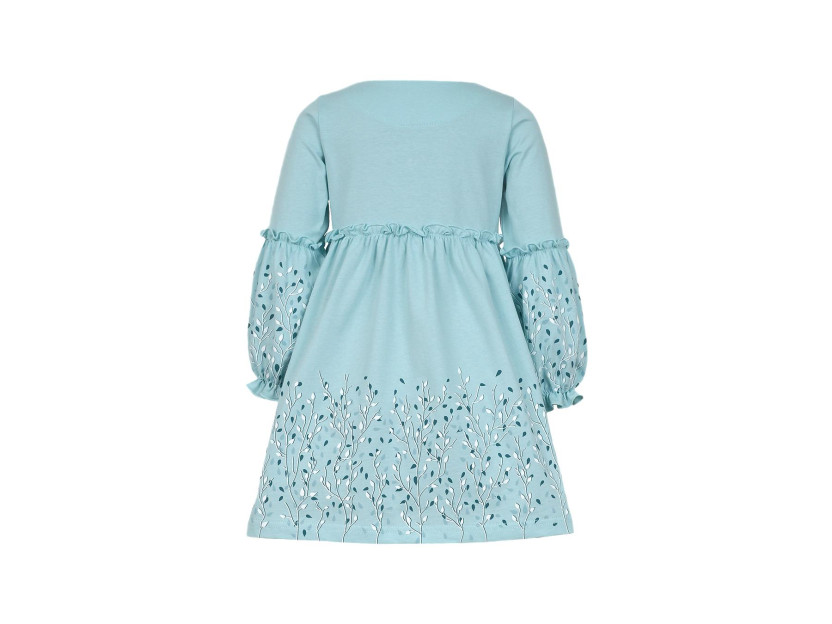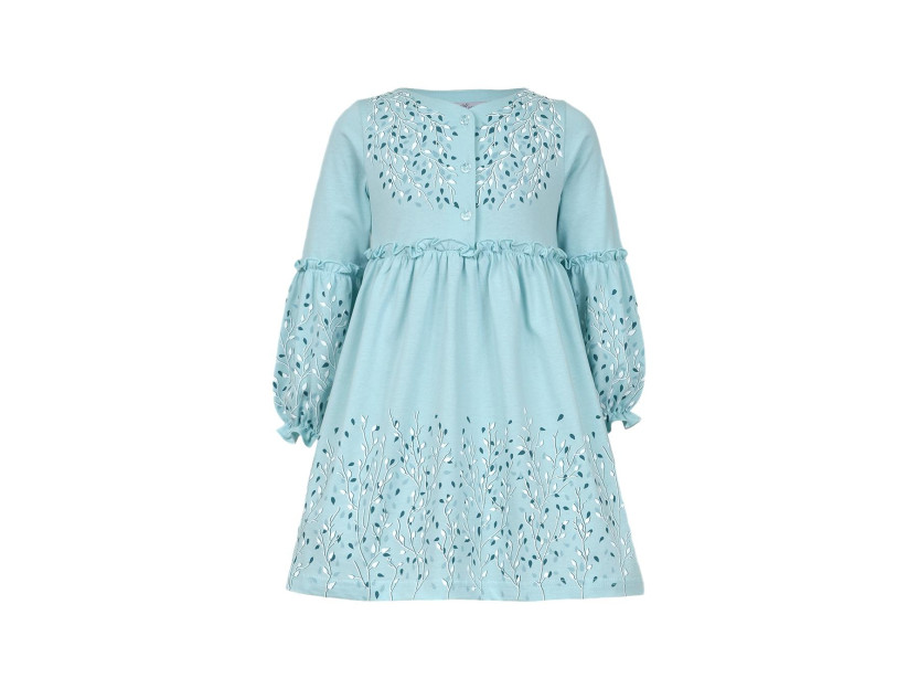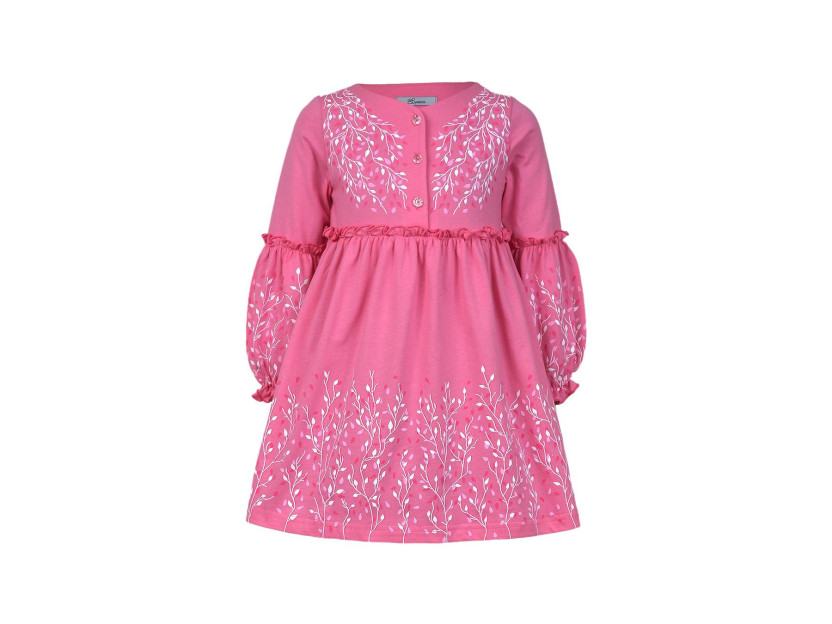 Кулирное полотно:100% х/б. Платье-силуэт трапеция.Длинный втачной рукав,внизу на резинке(шпульная).Завышена линия талии,отрезная юбка.Срезы нижней части рукава и верх юбки со сборкой,обработаны спиральным швом.Печать на переде,рукавах и юбке.Горловина обработана обтачкой.Застежка по переду на пуговицы.