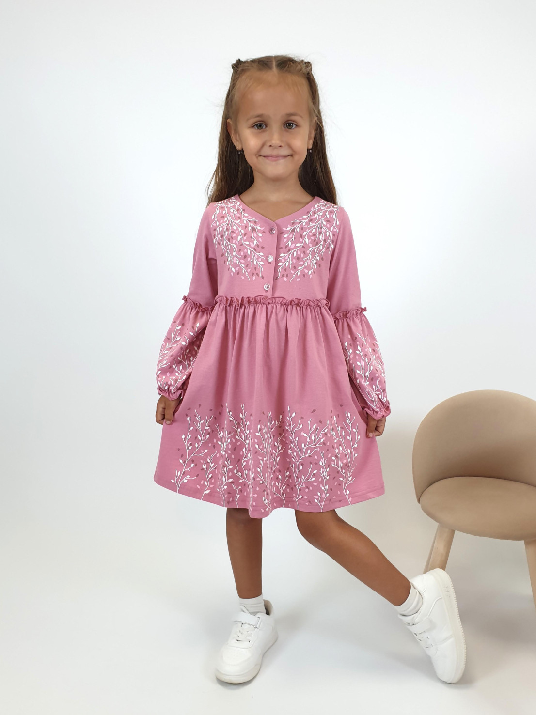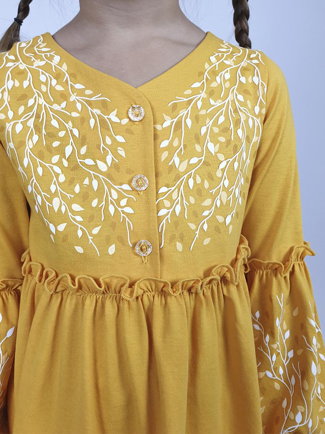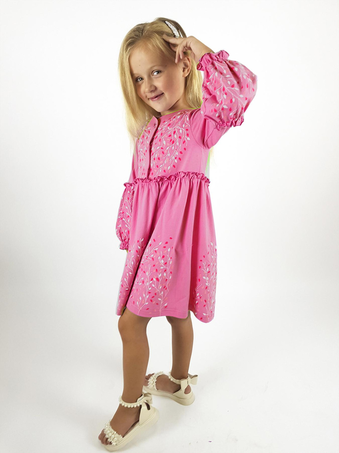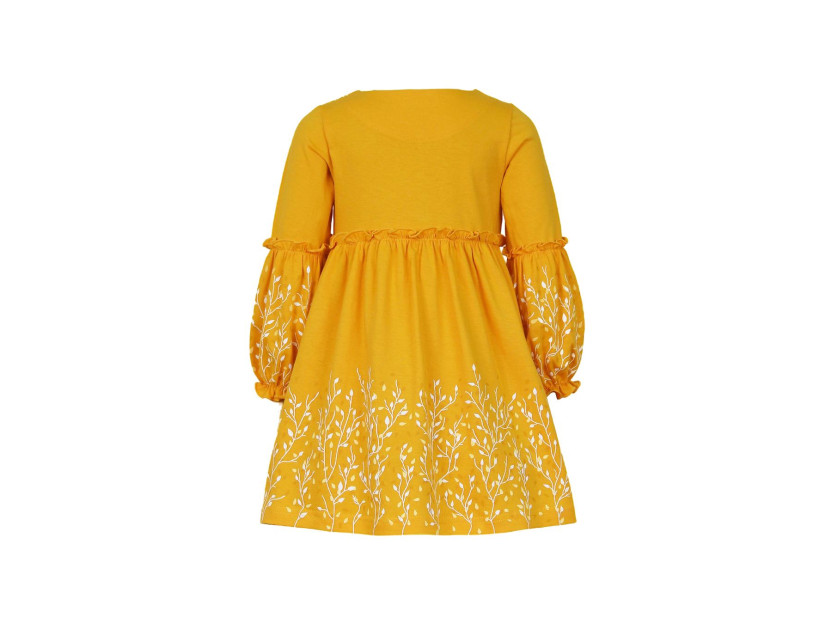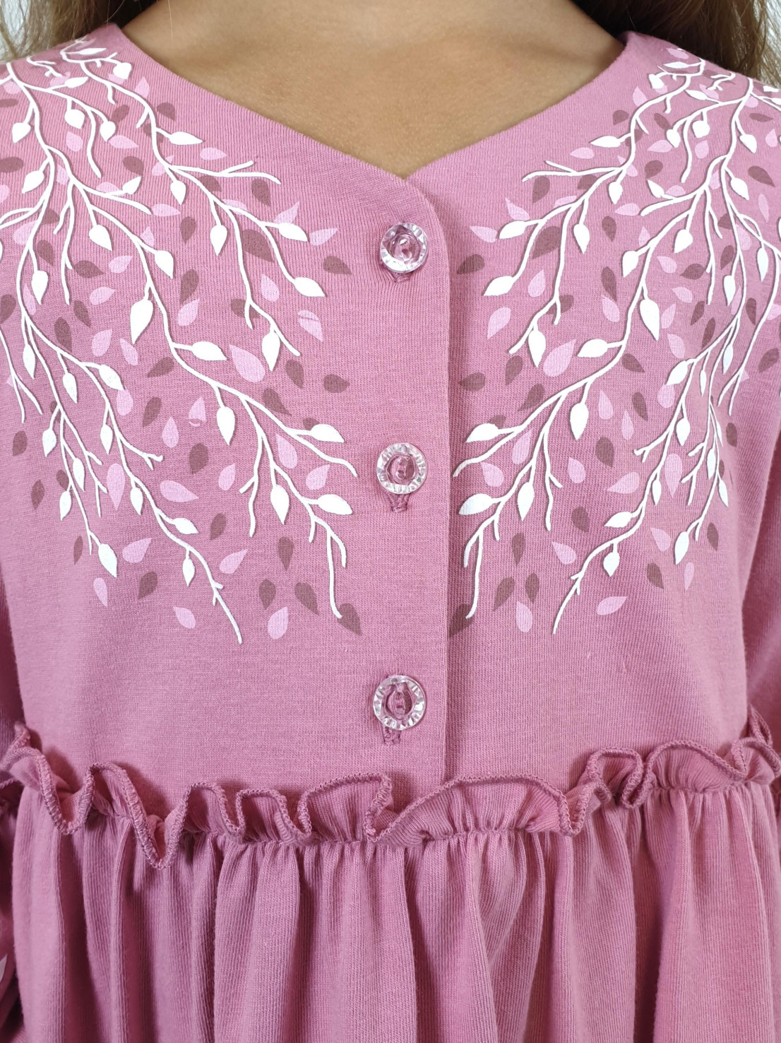 Кулирное полотно:100% х/б. Платье-силуэт трапеция.Длинный втачной рукав,внизу на резинке(шпульная).Завышена линия талии,отрезная юбка.Срезы нижней части рукава и верх юбки со сборкой,обработаны спиральным швом.Печать на переде,рукавах и юбке.Горловина обработана обтачкой.Застежка по переду на пуговицы.