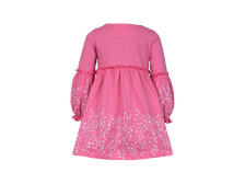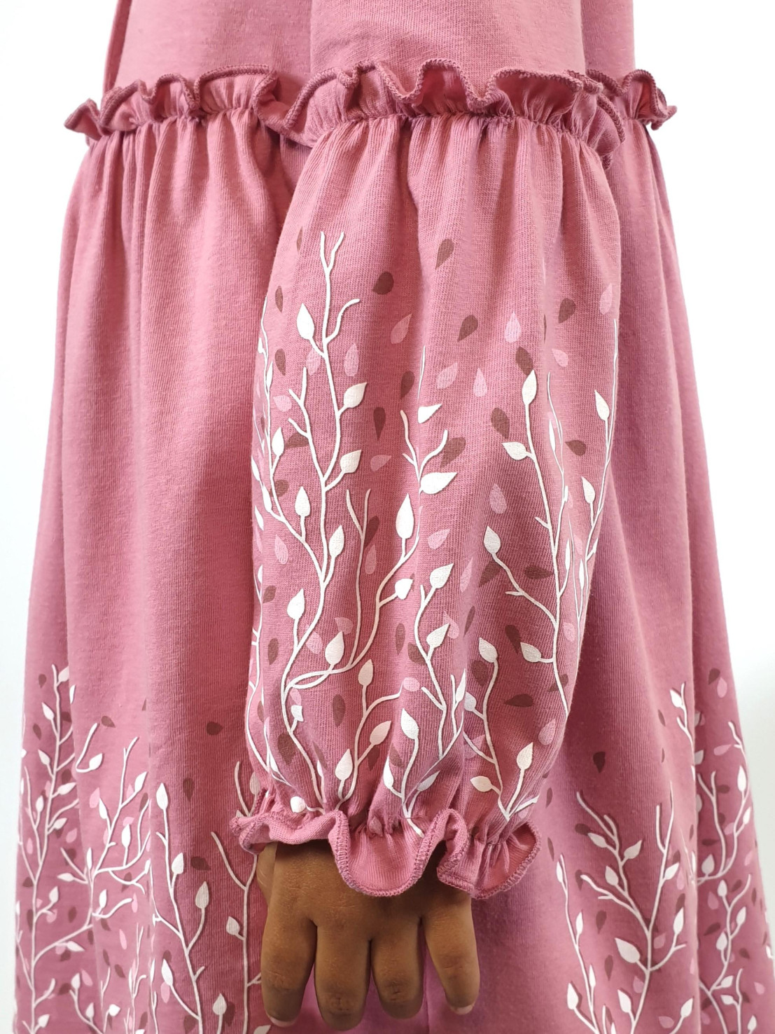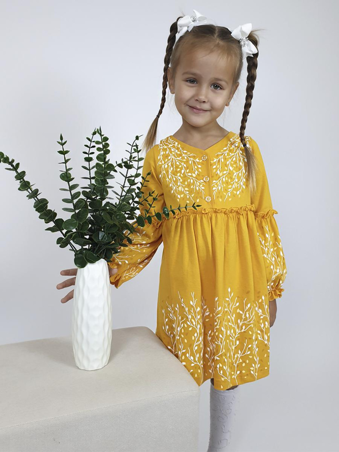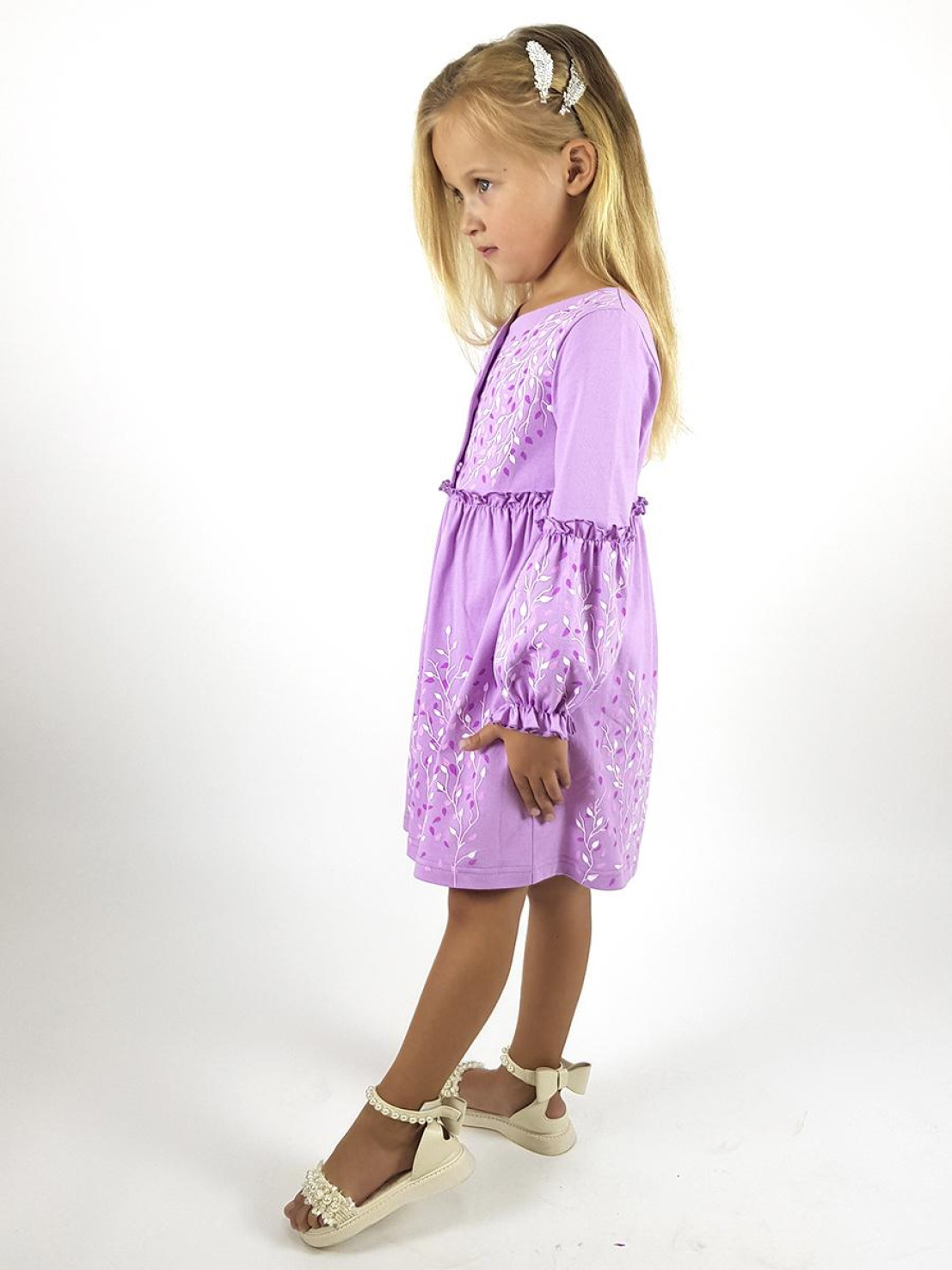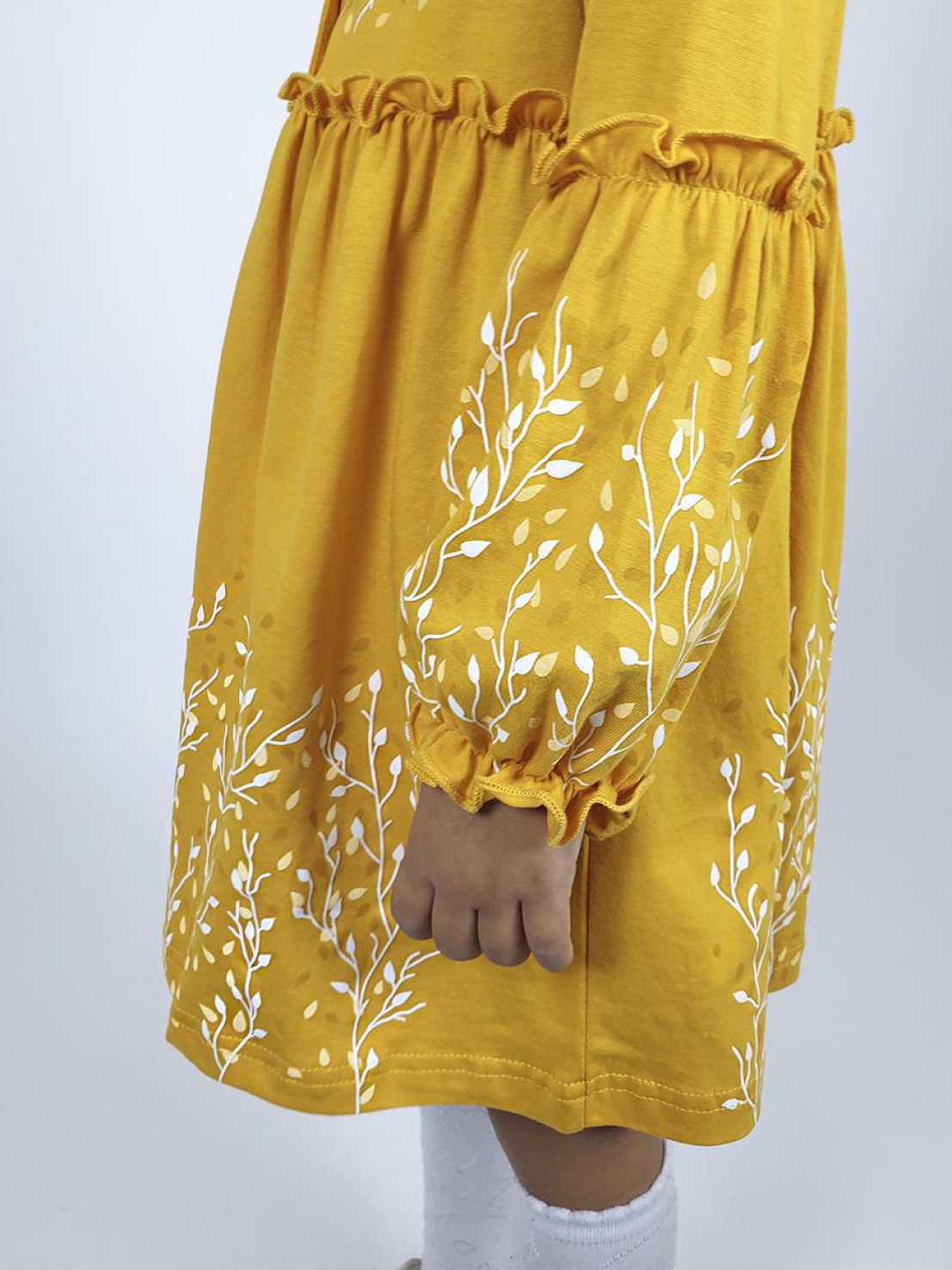 Кулирное полотно:100% х/б. Платье-силуэт трапеция.Длинный втачной рукав,внизу на резинке(шпульная).Завышена линия талии,отрезная юбка.Срезы нижней части рукава и верх юбки со сборкой,обработаны спиральным швом.Печать на переде,рукавах и юбке.Горловина обработана обтачкой.Застежка по переду на пуговицы.