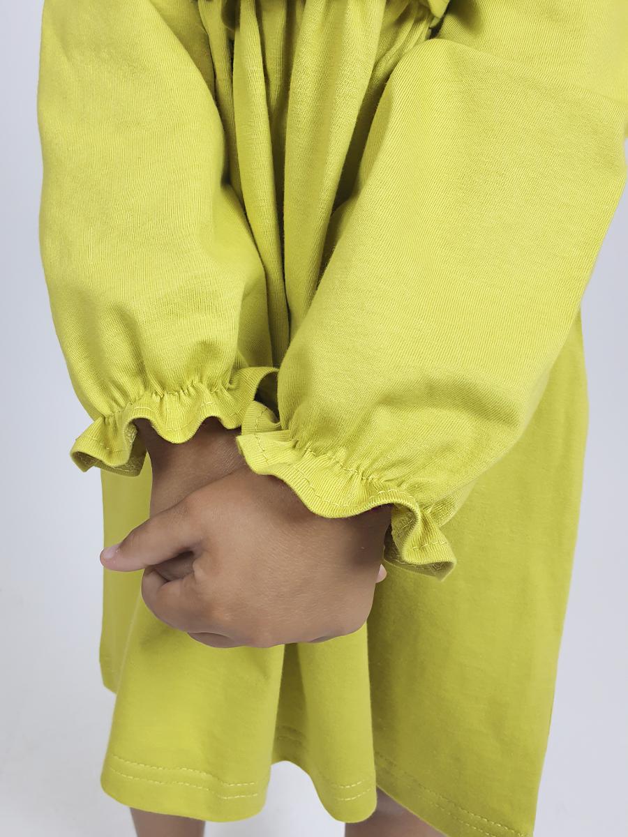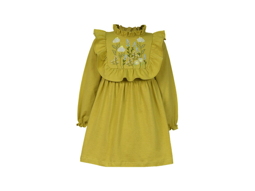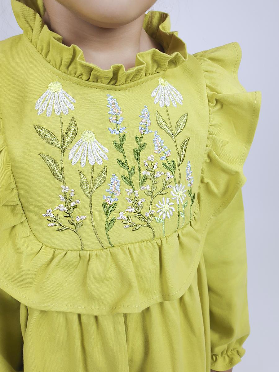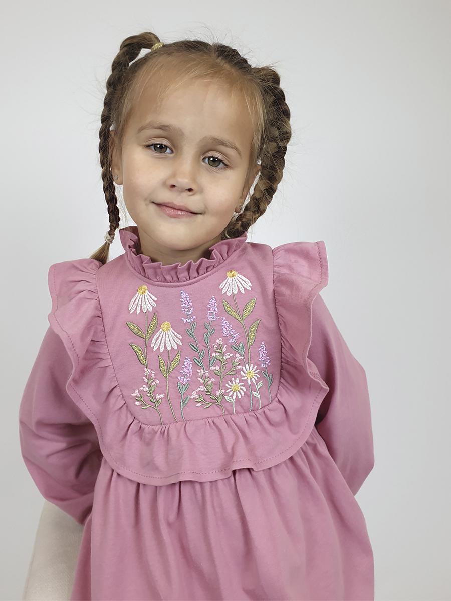 Кулирное полотно:100%х/б. Платье-отрезная юбка в сборку,кокетка переда и рельефы спинки с рюшей.Рукав длинный,внизу на резинке(венгерке).В горловине рюша со сгибом,шов окантован и подшит.Застежка по спинке на пуговицу.Вышивка на кокетке.