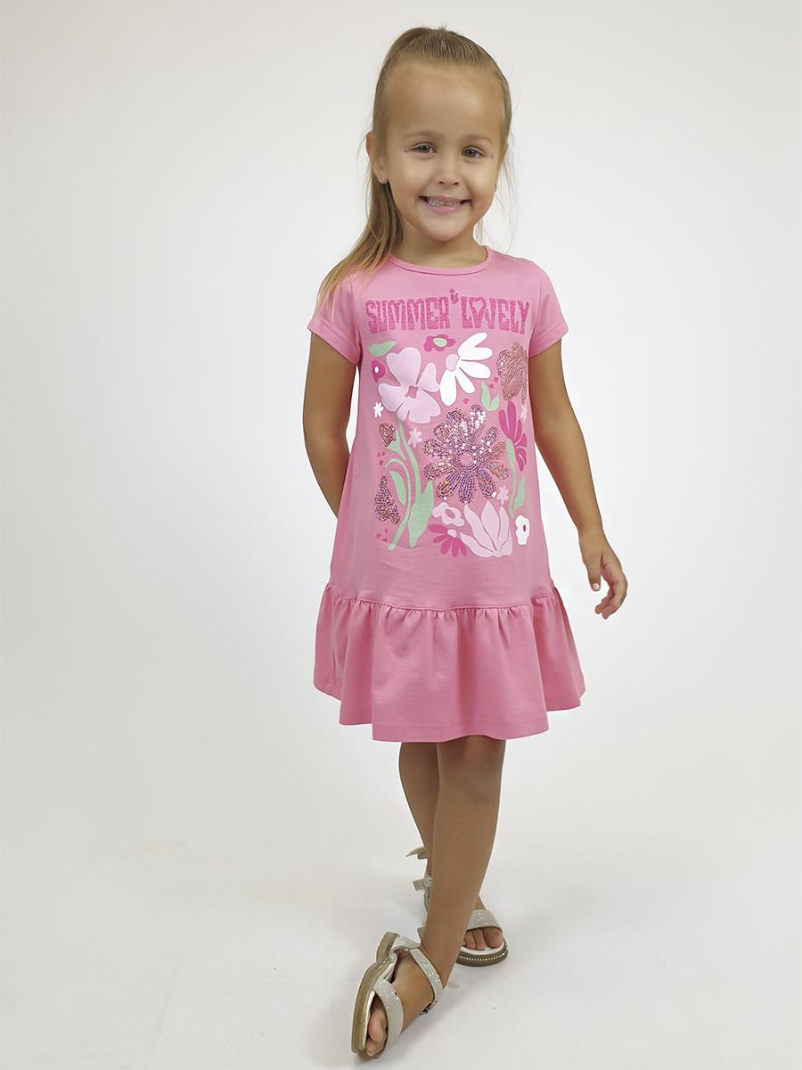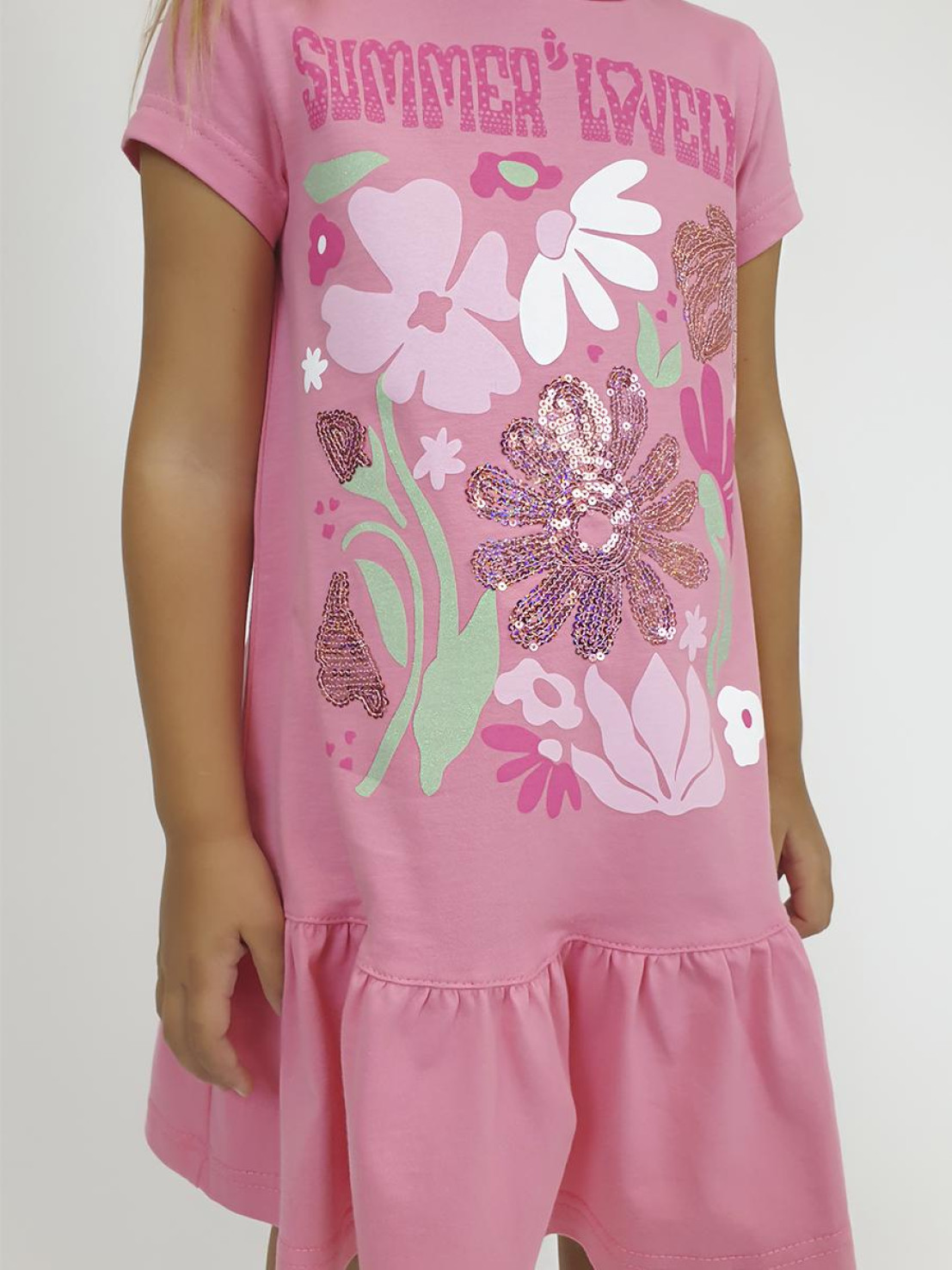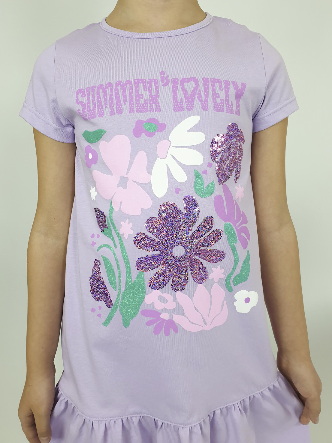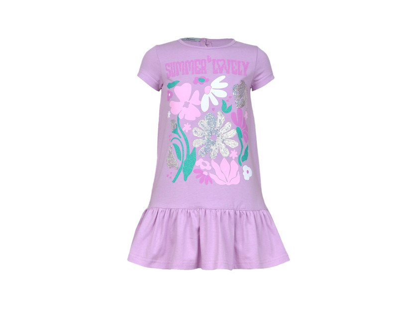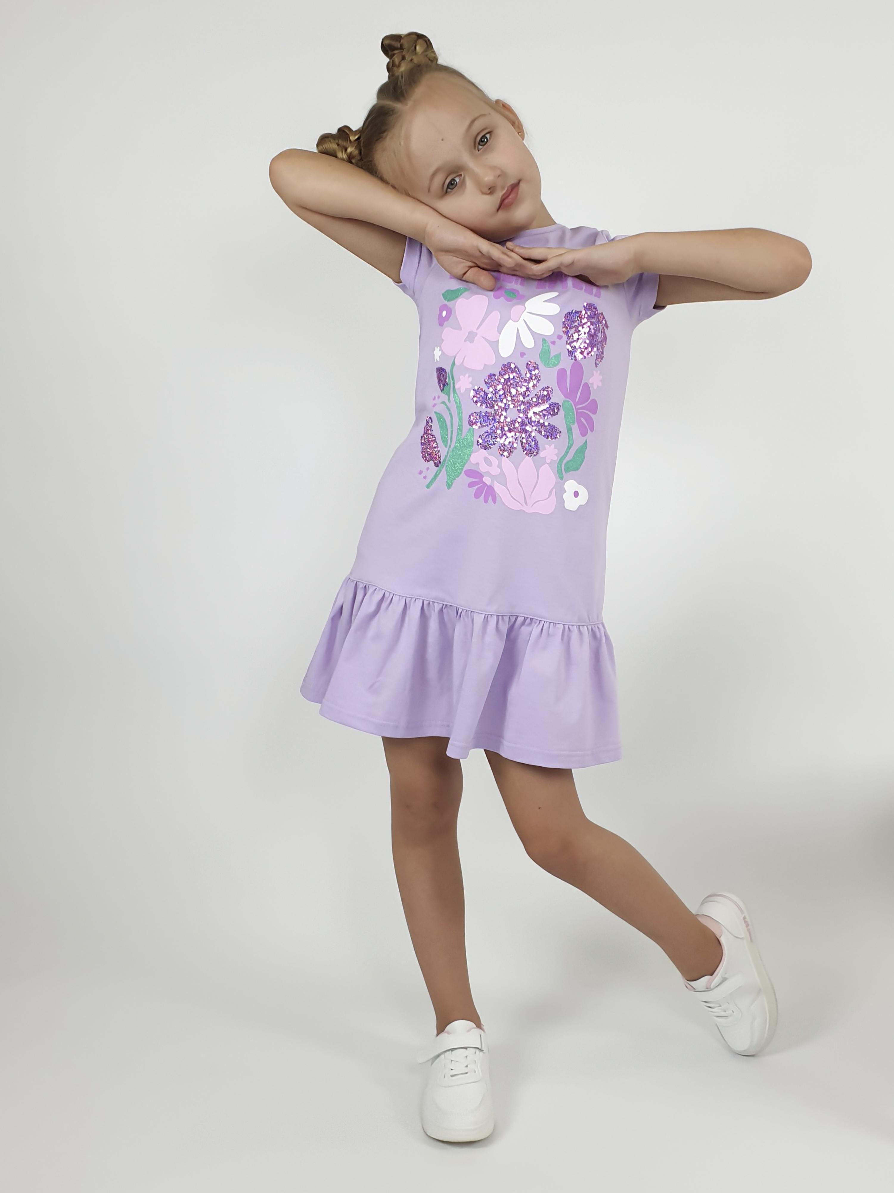 Кулирное полотно: 100% х/б. Платье-силуэт трапеция,короткий рукав,внизу волан.Печать и вышивка(пайетки) на переде.Горловина окантована.застежка по спинке на пуговицу.Ярлык на спинке.