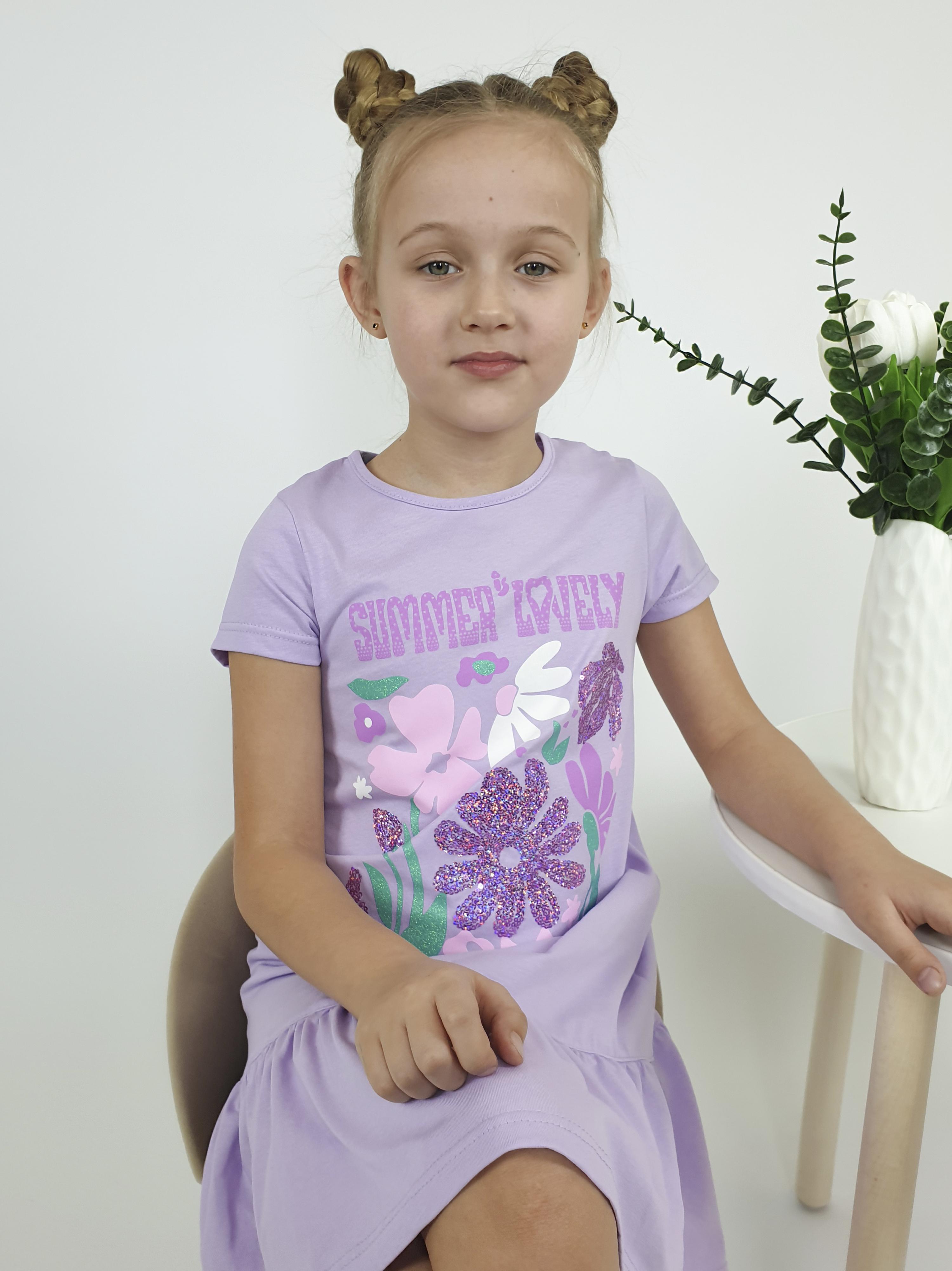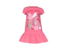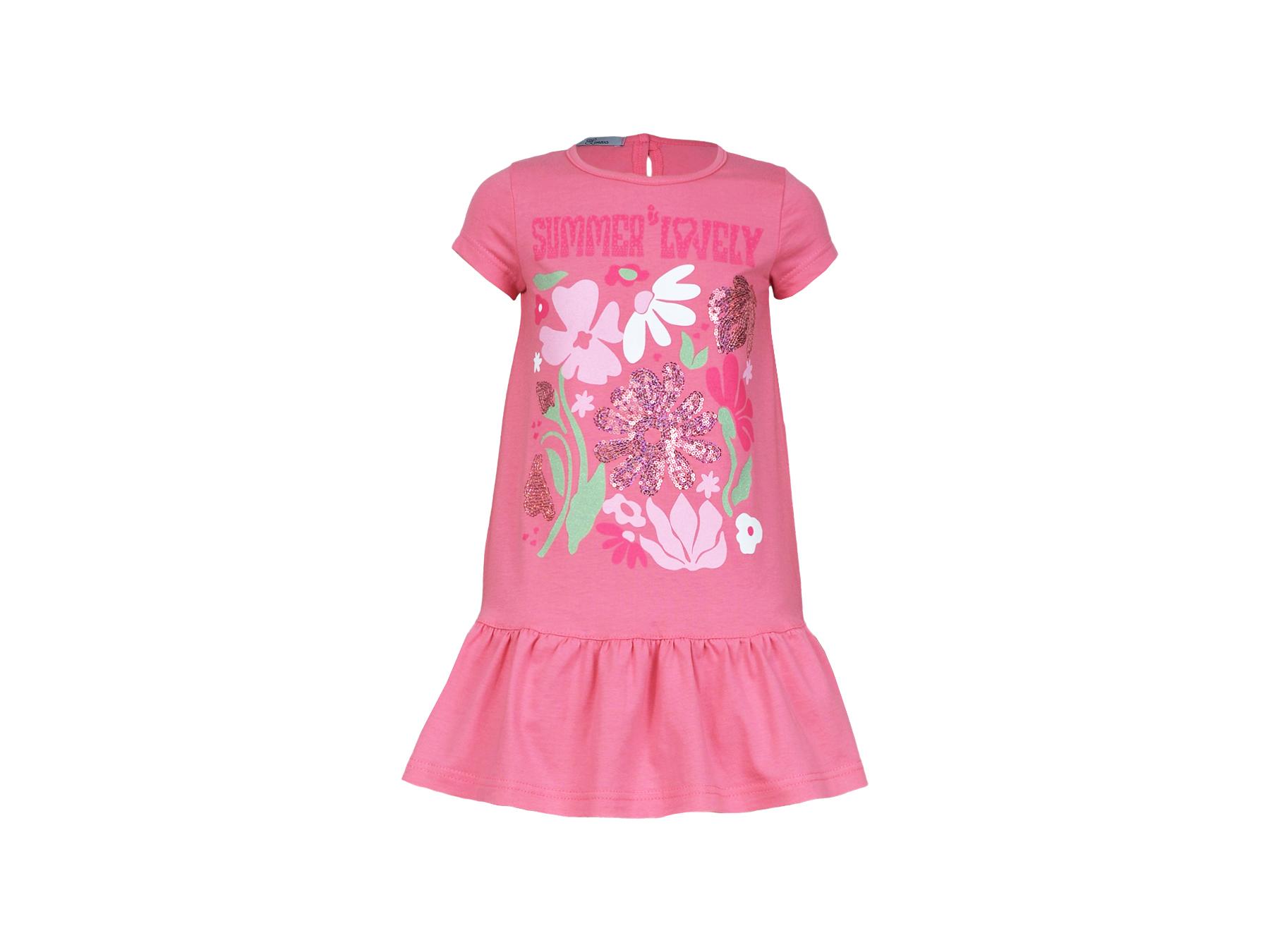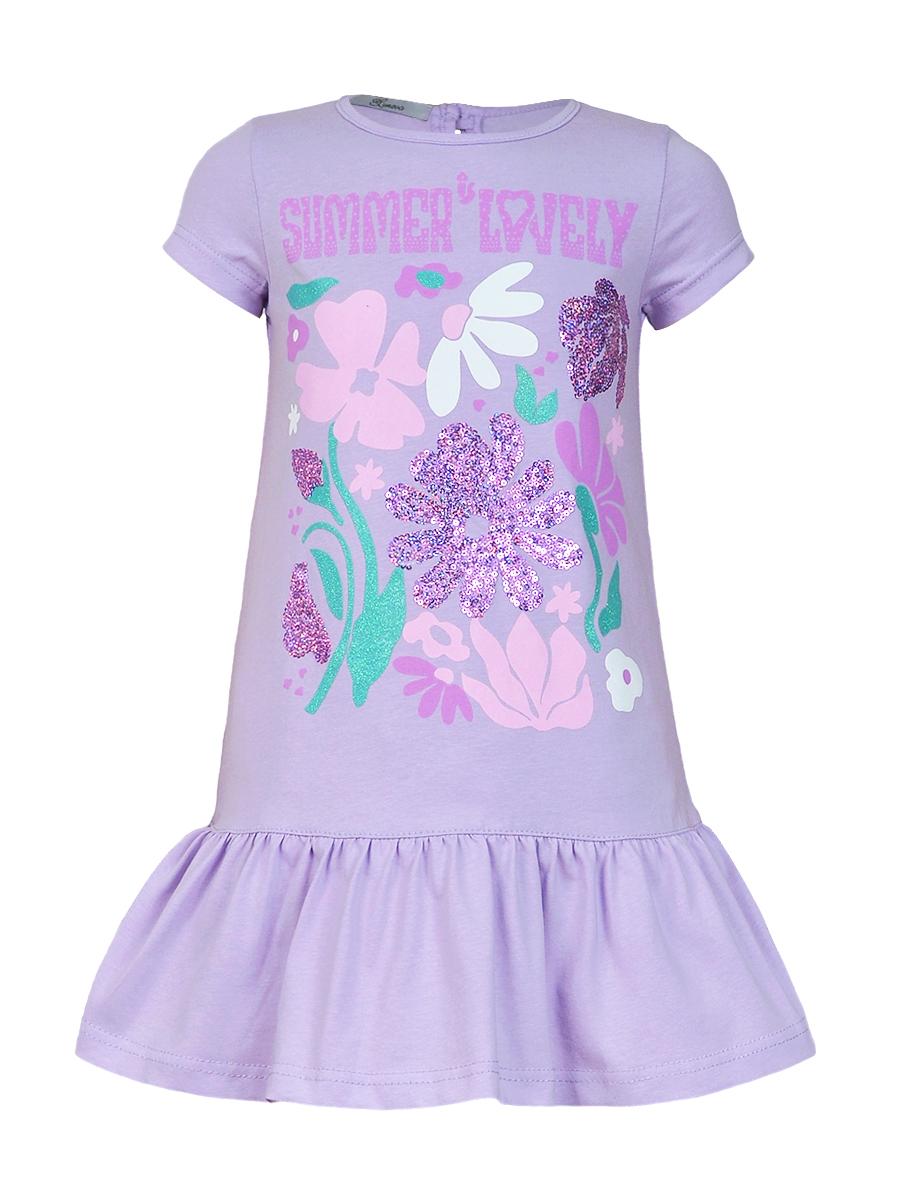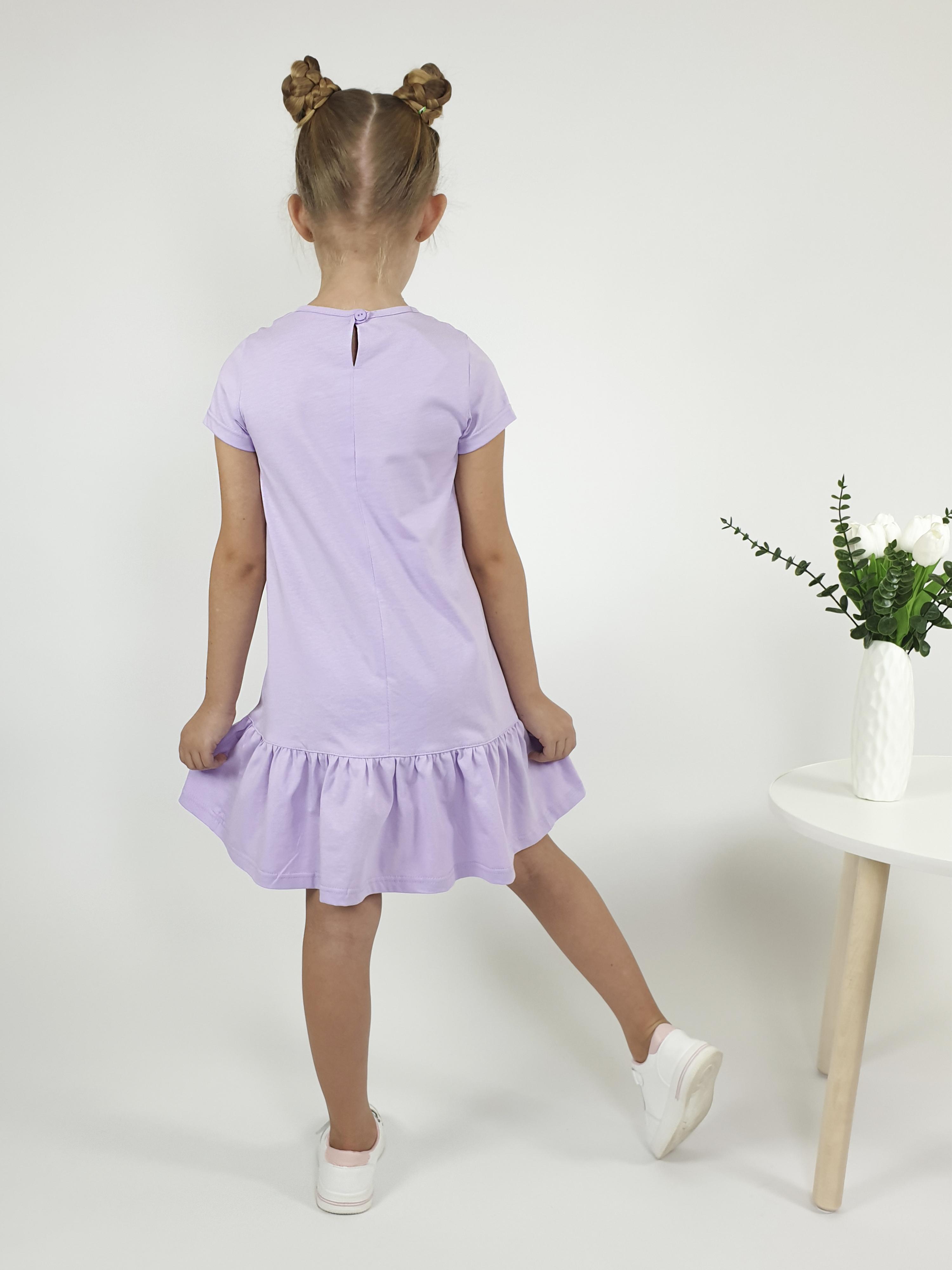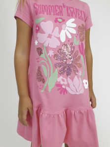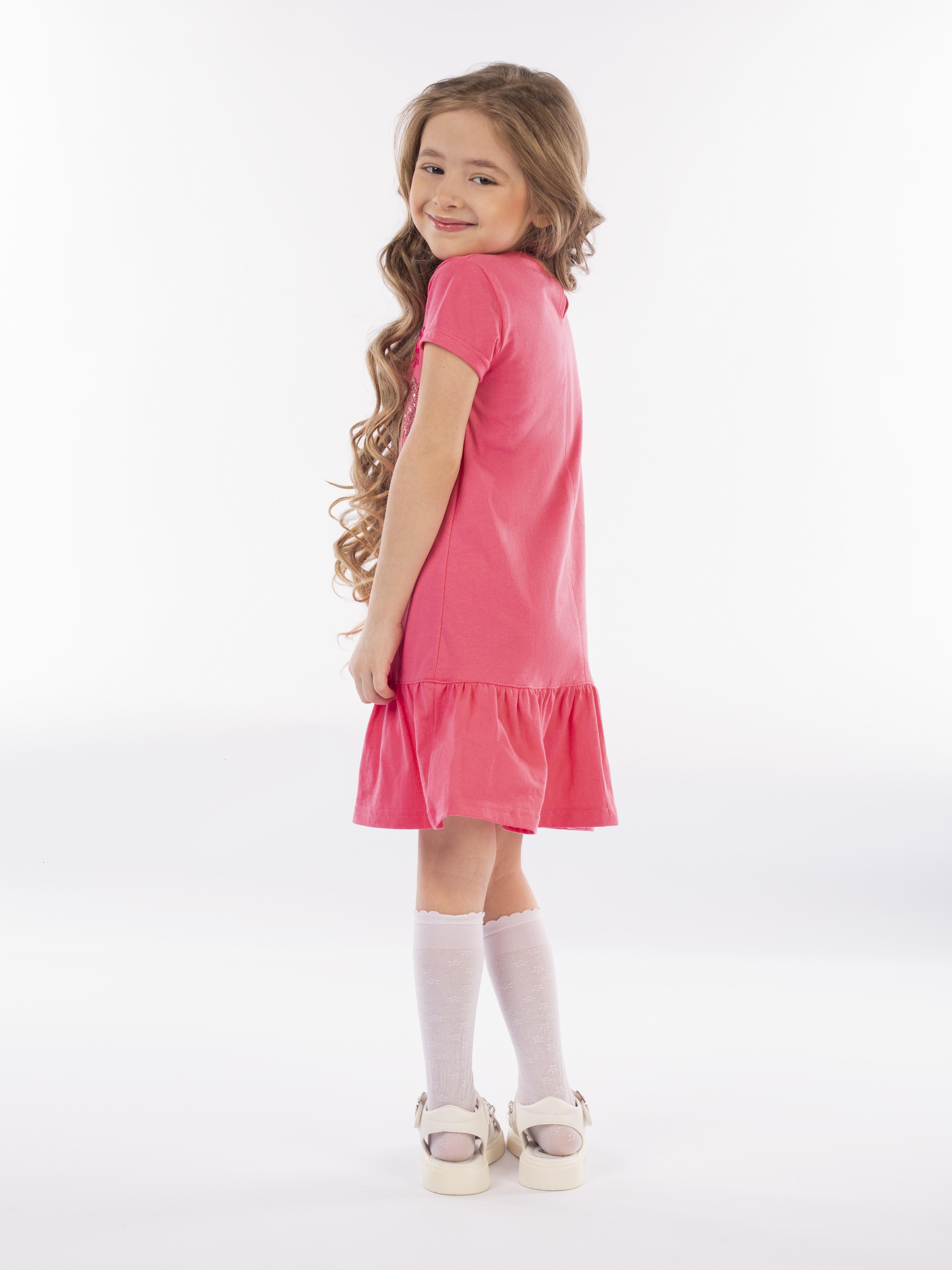 Кулирное полотно: 100% х/б. Платье-силуэт трапеция,короткий рукав,внизу волан.Печать и вышивка(пайетки) на переде.Горловина окантована.застежка по спинке на пуговицу.Ярлык на спинке.