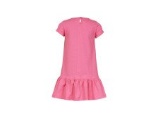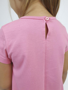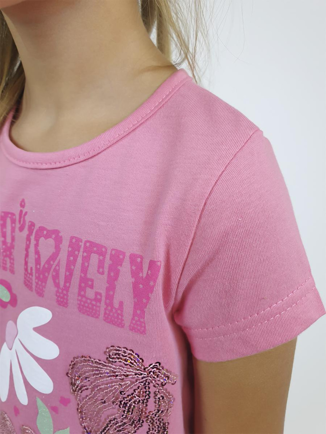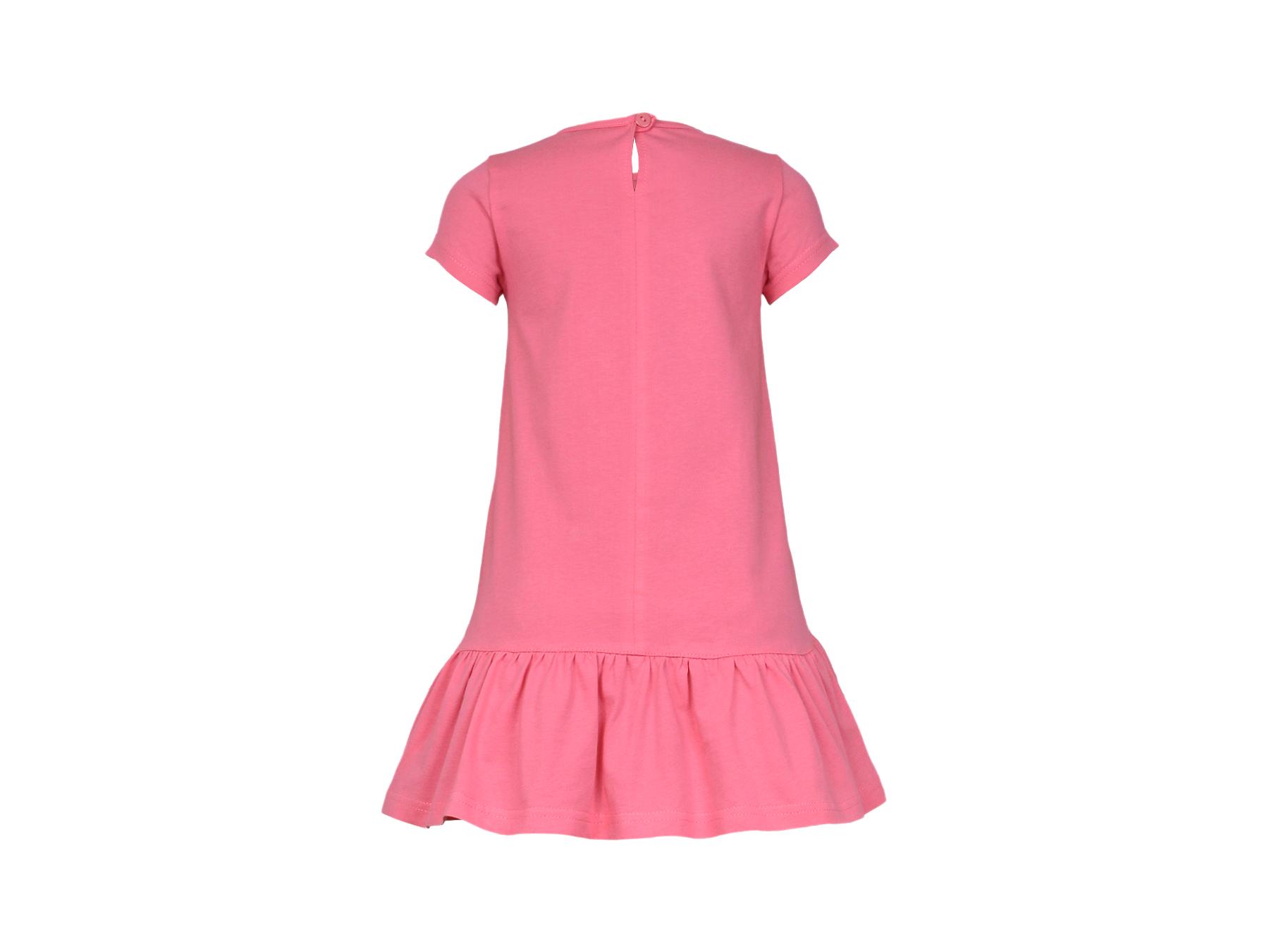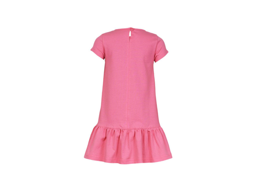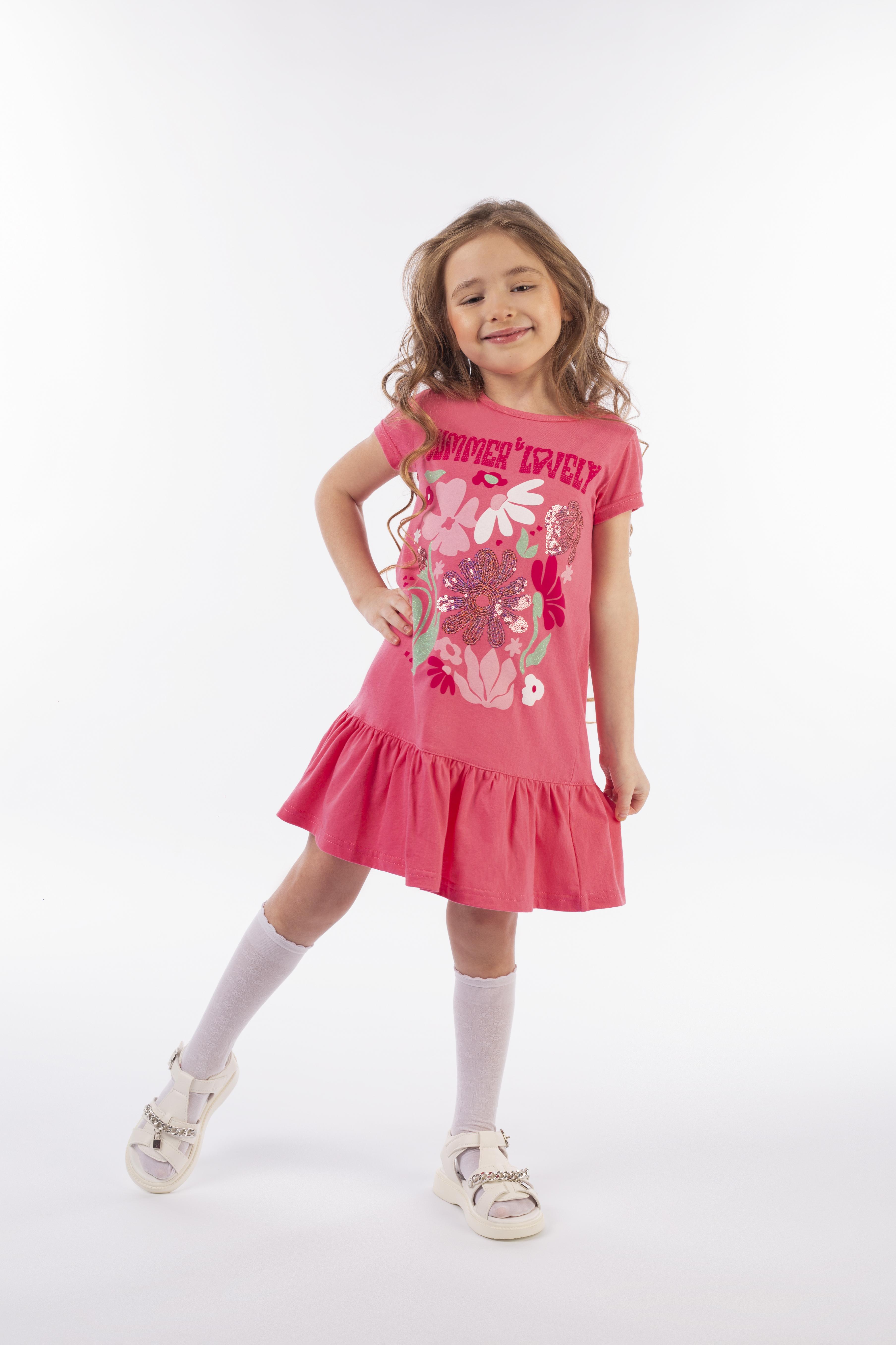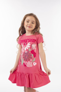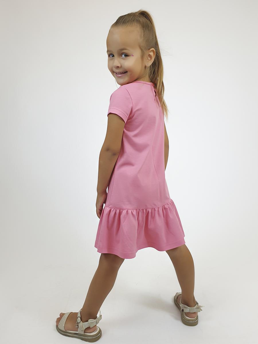 Кулирное полотно: 100% х/б. Платье-силуэт трапеция,короткий рукав,внизу волан.Печать и вышивка(пайетки) на переде.Горловина окантована.застежка по спинке на пуговицу.Ярлык на спинке.