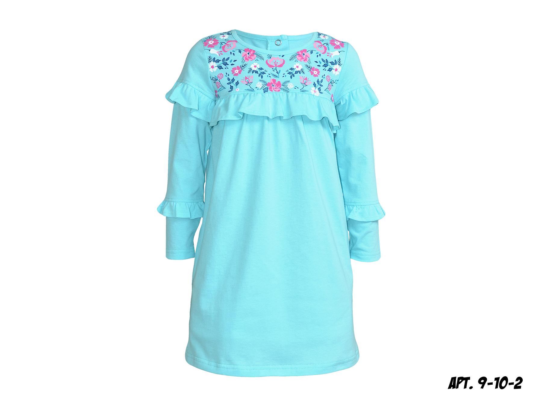 Трикотажное полотно:100% х/б.Платье-силуэт трапеция, втачной длинный рукв с рюшами. Перед с кокеткой, печатью и рюшей из под кокетки. Застежка по спинке-планка с кнопками. Горловина окантована.
