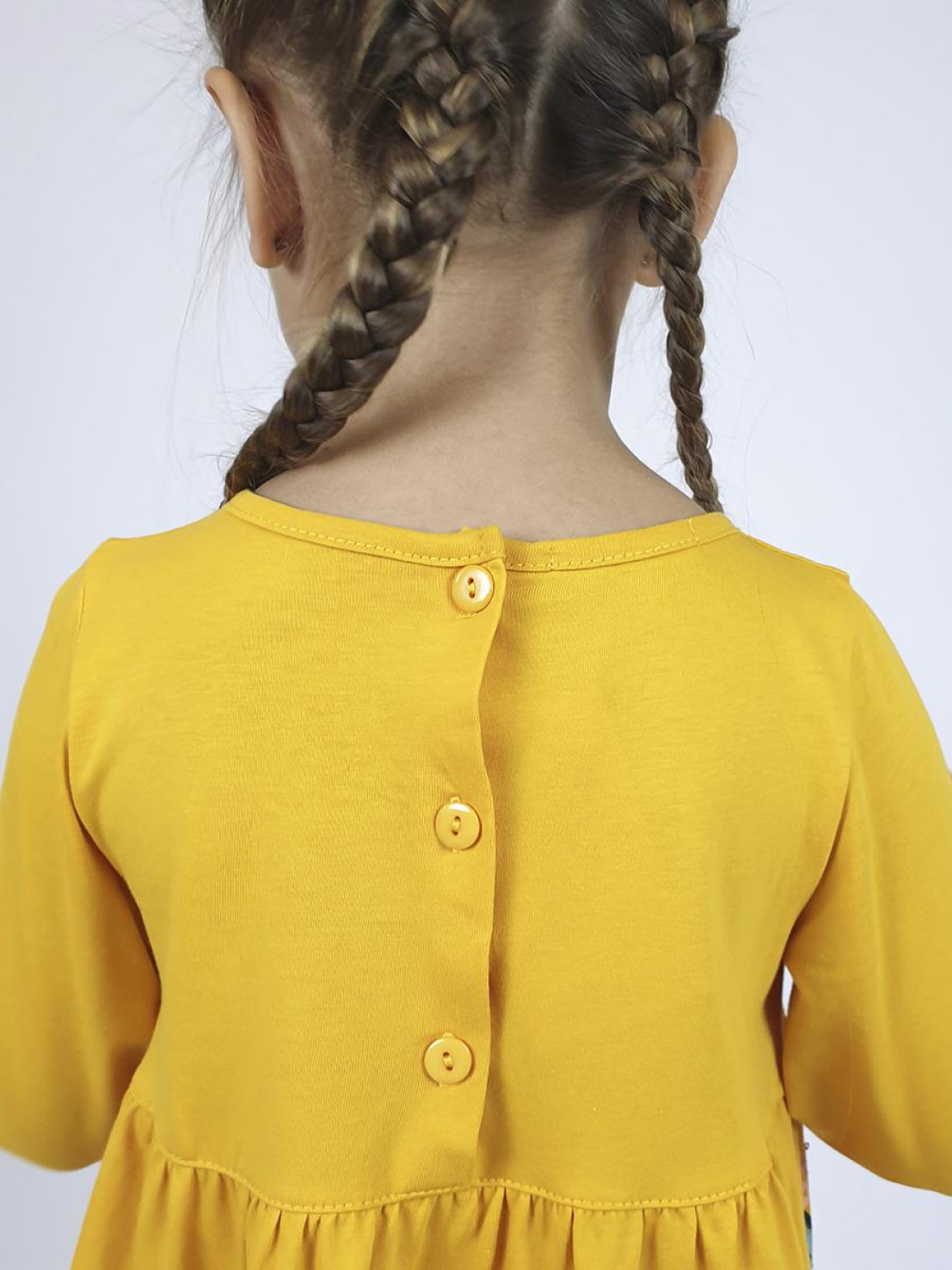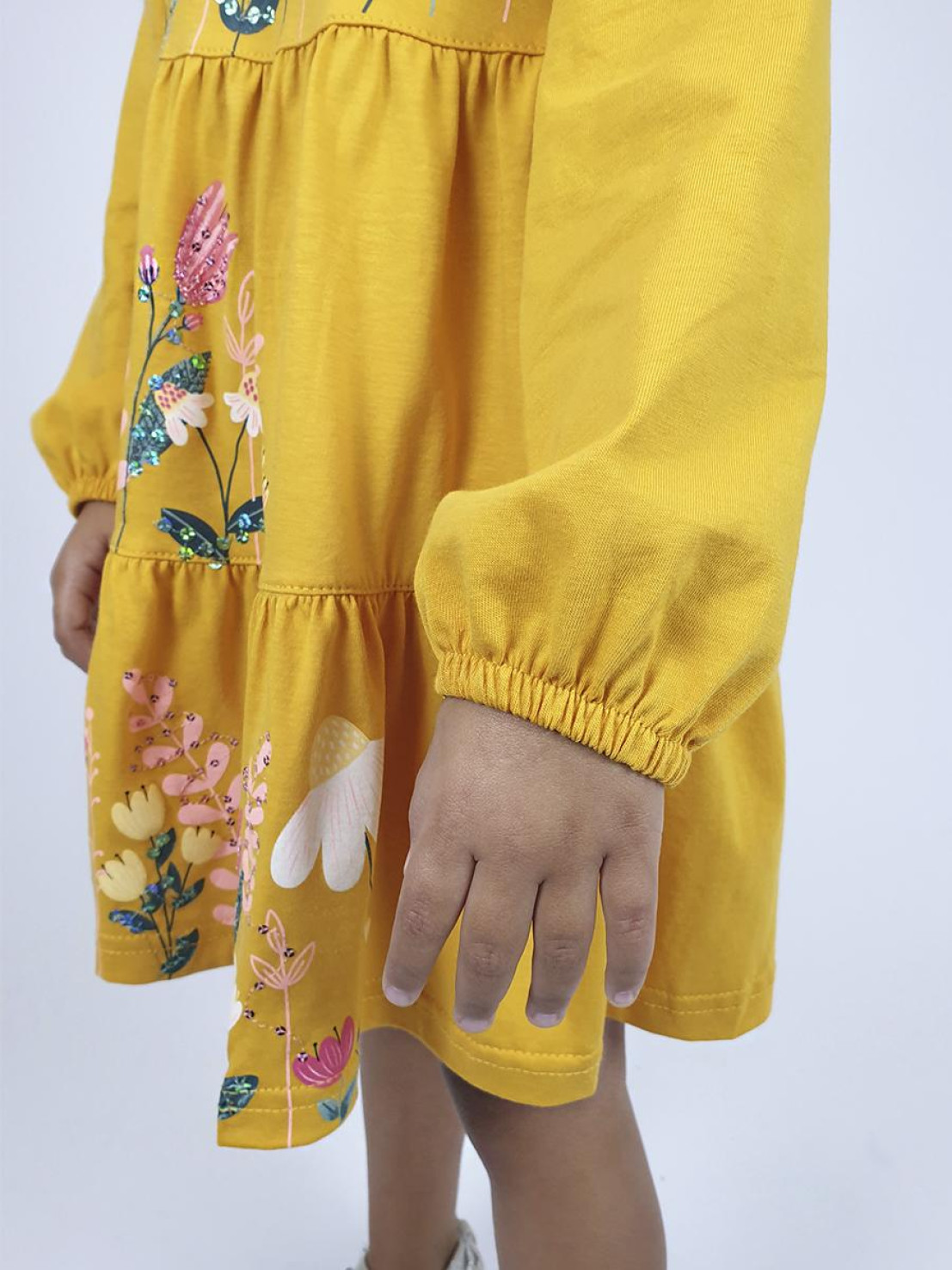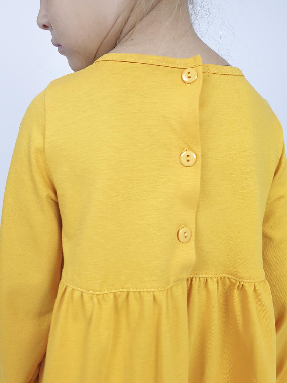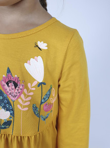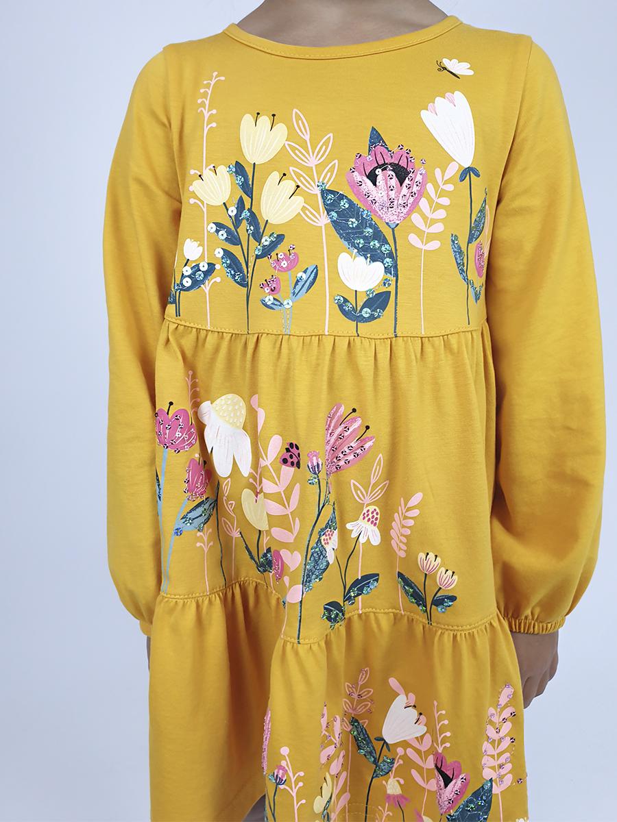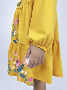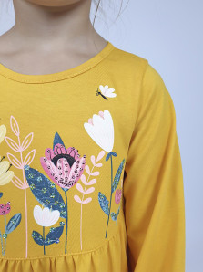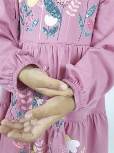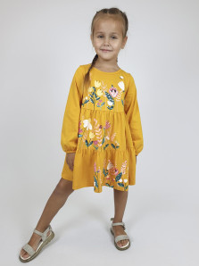 Кулирное полотно:100%х/б. Платье-силуэт трапеция,длинный втачной рукав внизу собран на резинку.Юбка переда и спинки из двух воланов.Горловина окантована,застежка на пуговицы по спинке.Печать и вышивка(пайетки) на переде-кокетки,среднего и нижнего воланов.
