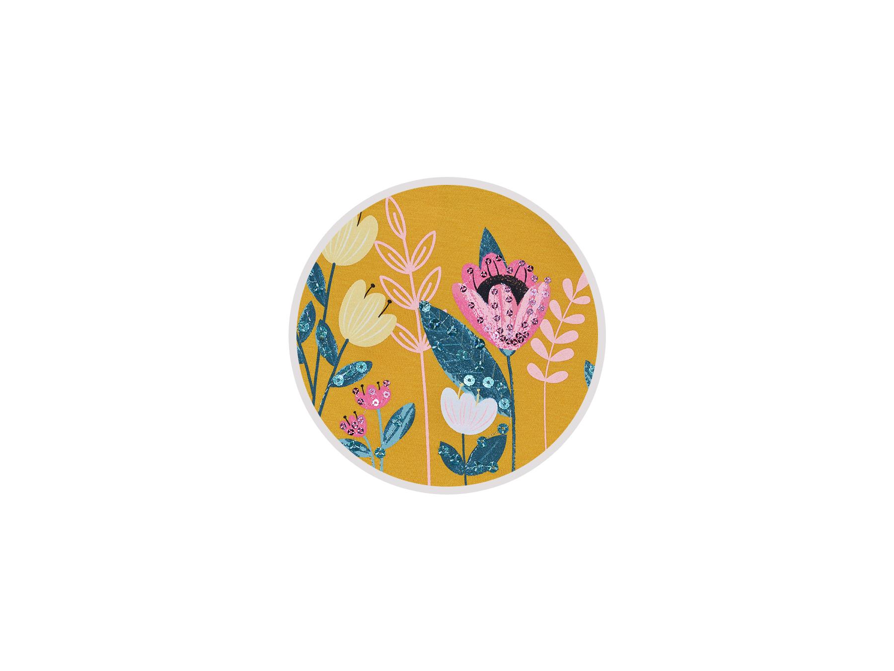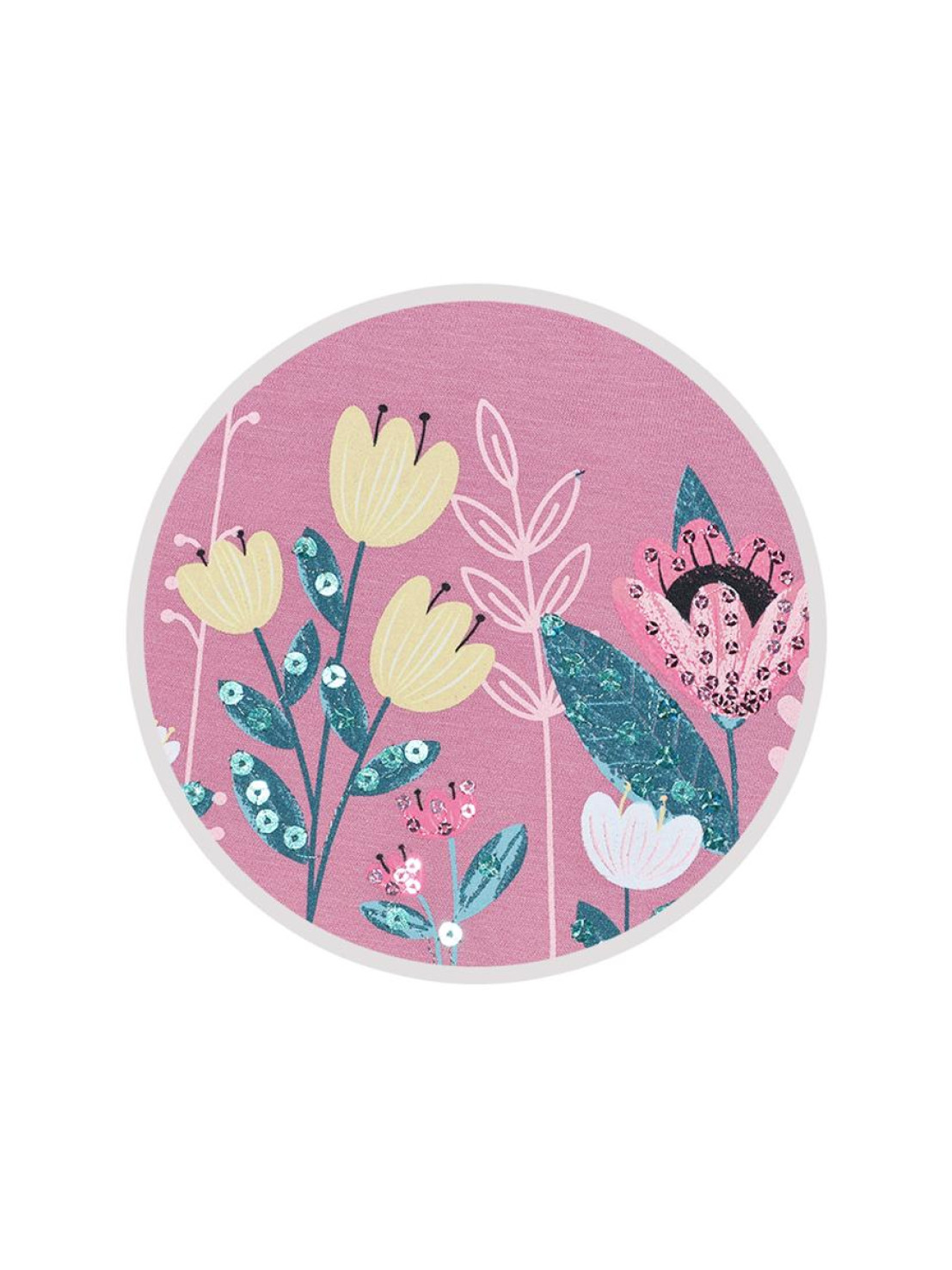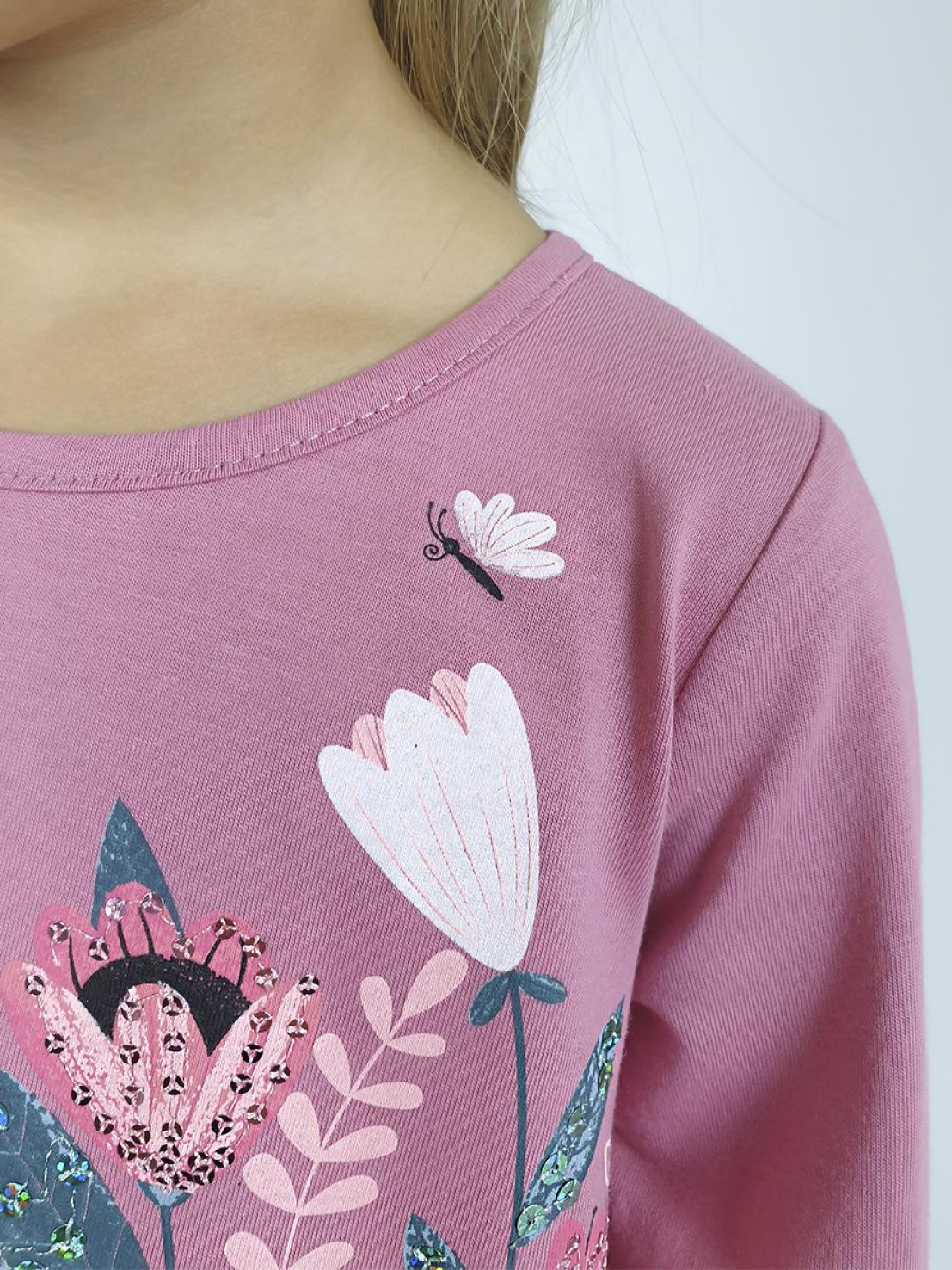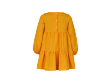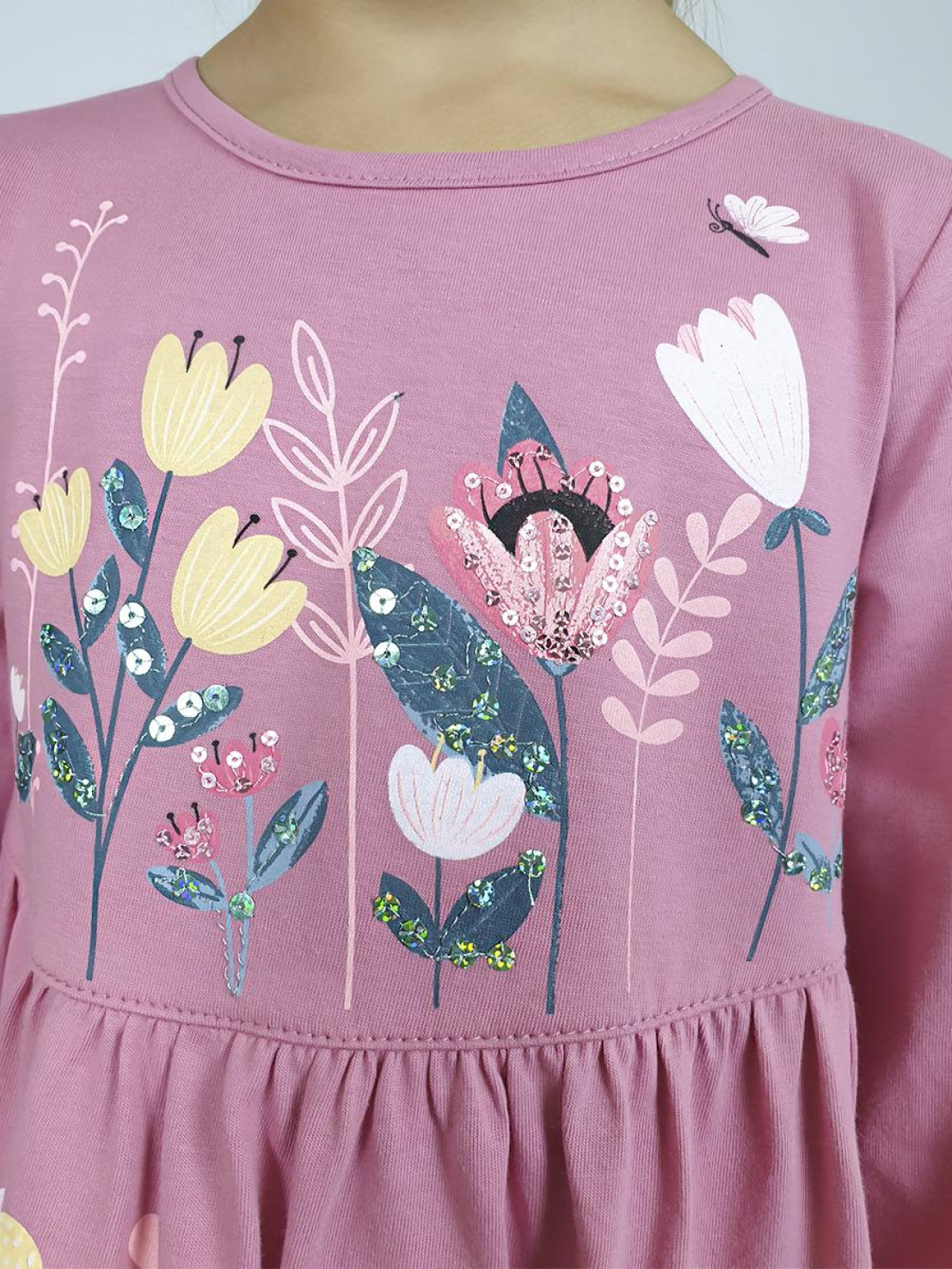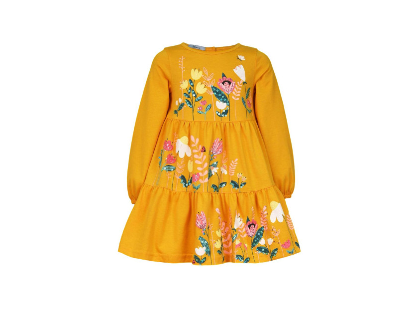 Кулирное полотно:100%х/б. Платье-силуэт трапеция,длинный втачной рукав внизу собран на резинку.Юбка переда и спинки из двух воланов.Горловина окантована,застежка на пуговицы по спинке.Печать и вышивка(пайетки) на переде-кокетки,среднего и нижнего воланов.