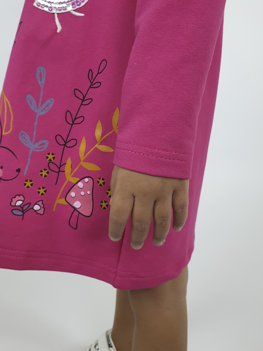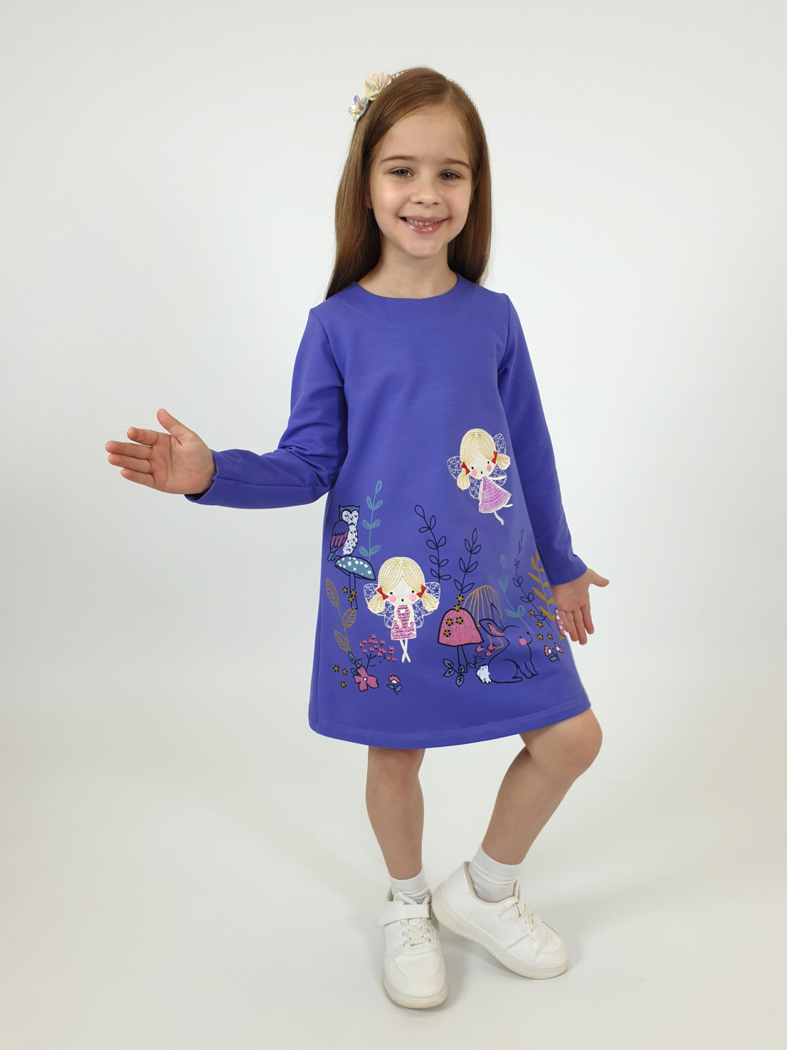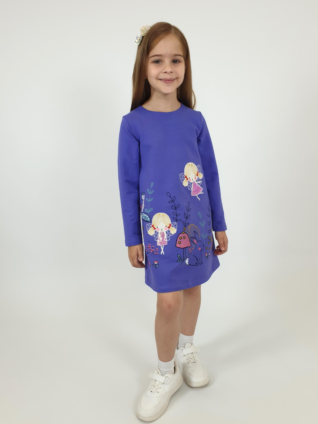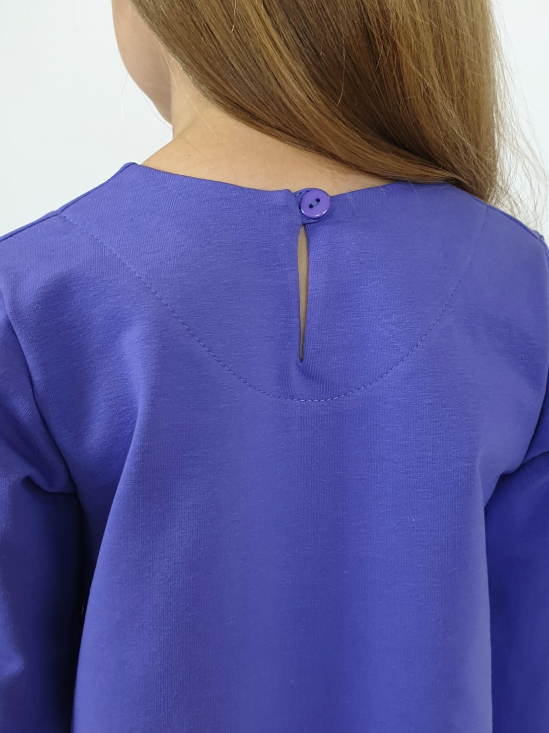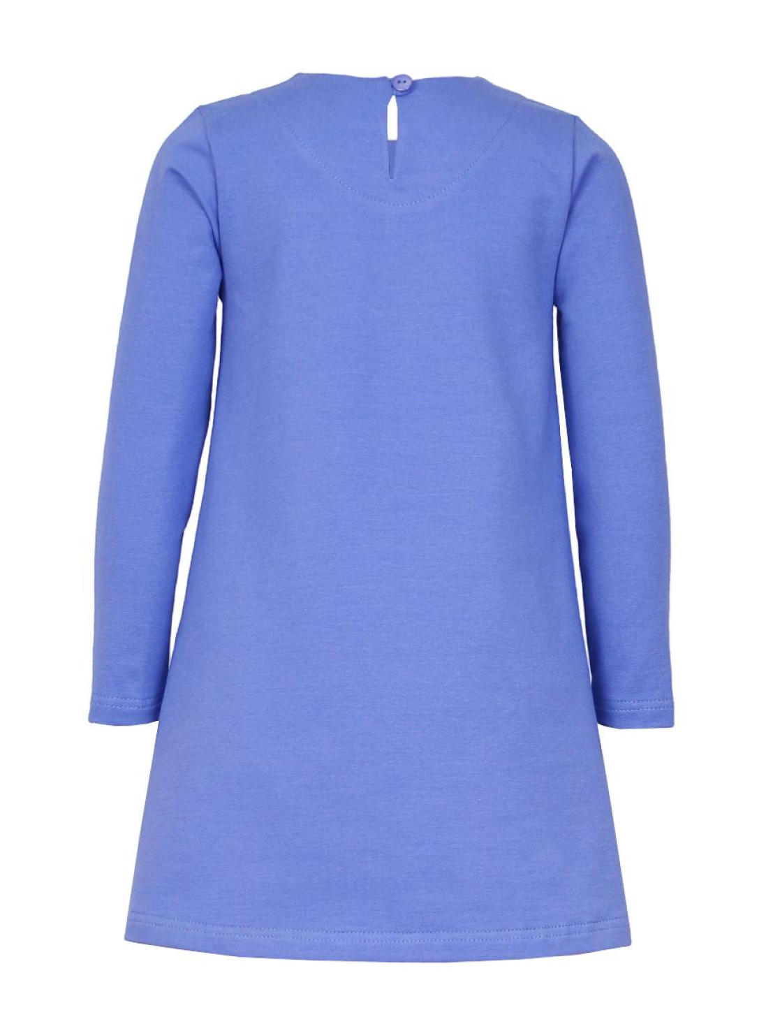Футер 2-х нитка:97% х/б,3% лайкра. Платье-силуэт трапеция,без воротника,застежка на пуговицу по спинке.Втачной,длинный рукав.Печать и вышивка аппликация(пайетки) на полочке.