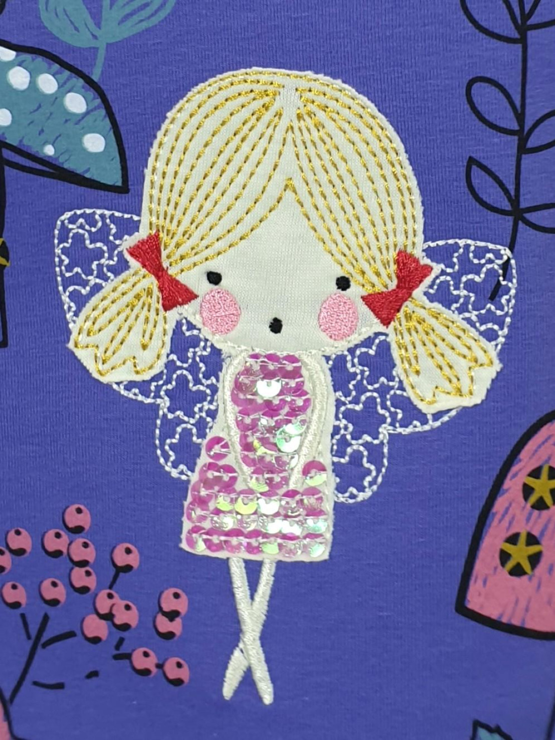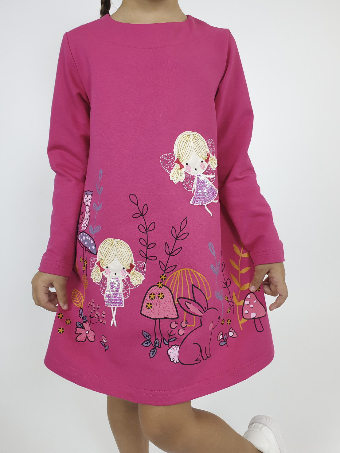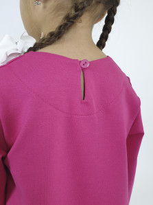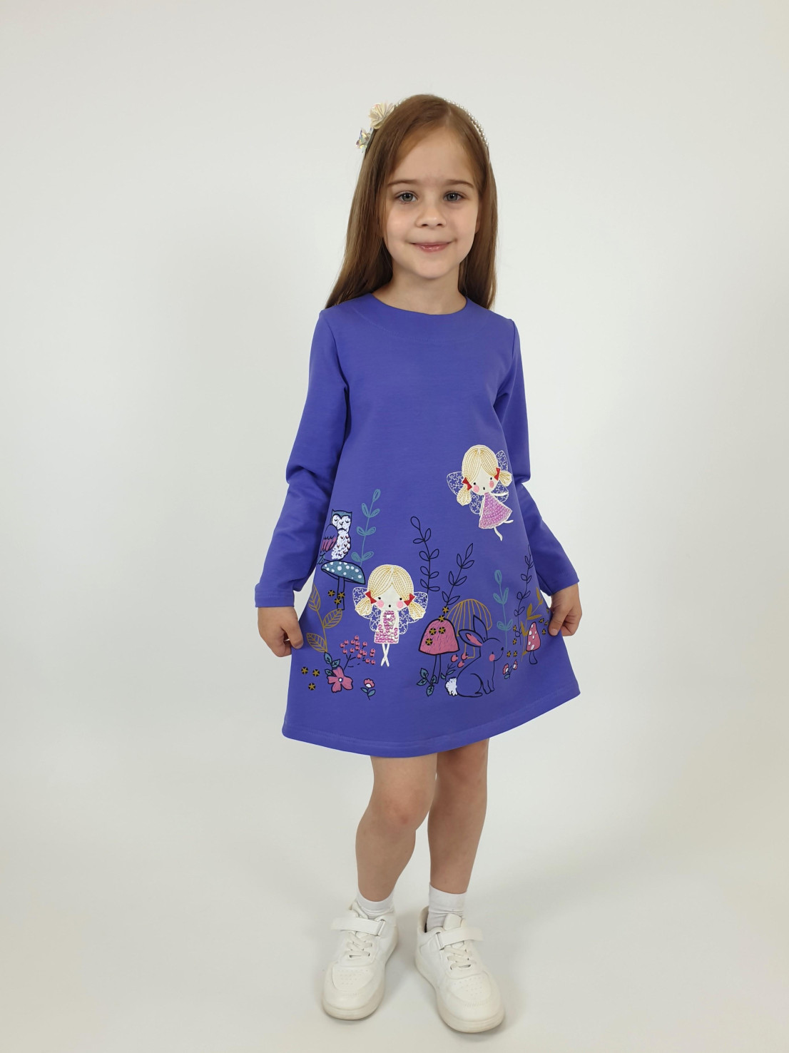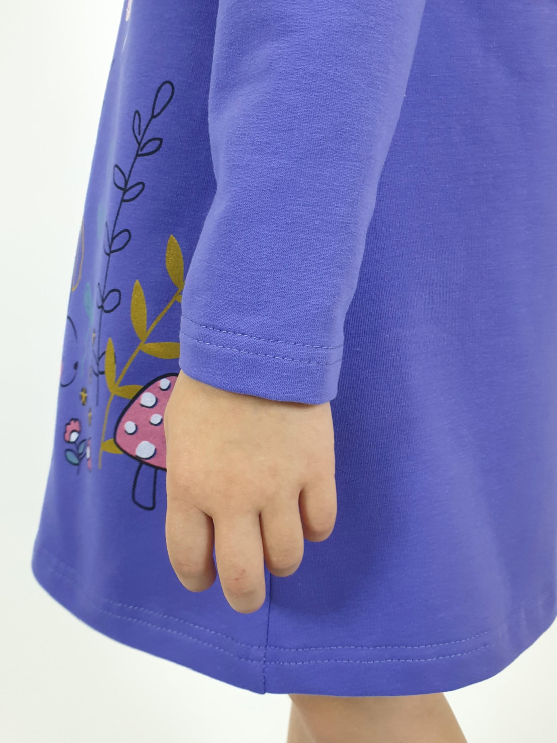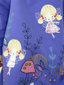 Футер 2-х нитка:97% х/б,3% лайкра. Платье-силуэт трапеция,без воротника,застежка на пуговицу по спинке.Втачной,длинный рукав.Печать и вышивка аппликация(пайетки) на полочке.