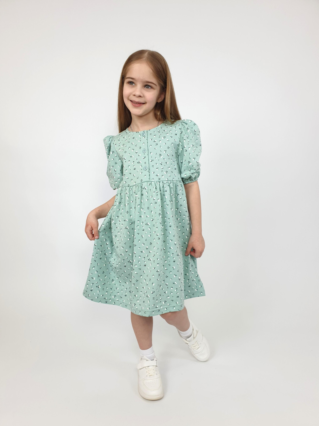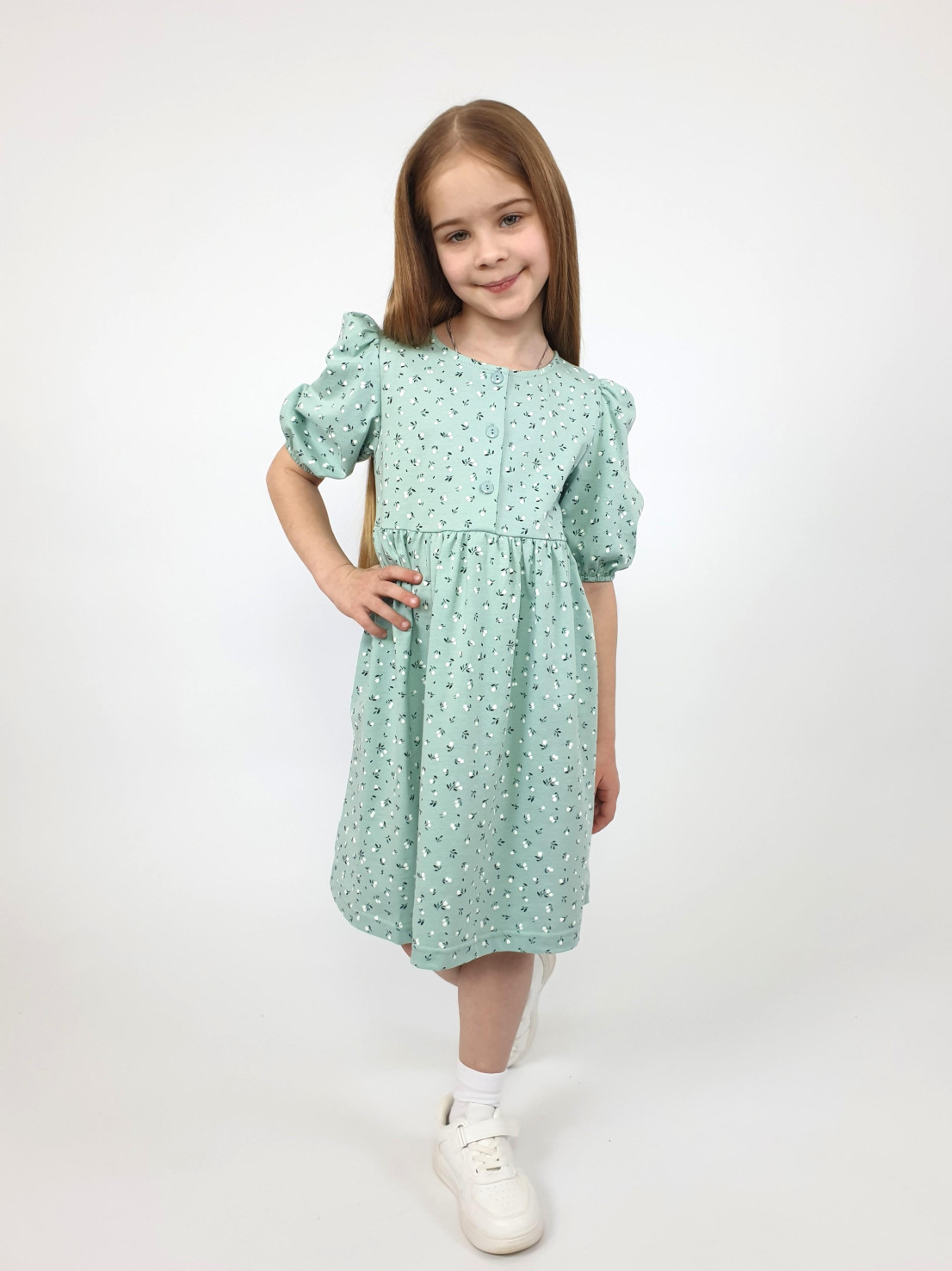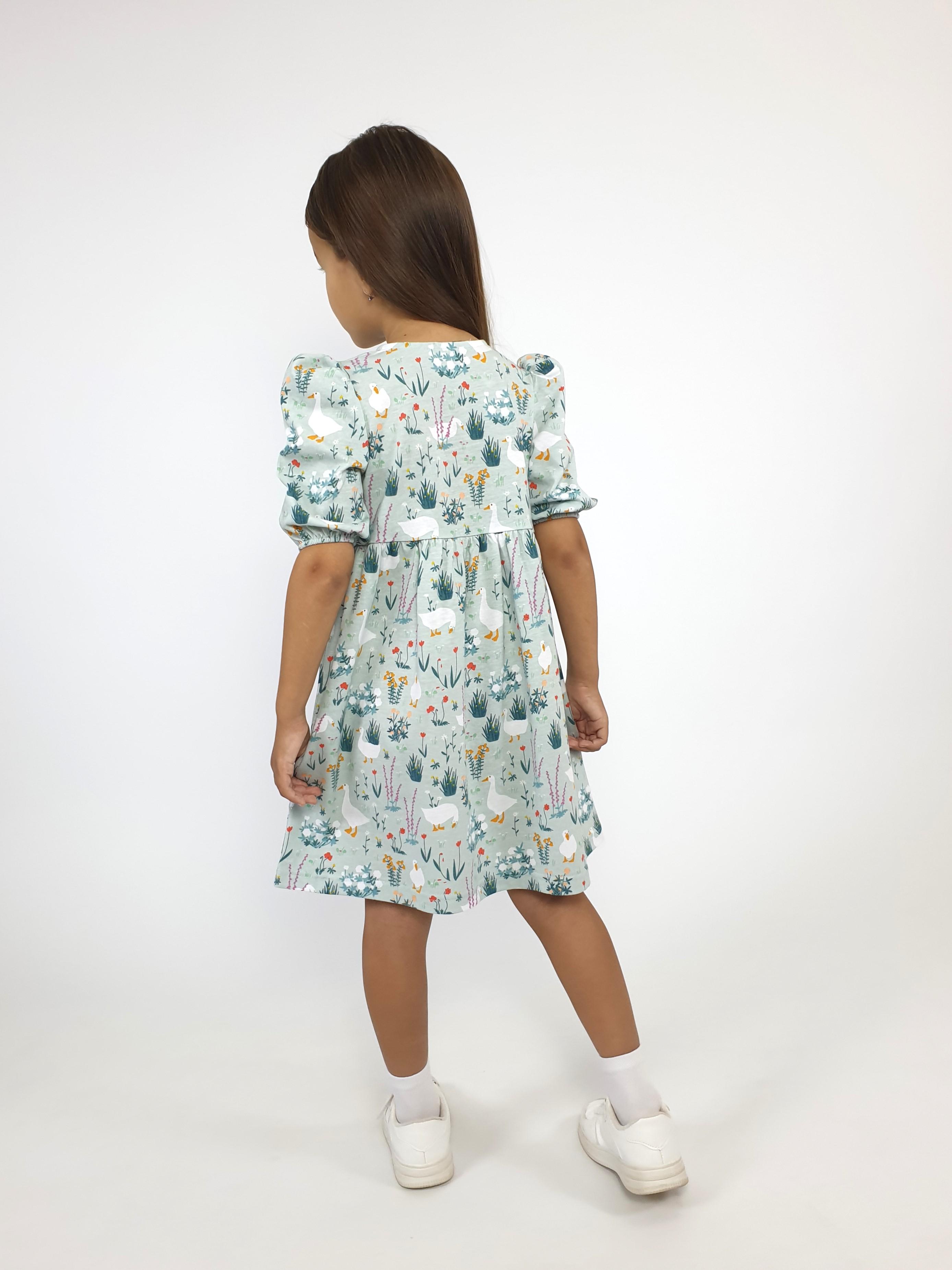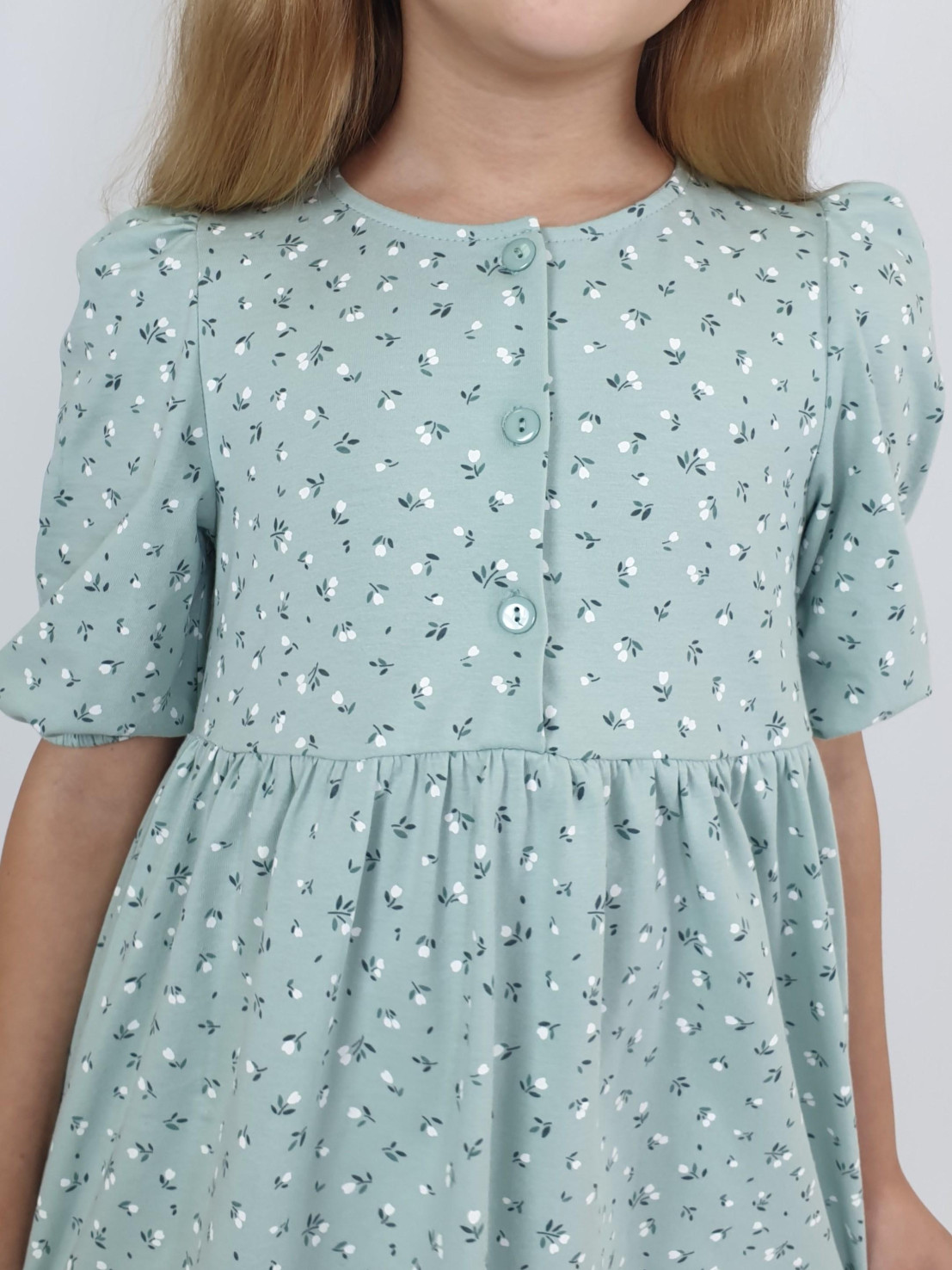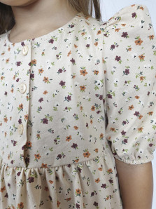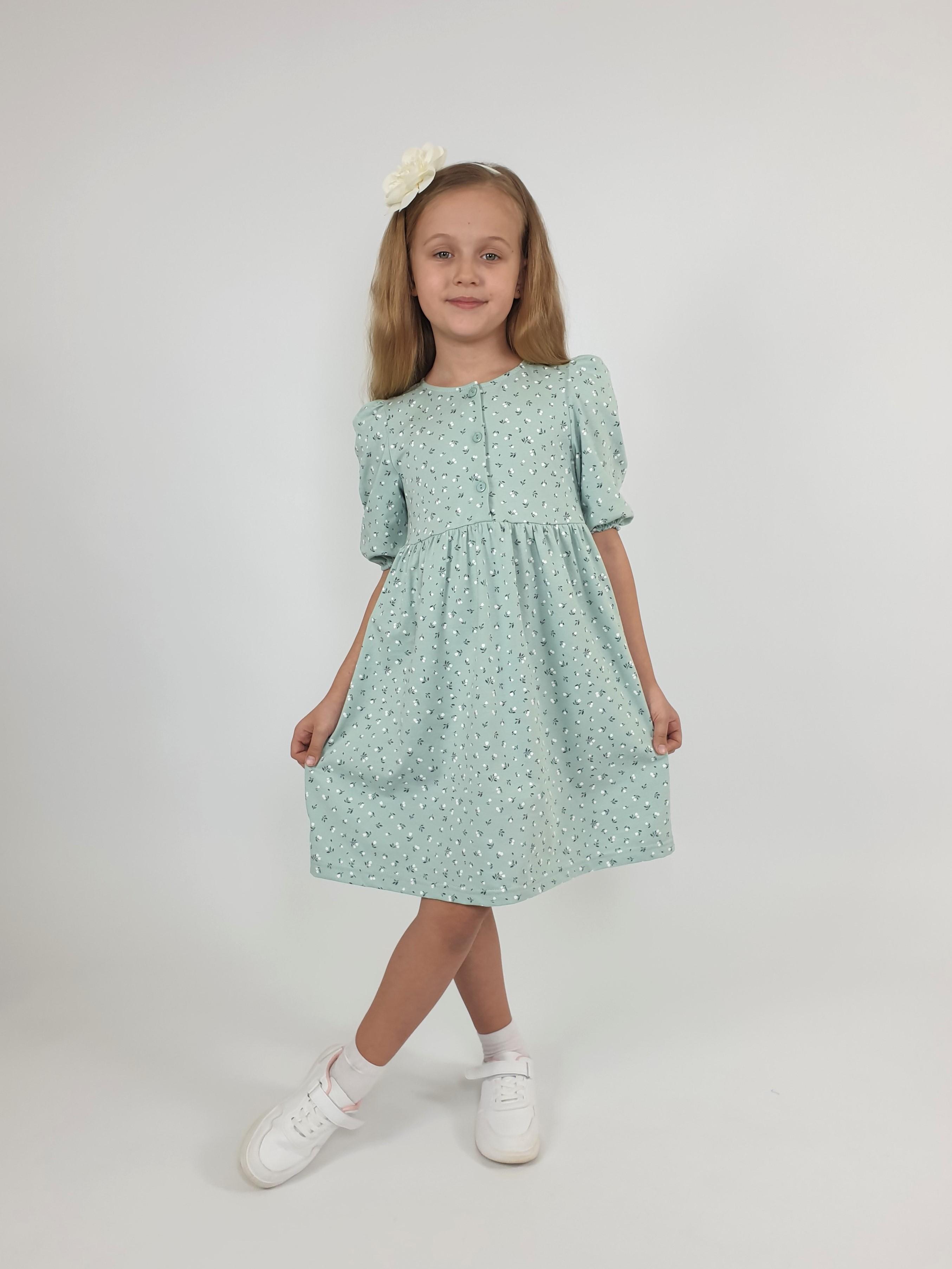 Кулирное полотно (набивка): 100% х/б. Платье-с отрезной юбкой в сборку.Короткий рукав с резинкой внизу,сборка по окату.Горловина окантована и подшита,застежка центральная на пуговицы.