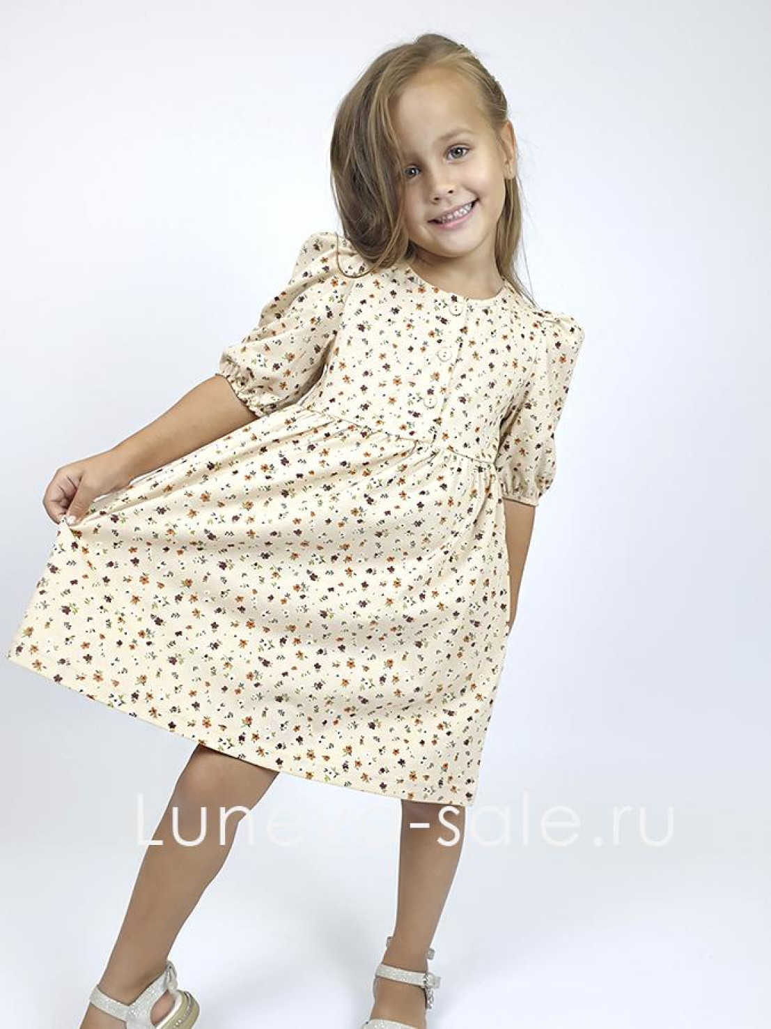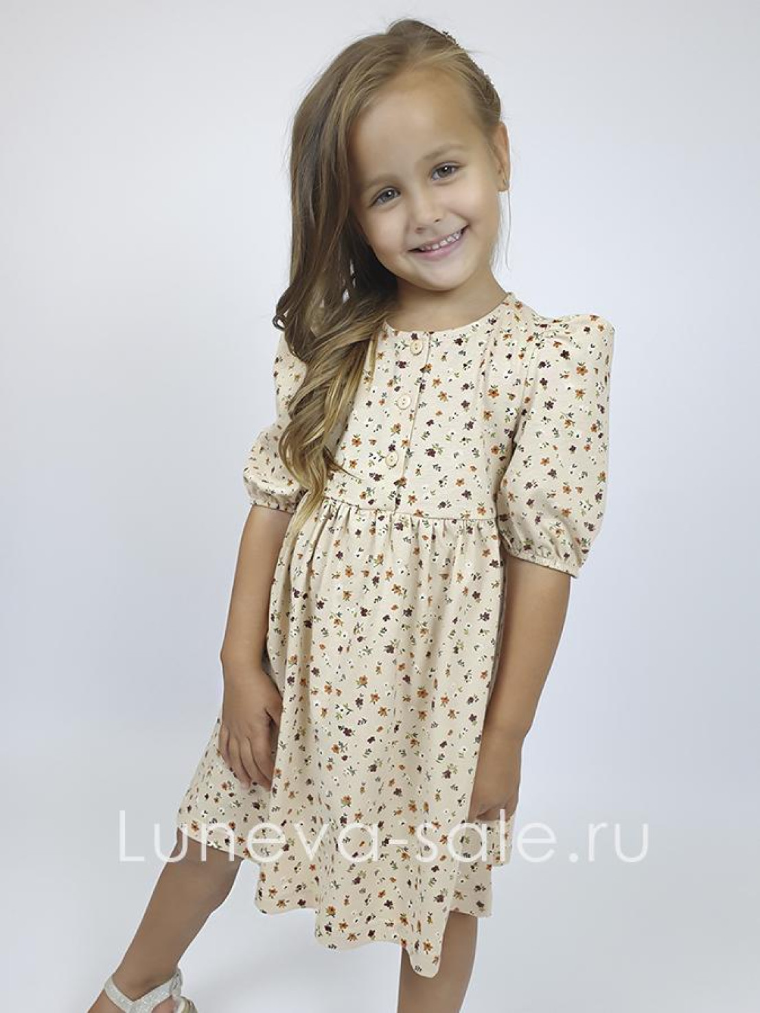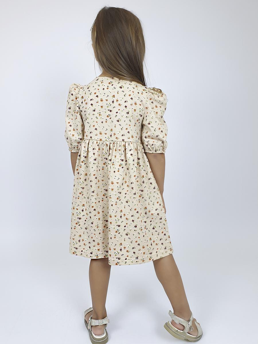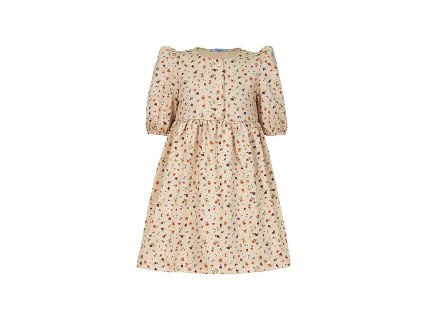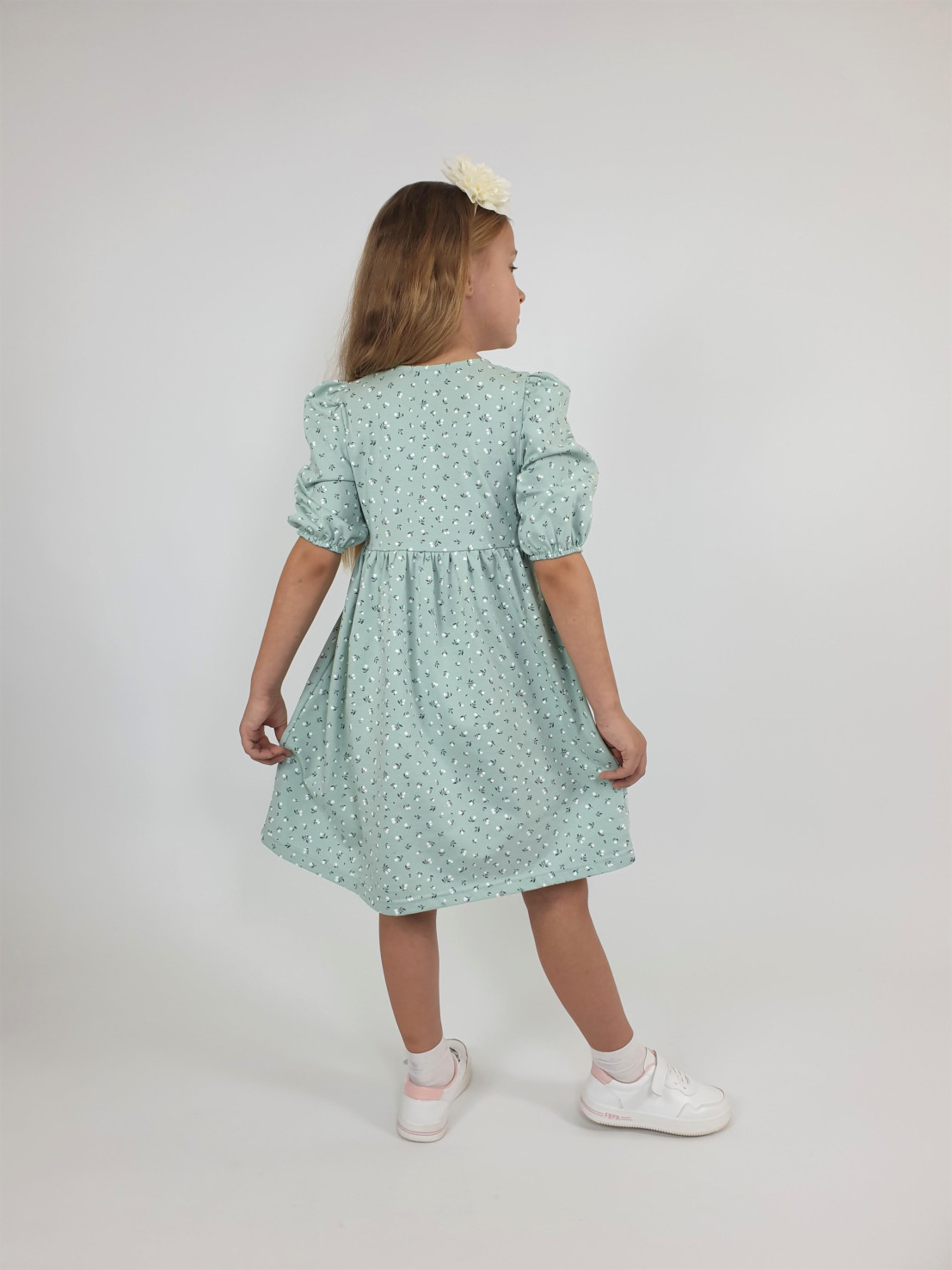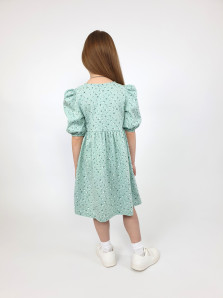 Кулирное полотно (набивка): 100% х/б. Платье-с отрезной юбкой в сборку.Короткий рукав с резинкой внизу,сборка по окату.Горловина окантована и подшита,застежка центральная на пуговицы.