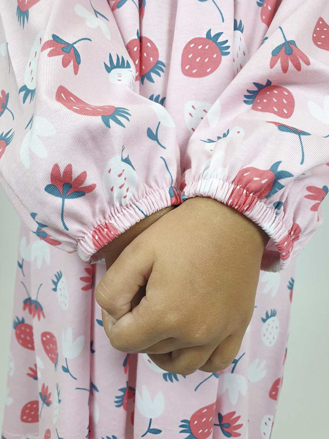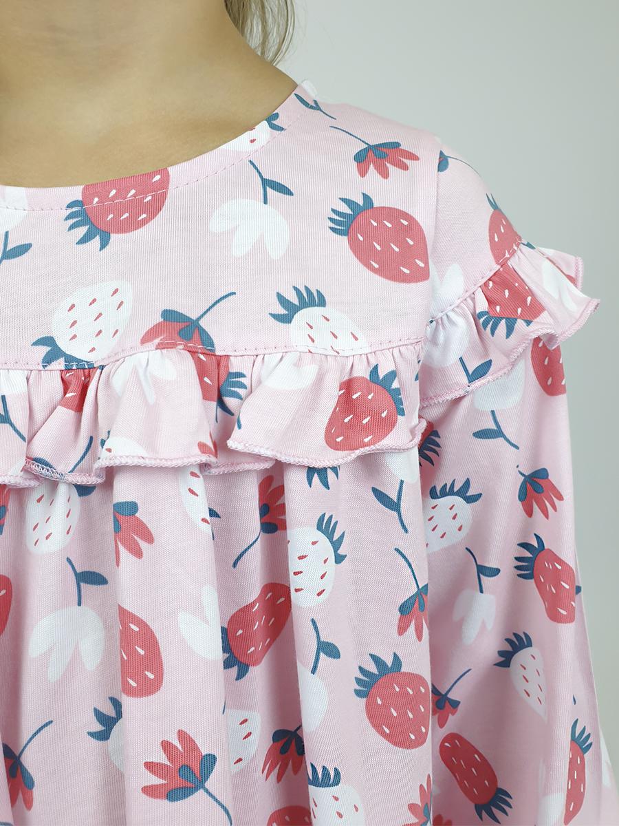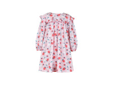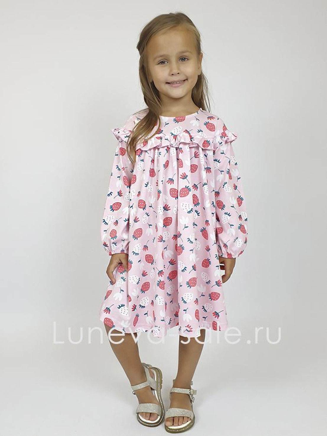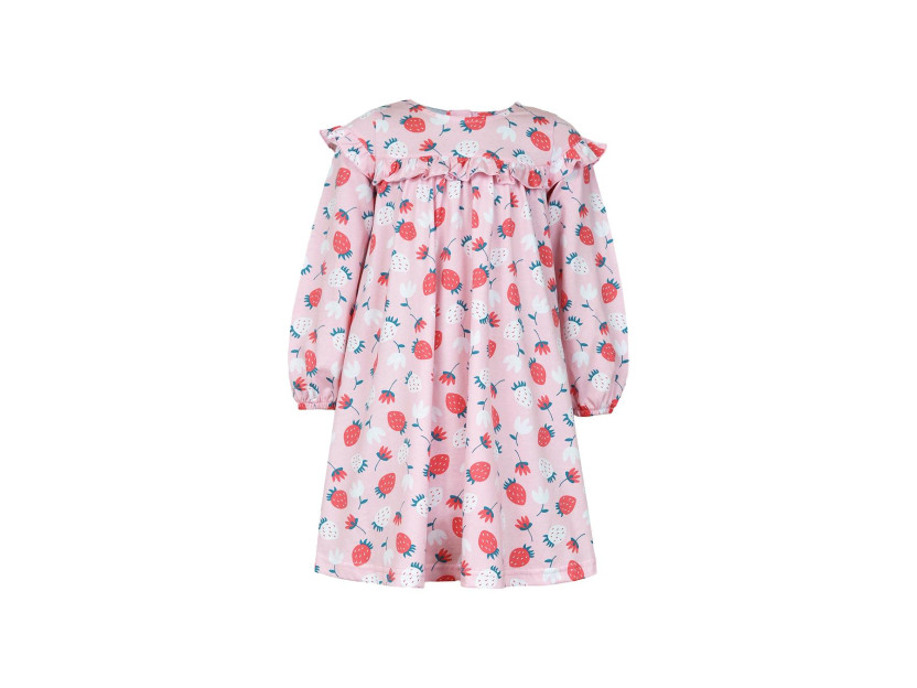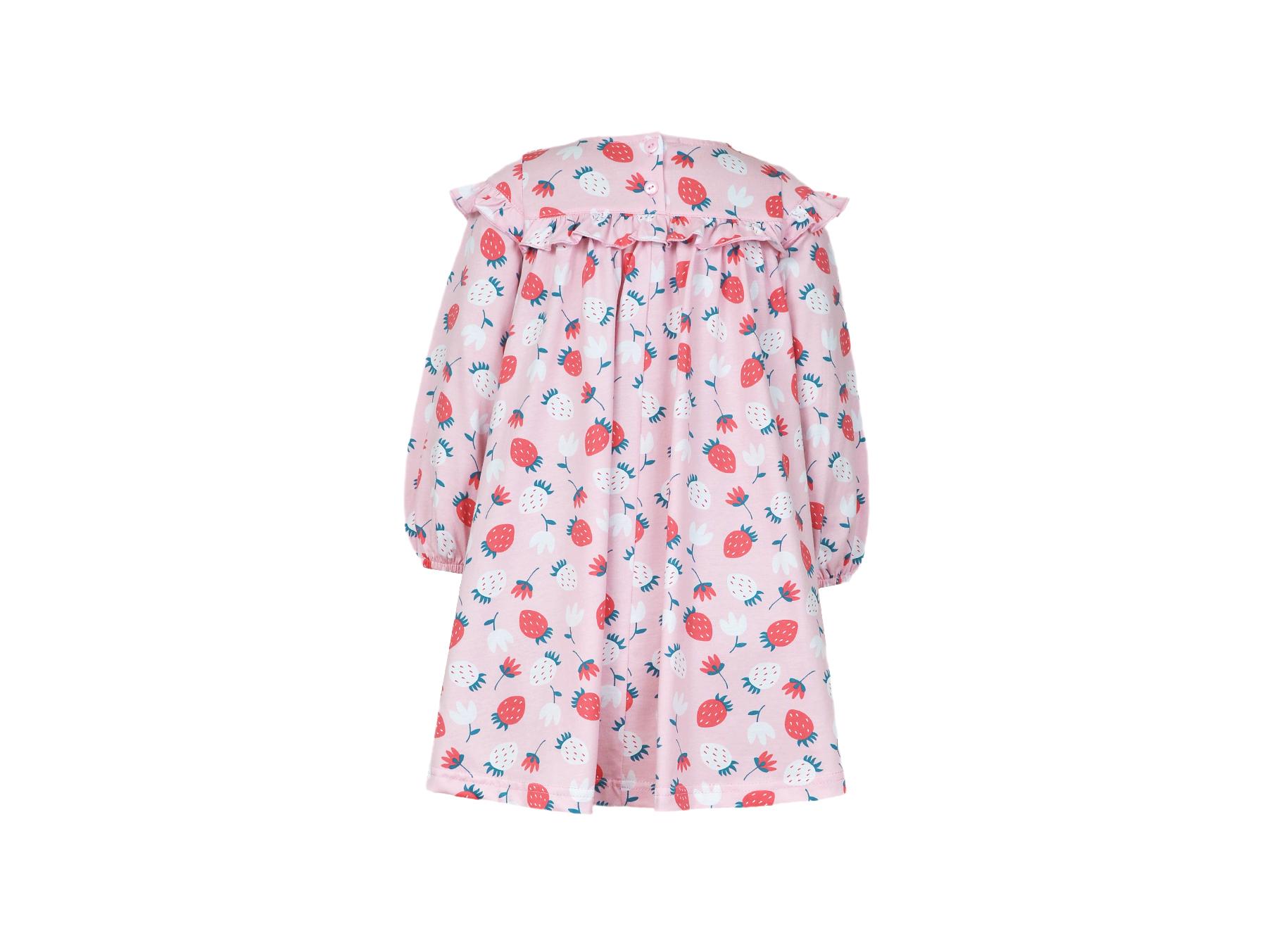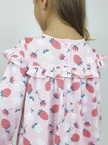 Кулирное полотно:100% х/б. Платье-силуэт трапеция,кокетка переда,спинки с рюшей.Юбка со сборкой.Рукав длинный из двух частей с рюшей,внизу на резинке.Горловина окантована и подшита.Застежка по спинке на пуговицу.