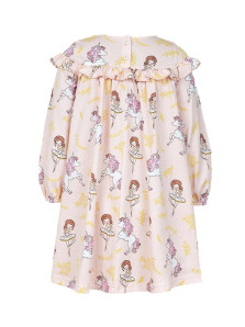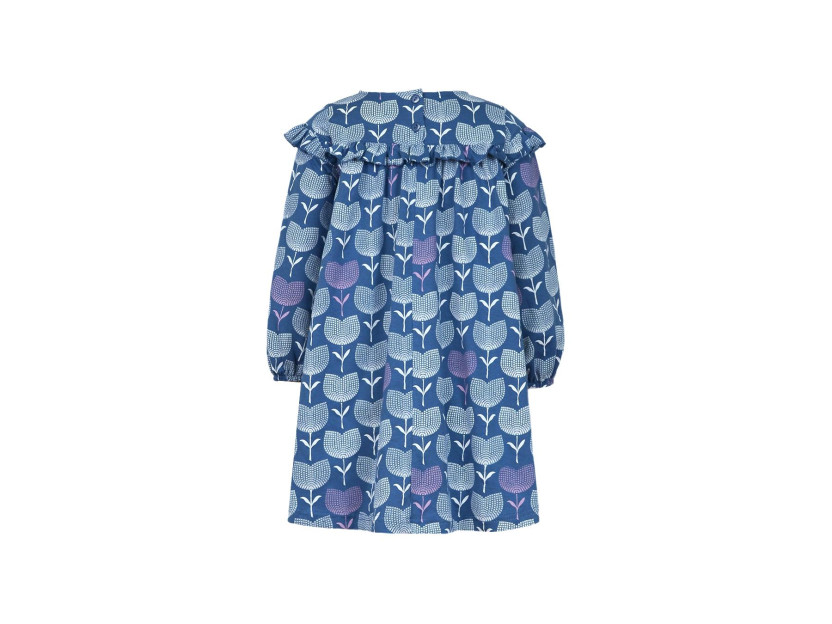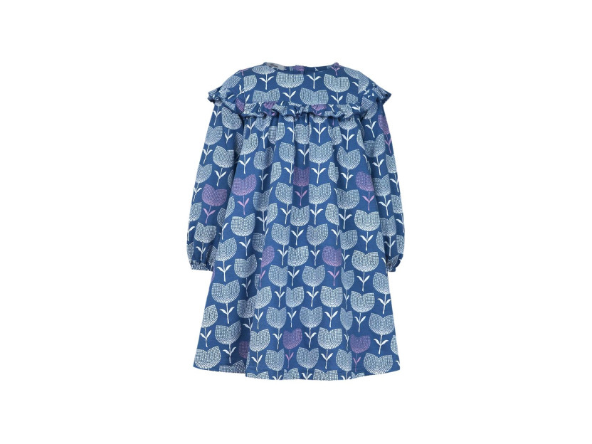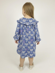 Кулирное полотно:100% х/б. Платье-силуэт трапеция,кокетка переда,спинки с рюшей.Юбка со сборкой.Рукав длинный из двух частей с рюшей,внизу на резинке.Горловина окантована и подшита.Застежка по спинке на пуговицу.