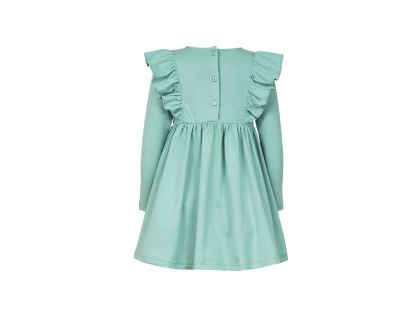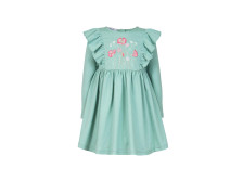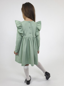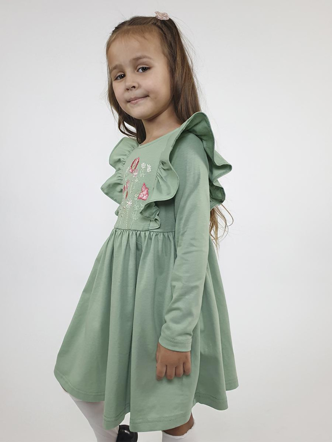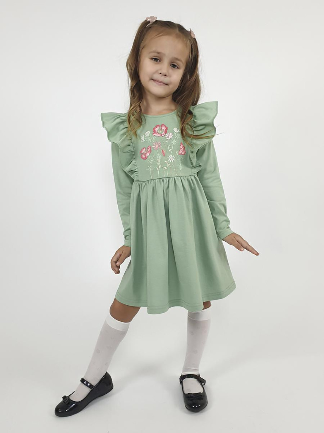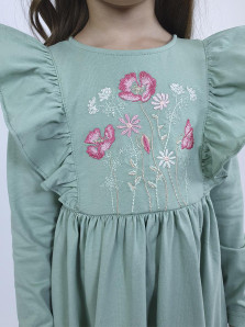 Кулирное полотно:100%х/б. Платье-полуприлегающего силуэта,длинный рукав.Отрезная юбка со сборкой,рельефы с рюшей.Вышивка на центральной части переда.Горловина окантована и подшита,застежка сзади на пуговицы.