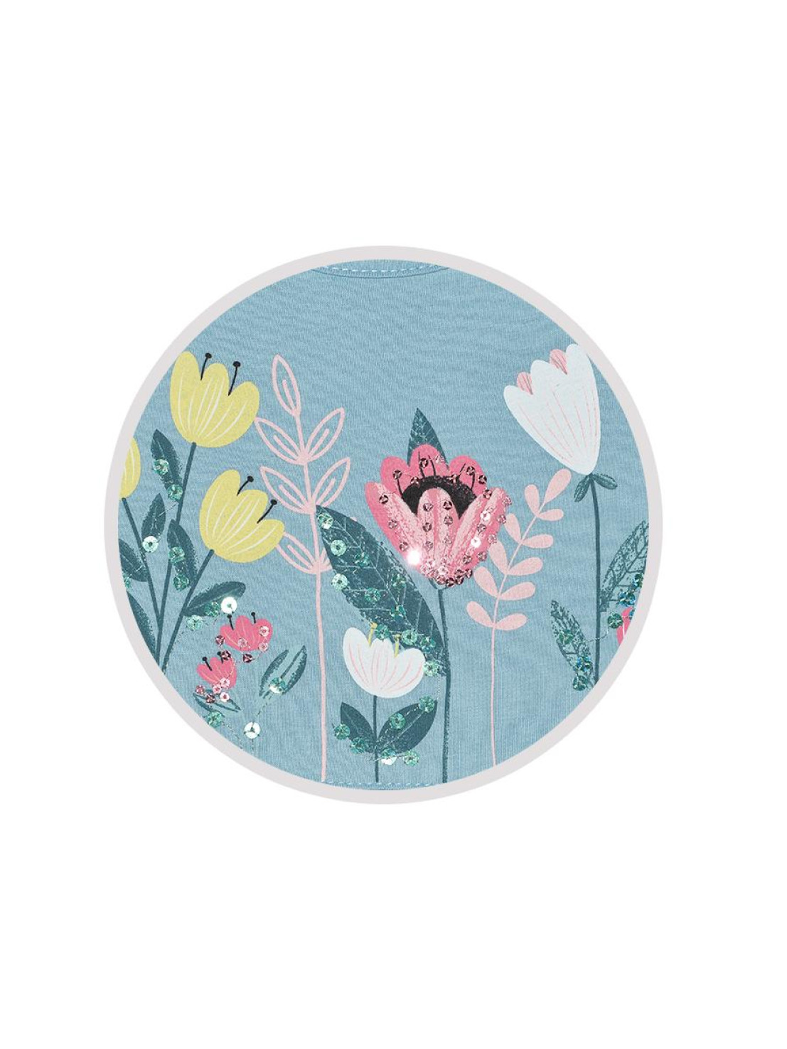 Кулирное полотно:100%х/б. Платье-силуэт трапеция,длинный втачной рукав внизу собран на резинку.Юбка переда и спинки из двух воланов.Горловина окантована,застежка на пуговицы по спинке.Печать и вышивка(пайетки) на переде-кокетки,среднего и нижнего воланов.
